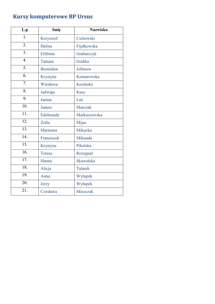 Kursy komputerowe BP Ursus Imię L.p Nazwisko 1. Krzysztof Cichowski 2. Halina Fijałkowska 3. Elżbieta Grabarczyk 4. Tamara Grabka 5. Bronisław Jefimow 6. Krystyna Komarowska 7. Wiesława Kozińska 8. Jadwiga Kusy 9. Janina Luś 10. Janusz Marczak 11. Edeltrauda Markuszewska 12. Zofia Mijas 13. Marianna Mikucka 14. Franciszek Mikunda 15. Krystyna Pikulska 16. Teresa Rozegnał 17. Hanna Skawińska 18. Alicja Talarek 19. Anna Wyłupek 20. Jerzy Wyłupek 21. Czesława Miszczuk