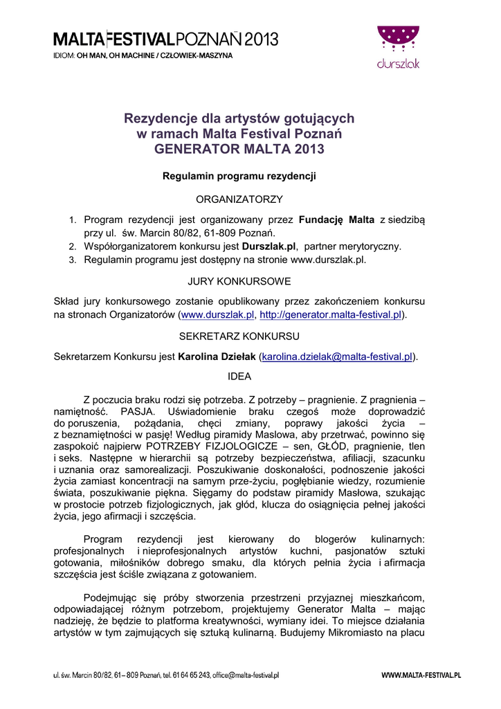 Rezydencje dla artystów gotujących w ramach Malta Festival Poznań GENERATOR MALTA 2013 Regulamin programu rezydencji ORGANIZATORZY 1. Program rezydencji jest organizowany przez Fundację Malta z siedzibą przy ul. św. Marcin 80/82, 61-809 Poznań. 2. Współorganizatorem konkursu jest Durszlak.pl, partner merytoryczny. 3. Regulamin programu jest dostępny na stronie www.durszlak.pl. JURY KONKURSOWE Skład jury konkursowego zostanie opublikowany przez zakończeniem konkursu na stronach Organizatorów (www.durszlak.pl, http://generator.malta-festival.pl). SEKRETARZ KONKURSU Sekretarzem Konkursu jest Karolina Dziełak ([email protected]). IDEA Z poczucia braku rodzi się potrzeba. Z potrzeby – pragnienie. Z pragnienia – namiętność. PASJA. Uświadomienie braku czegoś może doprowadzić do poruszenia, pożądania, chęci zmiany, poprawy jakości życia – z beznamiętności w pasję! Według piramidy Maslowa, aby przetrwać, powinno się zaspokoić najpierw POTRZEBY FIZJOLOGICZE – sen, GŁÓD, pragnienie, tlen i seks. Następne w hierarchii są potrzeby bezpieczeństwa, afiliacji, szacunku i uznania oraz samorealizacji. Poszukiwanie doskonałości, podnoszenie jakości życia zamiast koncentracji na samym prze-życiu, pogłębianie wiedzy, rozumienie świata, poszukiwanie piękna. Sięgamy do podstaw piramidy Masłowa, szukając w prostocie potrzeb fizjologicznych, jak głód, klucza do osiągnięcia pełnej jakości życia, jego afirmacji i szczęścia. Program rezydencji jest kierowany do blogerów kulinarnych: profesjonalnych i nieprofesjonalnych artystów kuchni, pasjonatów sztuki gotowania, miłośników dobrego smaku, dla których pełnia życia i afirmacja szczęścia jest ściśle związana z gotowaniem. Podejmując się próby stworzenia przestrzeni przyjaznej mieszkańcom, odpowiadającej różnym potrzebom, projektujemy Generator Malta – mając nadzieję, że będzie to platforma kreatywności, wymiany idei. To miejsce działania artystów w tym zajmujących się sztuką kulinarną. Budujemy Mikromiasto na placu Wolności, czyli miejsce poruszania zmysłów: smaku, zapachu, widzenia, dotykania, słuchania, a przede wszystkim współdziałania. Tu powstanie lokalna kuchnia, targ zdrowej żywności, piekarnia, 3 sceny prezentacji, muzyka i teatr. Program Rezydencyjny obejmuje kreatywną prezentację artystów gotujących w miejscu Lokal:Kuchnia, czyli przygotowanej tymczasowej sceny kulinarnej otwartej dla publiczności festiwalowej. ZADANIE 1. Aby zgłosić się do udziału w programie, należy przygotować autorskie menu złożone z co najmniej jednego przepisu na: LUNCH KOLACJĘ DESER. 2. Przepisy będą oparte na produktach sezonowych i lokalnych, dostępnych w regionie Wielkopolski na przełomie czerwca i lipca. 3. Przepisy powinny być proste i łatwe w przygotowaniu. Szacowany czas przygotowania każdej z potraw powinien wynieść nie więcej niż 30 minut. 4. Szacowany koszt przygotowania każdej z potraw powinien zamykać się w przedziale 5-25 zł. OBOWIĄZUJĄCE TERMINY 1. Nabór zgłoszeń, podczas którego zgłaszać można autorskie menu, zaczyna się 14 maja i upływa 10 czerwca. Ogłoszenie wyników nastąpi 17 czerwca. 2. Dwudniowe rezydencje Generatora Malta będą odbywały się w przedziale czasowym od 24 czerwca do 20 lipca w terminie do ustalenia z Organizatorem. WARUNKI UCZESTNICTWA W KONKURSIE 1. Program rezydencji jest kierowany do pasjonatów kulinarnych, dla których kuchnia, gotowanie, jedzenie stanowią pasję. Program jest dedykowany kulinarnym pasjonatom, blogerom, kucharzom, artystom, zarówno profesjonalistom, jak i amatorom. Są oni zwani dalej Uczestnikami. 2. Uczestnictwo w programie jest nieodpłatne. 3. Uczestnictwa w programie, jak i praw i obowiązków z nimi związanych, w tym także prawa do nagrody, nie można przenosić na inne osoby. 4. Organizatorzy podkreślają, że zgromadzone adresy mailowe Uczestników będą wykorzystywane wyłącznie na potrzeby realizacji programu rezydencyjnego. PRZEBIEG UCZESTNICTWA W KONKURSIE 1. Zgłoszenie do programu rezydencji polega na przesłaniu autorskiego menu złożonego z co najmniej 3 przepisów (z przepisu na lunch, kolację i deser) z wykorzystaniem sezonowych, lokalnych składników, dostępnych w regionie Wielkopolski. 2. Aby zgłosić menu do konkursu, należy: a. Umieścić je na swoim blogu i zgłosić do akcji prowadzonej na www.durszlak.pl do dnia 10 czerwca 2013 r. b. Poprzez zgłoszenie do programu Uczestnik oświadcza, że treść i forma każdej z zamieszczonych wypowiedzi konkursowych nie narusza przepisów prawa ani prawem chronionych dóbr osób trzecich. Uczestnik odpowiada za naruszenie cudzych dóbr osobistych oraz praw autorskich i zobowiązuje się przejąć wszelakie roszczenia względem Organizatora wynikające z naruszenia tych praw. c. Uczestnik programu zobowiązuje się umieścić na swoim blogu baner konkursowy, który będzie można pobrać na stronie www.durszlak.pl, który będzie przekierowywał do podstrony www.durszlak.pl z zasadami konkursu. Baner musi zostać na blogu do dnia zakończenia konkursu. d. Uczestnik programu oświadcza, że wyraża zgodę na zamieszczenie zgłoszonych do konkursu przepisów na stronach organizatorów konkursu oraz partnerów merytorycznych programu. ZASADY WYŁANIANIA ZWYCIĘZCÓW I WYRÓŻNIONYCH 1. Spośród zgłoszeń do programu rezydencji, dziesięciu najwybitniejszych 2. 3. 4. 5. 6. artystów kuchni, którzy zostaną zaproszeni do programu rezydencyjnego i otrzymają certyfikaty „Artysta Gotujący – Generator Malta 2013, Malta Festival Poznań”, wybiera jury konkursowe. Spośród zgłoszeń do programu rezydencji, dziesięciu Uczestników w oparciu o oceny jury konkursowego zostanie wyróżnionych; ich przepisy zostaną zaprezentowane w Lokal:Kuchnia przez profesjonalny zespół. Wszystkich ww. Festival Malta/Generator Malta będzie prezentował na blogu http://generator.malta-festival.pl w zakładce „Ar