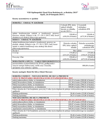 VIII Ogólnopolski Zjazd Firm Rodzinnych „u-Rodziny 2015” Opole, 26-29 listopada 2015 r. Koszty uczestnictwa w zjeździe DOROŚLI – UDZIAŁ W ZJEŹDZIE Członek IFR, który opłacił składki łącznie ze składką za rok 2015 r. opłata konferencyjna (udział w konferencji, przerwy kawowe, obiady, kolacje w dn. 27 i 28.11.2015, bal); koszt dodatkowych atrakcji pokrywają sponsorzy DZIECI – UDZIAŁ W ZJEŹDZIE opłata konferencyjna (udział w konferencji, przerwy na posiłek, obiady, kolacje w dn. 27 i 28.11.2015, bal); koszt opieki w trakcie konferencji oraz atrakcji dla dzieci pokrywają sponsorzy Do lat 5 5-12 lat Powyżej 12lat DODATKOWA OPCJA – TARGI FIRM RODZINNYCH powierzchnia wystawiennicza do 20 m2, podłączenie i zużycie energii elektrycznej, stolik oraz 2 krzesła, sprzątanie oraz ochrona i opieka. Uczestnik niebędący członkiem IFR 350,00 zł (430,50 zł brutto) 550,00 zł (675,50 zł brutto) Dziecko członka IFR, który opłacił składki Dziecko uczestnika niebędącego członkiem IFR Bez opłaty 175,00 zł 275,00 zł (215,25 zł brutto) (338,25 zł brutto) 350,00 zł 550,00 zł (430,50 zł brutto) (675,50 zł brutto) 800,00 zł netto Koszty noclegów Hotel De Silva i Hotel Mercure DOROŚLI I DZIECI – NOCLEGI HOTEL DE SILVA PREMIUM CENY W PRZYPADKU REJESTRACJI DO 25 PAŹDZIERNIKA 2015 pokój jednoosobowy/doba, ze śniadaniem 193,52 zł netto (209,00 zł brutto) pokój dwuosobowy/doba, ze śniadaniem 221,30 zł netto (239,00 zł brutto) Pokój trzyosobowy/doba, ze śniadaniem 269,00 zł netto (290,52 zł brutto) Apartament czteroosobowy, ze śniadaniem 369,00 zł netto (398,52 zł brutto) Pobyt dziecka do 4 lat bezpłatnie, powyżej 4 roku życia dopłata do pokoju wieloosobowego na zasadach ogólnych Parking podziemny 28,46 zł netto (35,00 zł brutto) Parking naziemny 20,33 zł netto (25,00 zł brutto) NOCLEGI HOTEL DE SILVA PREMIUM CENY W PRZYPADKU REJESTRACJI OD 26 PAŹDZIERNIKA DO 26 LISTOPADA pokój jednoosobowy/doba, ze śniadaniem 221,29 zł netto (239,00 zł brutto) pokój dwuosobowy/doba, ze śniadaniem 249,07 zł netto (269,00 zł brutto) Pokój trzyosobowy/doba, ze śniadaniem 276,85 zł netto (299,00 zł brutto) Apartament czteroosobowy, ze śniadaniem 369,44 zł netto (399,00 zł brutto) Pobyt dziecka do 4 lat bezpłatnie, powyżej 4 roku życia dopłata do pokoju wieloosobowego na zasadach ogólnych Parking podziemny 28,46 zł netto (35,00 zł brutto) Parking naziemny 20,33 zł netto (25,00 zł brutto) NOCLEGI HOTEL MERCURE CENY W PRZYPADKU REZERWACJI DO 23 PAŹDZIERNIKA pokój jednoosobowy/doba, ze śniadaniem 166,67 zł netto (180,00 zł brutto) pokój dwuosobowy/doba, ze śniadaniem 194,44 zł netto (210,00 zł brutto) Pokój Studio dwuosobowy/doba, ze śniadaniem 231,48 zł netto (250,00 zł brutto) Apartament dwuosobowy, doba, ze śniadaniem 277,78 zł netto (300,00 zł brutto) 1 dziecko do 16 roku życia w pokoju rodziców gratis, 2 dzieci w pokoju obok rodziców za 50% ceny NOCLEGI HOTEL MERCURE CENY W PRZYPADKU REZERWACJI OD 24 PAŹDZIERNIKA D0 26 LISTOPADA pokój jednoosobowy/doba, ze śniadaniem 194,44 zł netto (210,00 zł brutto) pokój dwuosobowy/doba, ze śniadaniem 222,22 zł netto (240,00 zł brutto) Pokój Studio dwuosobowy/doba, ze śniadaniem 259,26 zł netto (280,00 zł brutto) Apartament dwuosobowy, doba, ze śniadaniem 305,56 zł netto (330,00 zł brutto) 1 dziecko do 16 roku życia w pokoju rodziców gratis, 2 dzieci w pokoju obok rodziców za 50% ceny