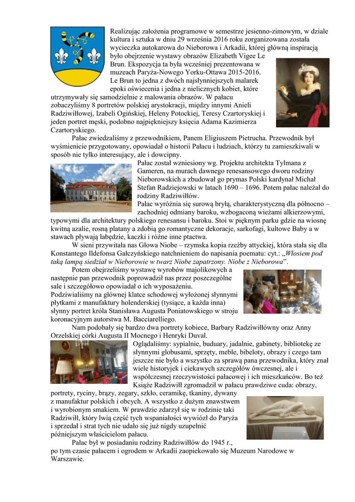 Realizując założenia programowe w semestrze jesienno-zimowym, w dziale kultura i sztuka w dniu 29 września 2016 roku zorganizowana została wycieczka autokarowa do Nieborowa i Arkadii, której główną inspiracją było obejrzenie wystawy obrazów Elizabeth Vigee Le Brun. Ekspozycja ta była wcześniej prezentowana w muzeach Paryża-Nowego Yorku-Ottawa 2015-2016. Le Brun to jedna z dwóch najsłynniejszych malarek epoki oświecenia i jedna z nielicznych kobiet, które utrzymywały się samodzielnie z malowania obrazów. W pałacu zobaczyliśmy 8 portretów polskiej arystokracji, między innymi Anieli Radziwiłłowej, Izabeli Ogińskiej, Heleny Potockiej, Teresy Czartoryskiej i jeden portret męski, podobno najpiękniejszy księcia Adama Kazimierza Czartoryskiego. Pałac zwiedzaliśmy z przewodnikiem, Panem Eligiuszem Pietrucha. Przewodnik był wyśmienicie przygotowany, opowiadał o historii Pałacu i ludziach, którzy tu zamieszkiwali w sposób nie tylko interesujący, ale i dowcipny. Pałac został wzniesiony wg. Projektu architekta Tylmana z Gameren, na murach dawnego renesansowego dworu rodziny Nieborowskich a zbudował go prymas Polski kardynał Michał Stefan Radziejowski w latach 1690 – 1696. Potem pałac należał do rodziny Radziwiłłów. Pałac wyróżnia się surową bryłą, charakterystyczną dla północno – zachodniej odmiany baroku, wzbogaconą wieżami alkierzowymi, typowymi dla architektury polskiego renesansu i baroku. Stoi w pięknym parku gdzie na wiosnę kwitną azalie, rosną platany a zdobią go romantyczne dekoracje, sarkofagi, kultowe Baby a w stawach pływają łabędzie, kaczki i różne inne ptactwa. W sieni przywitała nas Głowa Niobe – rzymska kopia rzeźby attyckiej, która stała się dla Konstantego Ildefonsa Gałczyńskiego natchnieniem do napisania poematu: cyt.: „Włosiem pod taką lampą siedział w Nieborowie w twarz Niobe zapatrzony. Niobe z Nieborowa”. Potem obejrzeliśmy wystawę wyrobów majolikowych a następnie pan przewodnik poprowadził nas przez poszczególne sale i szczegółowo opowiadał o ich wyposażeniu. Podziwialiśmy na głównej klatce schodowej wyłożonej słynnymi płytkami z manufaktury holenderskiej (tysiące, a każda inna) słynny portret króla Stanisława Augusta Poniatowskiego w stroju koronacyjnym autorstwa M. Bacciarelliego. Nam podobały się bardzo dwa portrety kobiece, Barbary Radziwiłłówny oraz Anny Orzelskiej córki Augusta II Mocnego i Henryki Duval. Oglądaliśmy: sypialnie, buduary, jadalnie, gabinety, bibliotekę ze słynnymi globusami, sprzęty, meble, bibeloty, obrazy i czego tam jeszcze nie było a wszystko za sprawą pana przewodnika, który znał wiele historyjek i ciekawych szczegółów ówczesnej, ale i współczesnej rzeczywistości pałacowej i ich mieszkańców. Bo też Książe Radziwiłł zgromadził w pałacu prawdziwe cuda: obrazy, portrety, ryciny, brązy, zegary, szkło, ceramikę, tkaniny, dywany z manufaktur polskich i obcych. A wszystko z dużym znawstwem i wyrobionym smakiem. W prawdzie zdarzył się w rodzinie taki Radziwiłł, który lwią część tych wspaniałości wywiózł do Paryża i sprzedał i strat tych nie udało się już nigdy uzupełnić późniejszym właścicielom pałacu. Pałac był w posiadaniu rodziny Radziwiłłów do 1945 r., po tym czasie pałacem i ogrodem w Arkadii zaopiekowało się Muzeum Narodowe w Warszawie. Dziś pałac w Nieborowie jest miejscem pracy twórczej. Bywali tu Maria Dąbrowska, Zofia Nałkowska, Władysław Broniewski, Konstanty Ildefons Gałczyński, Tadeusz Kotarbiński. Bywali tu też goście z zagranicy, np. Jean Cocteau, czy Artur Rubinstein. Wciąż trwają w Pałacu i w Arkadii prace rekonstrukcyjne i konserwatorskie, aby ich bogactwo i piękno można było podziwiać. Następnie udaliśmy się autokarem do Arkadii, parku założonego w roku 1778 przez Helenę Radziwiłłową. Arkadia tejże Pani była wyimaginowaną krainą pokoju i szczęścia, ustroniem poświęconym filozoficznej zadumie i wypoczynkowi na łonie przyrody. A wszystko to wobec rodzącego się w Europie romantyzmu. Architektem był Szymon Bogumił Zug przy osobistym zaangażowaniu Heleny Radziwiłłowej. Podobne rezydencje z ogrodami, jak nas informował Przewodnik powstały za sprawą Izabeli Czartoryskiej na Powązkach, Elżbiety Lubomirskiej na Mokotowie, Karola Thomatisa w Królikarni, Czartoryskich w Puławach, no i słynna Zofiówka Szczęsnego Potockiego. I tak w ogrodzie powstała Świątynia Diany ze wspaniałym plafonem przedstawiającym Jutrzenkę. Spiętrzono wodę w stawie, powstały budowle ogrodowe, wytyczono osie widokowe, wzniesiono Łuk Kamienny stanowiący oprawę dla Świątyni Diany, zbudowano kaplicę grobową zwaną Grobowcem Złudzeń, wzniesiono Cyrk i Amfiteatr. Arkadia była i jest pełna symboli literackich, filozoficznych i sentymentalnych, łączących w sobie pierwiastki szczęścia i cierpienia, miłości i śmierci. Nie sposób opisać i oddać całego bogactwa i piękna Arkadii. Każdy musi już sam, jeśli ma ochotę poznać dzieje Nieborowa i Arkadii z książek lub za pomocą Internetu. Będąc w Nieborowie i Arkadii nie godziło się ominąć Żelazowej Woli. Czasu mieliśmy tylko 1 godzinę na spacer w Parku, zajrzenie do Domu, w którym urodził się Chopin, posiłek, a wszystko to przy dyskretnych dźwiękach muzyki Mistrza. Bardzo nam się udała ta wycieczka, Bo nie tylko przewodnik, który wydawało się, że zszedł z któregoś portretu pałacowego i był świetnie przygotowany do swojej roli. Dopisała również pogoda, wygodny był autokar z firmy „ŚWIERK” z sympatycznym Panem Kierowcą. I nie słyszeliśmy, aby ktoś z uczestników wyjazdu był niezadowolony z jej przebiegu.