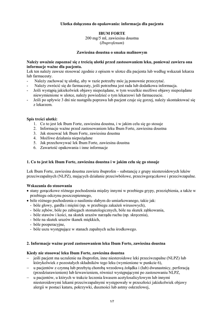 Ulotka dołączona do opakowania: informacja dla pacjenta IBUM FORTE 200 mg/5 ml, zawiesina doustna (Ibuprofenum) Zawiesina doustna o smaku malinowym Należy uważnie zapoznać się z treścią ulotki przed zastosowaniem leku, ponieważ zawiera ona informacje ważne dla pacjenta. Lek ten należy zawsze stosować zgodnie z opisem w ulotce dla pacjenta lub według wskazań lekarza lub farmaceuty. Należy zachować tę ulotkę, aby w razie potrzeby móc ją ponownie przeczytać. Należy zwrócić się do farmaceuty, jeśli potrzebna jest rada lub dodatkowa informacja. - Jeśli wystąpią jakiekolwiek objawy niepożądane, w tym wszelkie możliwe objawy niepożądane niewymienione w ulotce, należy powiedzieć o tym lekarzowi lub farmaceucie. - Jeśli po upływie 3 dni nie nastąpiła poprawa lub pacjent czuje się gorzej, należy skontaktować się z lekarzem. Spis treści ulotki: 1. Co to jest lek Ibum Forte, zawiesina doustna, i w jakim celu się go stosuje 2. Informacje ważne przed zastosowaniem leku Ibum Forte, zawiesina doustna 3. Jak stosować lek Ibum Forte, zawiesina doustna 4. Możliwe działania niepożądane 5. Jak przechowywać lek Ibum Forte, zawiesina doustna 6. Zawartość opakowania i inne informacje 1. Co to jest lek Ibum Forte, zawiesina doustna i w jakim celu się go stosuje Lek Ibum Forte, zawiesina doustna zawiera ibuprofen – substancję z grupy niesteroidowych leków przeciwzapalnych (NLPZ), mających działanie przeciwbólowe, przeciwgorączkowe i przeciwzapalne. Wskazania do stosowania stany gorączkowe różnego pochodzenia między innymi w przebiegu grypy, przeziębienia, a także w przebiegu odczynu poszczepiennego, bóle różnego pochodzenia o nasileniu słabym do umiarkowanego, takie jak: - bóle głowy, gardła i mięśni (np. w przebiegu zakażeń wirusowych), - bóle zębów, bóle po zabiegach stomatologicznych, bóle na skutek ząbkowania, - bóle stawów i kości, na skutek urazów narządu ruchu (np. skręcenia), - bóle na skutek urazów tkanek miękkich, - bóle pooperacyjne, - bóle uszu występujące w stanach zapalnych ucha środkowego. 2. Informacje ważne przed zastosowaniem leku Ibum Forte, zawiesina doustna Kiedy nie stosować leku Ibum Forte, zawiesina doustna jeśli pacjent ma uczulenie na ibuprofen, inne niesteroidowe leki przeciwzapalne (NLPZ) lub którykolwiek z pozostałych składników tego leku (wymienione w punkcie 6), u pacjentów z czynną lub przebytą chorobą wrzodową żołądka i (lub) dwunastnicy, perforacją (przedziurawieniem) lub krwawieniem, również występującymi po zastosowaniu NLPZ, u pacjentów, u których w trakcie leczenia kwasem acetylosalicylowym lub innymi niesteroidowymi lekami przeciwzapalnymi występowały w przeszłości jakiekolwiek objawy alergii w postaci kataru, pokrzywki, duszności lub astmy oskrzelowej, 1/7 w przypadku przyjmowania innych leków z grupy NLPZ (w tym inhibitorów COX-2 takich jak celekoksyb lub etorikoksyb), jeśli występuje ciężka niewydolność wątroby, nerek lub serca, jeśli występuje krwawienie w mózgu (krwawienie z naczyń mózgowych) lub inne krwawienie, jeśli występują zaburzenia krzepnięcia krwi, skaza krwotoczna (skłonność do krwawień) lub zaburzenia wytwarzania krwi o nieustalonym pochodzeniu. Jeśli osoby dorosłe stosują ten lek, nie należy przyjmować go w ostatnich 3 miesiącach ciąży. Ostrzeżenia i środki ostrożności Należy zachować szczególną ostrożność stosując lek Ibum Forte, zawiesina doustna: jeśli pacjent przyjmuje inne leki przeciwbólowe z grupy NLPZ lub kwas acetylosalicylowy w dawce dobowej powyżej 75 mg, jeśli u pacjenta stwierdzono niektóre choroby skóry (toczeń rumieniowaty układowy, mieszana choroba tkanki łącznej), jeśli u pacjenta stwierdzono choroby przewodu pokarmowego oraz przewlekłe zapalne choroby jelit (wrzodziejące zapalenie jelita grubego, chorobę Leśniowskiego i Crohna), jeśli u pacjenta stwierdzono podwyższone ciśnienie krwi i (lub) zaburzenia czynności serca, jeśli u pacjenta stwierdzono zaburzenia czynności nerek, jeśli u pacjenta stwierdzono choroby wątroby, po ostatnio przebytej poważnej operacji, jeśli występuje odwodnienie ze względu na zwiększone ryzyko niewydolności nerek, w przypadku występowania obecnie lub w przeszłości astmy, przewlekłego kataru, polipów nosa lub chorób alergicznych możliwe jest wystąpienie duszności, podczas stosowania innych leków, które mogą zwiększać ryzyko wystąpienia owrzodzenia lub krwawienia, takich jak doustne kortykosteroidy (np. prednizolon), leki rozrzedzające krew (np. acenokumarol), selektywne inhibitory wychwytu zwrotnego serotoniny (leki przeciwdepresyjne) oraz leki przeciwpłytkowe (jak kwas acetylosalicylowy). Jednoczesne, długotrwałe stosowanie leków przeciwbólowych może prowadzić do utrzymujących się poważnych problemów z nerkami. Ibum Forte może maskować objawy istniejącego zakażenia lub gorączki. Przyjmowanie takich leków jak Ibum Forte może być związane z niewielkim zwiększeniem ryzyka ataku serca (zawału serca) lub udaru. Ryzyko to zwiększa długotrwałe przyjmowanie dużych dawek leku. Nie należy stosować większych dawek i dłuższego czasu leczenia niż zalecane (3 dni). W przypadku kłopotów z sercem, przebytego udaru, lub podejrzenia, że występuje ryzyko tych zaburzeń (podwyższone ciśnienie krwi, cukrzyca, zwiększone stężenie cholesterolu, palenie tytoniu) należy omówić sposób leczenia z lekarzem lub farmaceutą. Podczas ospy wietrznej należy unikać stosowania leku Ibum Forte. Jeżeli którykolwiek z wyżej wymienionych warunków dotyczy dziecka należy skontaktować się z lekarzem przed zastosowaniem leku Ibum Forte. U osób w podeszłym wieku występuje zwiększone ryzyko działań niepożądanych w trakcie stosowania leków z grupy NLPZ, w szczególności tych dotyczących żołądka i jelit. Pacjenci, u których wcześniej wystąpiły działania niepożądane w obrębie 