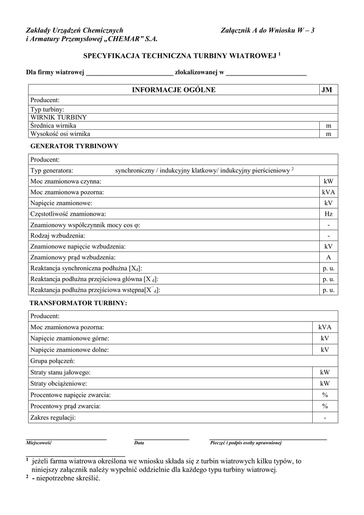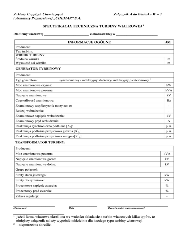 Zakłady Urządzeń Chemicznych i Armatury Przemysłowej „CHEMAR” S.A. Załącznik A do Wniosku W – 3 SPECYFIKACJA TECHNICZNA TURBINY WIATROWEJ 1 Dla firmy wiatrowej __________________________ zlokalizowanej w ________________________ INFORMACJE OGÓLNE Producent: Typ turbiny: WIRNIK TURBINY Średnica wirnika Wysokość osi wirnika JM m m GENERATOR TYRBINOWY Producent: Typ generatora: synchroniczny / indukcyjny klatkowy/ indukcyjny pierścieniowy 2 Moc znamionowa czynna: kW Moc znamionowa pozorna: kVA Napięcie znamionowe: kV Częstotliwość znamionowa: Hz Znamionowy współczynnik mocy cos ϕ: - Rodzaj wzbudzenia: - Znamionowe napięcie wzbudzenia: kV Znamionowy prąd wzbudzenia: A Reaktancja synchroniczna podłużna [Xd]: p. u. [X`d]: p. u. Reaktancja podłużna przejściowa wstępna[X``d]: p. u. Reaktancja podłużna przejściowa główna TRANSFORMATOR TURBINY: Producent: Moc znamionowa pozorna: kVA Napięcie znamionowe górne: kV Napięcie znamionowe dolne: kV Grupa połączeń: Straty stanu jałowego: kW Straty obciążeniowe: kW Procentowe napięcie zwarcia: % Procentowy prąd zwarcia: % Zakres regulacji: - ______________________ _______________ ________________________________ Miejscowość Data Pieczęć i podpis osoby uprawnionej ___________________________ 1 jeżeli farma wiatrowa określona we wniosku składa się z turbin wiatrowych kilku typów, to niniejszy załącznik należy wypełnić oddzielnie dla każdego typu turbiny wiatrowej. 2 - niepotrzebne skreślić.