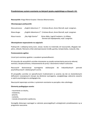 Przedmiotowy system oceniania na lekcjach języka angielskiego w klasach I-III. Nauczyciele: Kinga Maria Kurpias i Danuta Aktonorowicz. Obowiązujące podręczniki: Klasa pierwsza: „English Adventure 1” Cristiana Bruni, Anne Worrall, wyd. Longman. Klasa druga: „English Adventure 2” Cristiana Bruni, Anne Worrall, wyd. Longman Klasa trzecia: „Sky High Starter” Brian Abbs, Ingrid Freebairn, Liz Kilbey, Dorota Łoś-Sapiejewska, wyd. Longman. Obowiązkowe wyposażenie na zajęciach: Podręcznik z wklejoną kartą ocen, zeszyt, teczka na materiały od nauczyciela, długopis lub pióro, ołówek, flamastry i/lub zatemperowane kredki, gumka, temperówka, nożyczki, klej. Postanowienia ogólne: Uczeń jest oceniany zgodnie z zasadami sprawiedliwości. W stosunku do wszystkich uczniów stosowane są zasady wzmacniania poczucia własnej wartości, bezpieczeństwa, motywowania do pracy i doceniania małych sukcesów. Nauczyciel dostosowuje wymagania psychofizycznych i edukacyjnych ucznia. edukacyjne do indywidualnych potrzeb W przypadku uczniów ze specyficznymi trudnościami w uczeniu się lub ze stwierdzonymi deficytami rozwojowymi stosuje się obniżone wymagania, uwzględniając zalecenia zawarte w opinii psychologiczno-pedagogicznej. Nauczyciel zapoznaje uczniów z systemem oceniania na początku roku szkolnego. Elementy podlegające ocenie: - rozumienie ze słuchu, - mówienie, - pisanie, - czytanie, - rozwój emocjonalno-społeczny. Szczegóły dotyczące wymagań w zakresie poszczególnych umiejętności przedstawione są w programie nauczania: Mariola Bogucka „Program nauczania języka angielskiego” http://www.pearson.pl/pub/angielski/uploadimages/reforma/program-nauczania-nowy-1-3word-22-07-09-new.pdf Sposoby oceniania: - bieżące; - okresowe. Bieżące osiągnięcia uczniów oceniane są w następujący sposób: 1) ustnie – wszelkie osiągnięcia i umiejętności uczniów; 2) pisemnie - w formie wyrazów i krótkich zdań na pracach klasowych i w zeszycie; 3) za pomocą stempelków na karcie ocen; Okresowe osiągnięcia uczniów (stopień opanowania materiału) oceniane są pod koniec semestru w formie opisowej na podstawie obserwacji ucznia i wyników jego pracy w formie oceny umiejętności językowych - percepcji i produkcji. 1) ocena punktowa w skali 1 – 10, świadcząca o stopniu opanowania materiału na podstawie obserwacji nauczyciela oraz wyników testów umiejętności językowych: speaking mówienie, listening - słuchanie, reading – czytanie, writing – pisanie. 10 – 8 - uczeń opanował obowiązujący zakres materiału (jeśli zawsze lub prawie zawsze spełnia wymagania); 7 – 5 - uczeń częściowo opanował zakres materiału wymagania); (jeśli często lub czasami spełnia 4 – 1 - uczeń opanował zakres materiału w stopniu minimalnym (jeśli rzadko udaje mu się spełnić wymagania). 2) ocena procentowa wyrażająca liczbę uzyskanych przez ucznia stempelków w stosunku do ilości stempelków wymaganej do uzyskania w danym semestrze. Testy: Testy obejmują materiał poszczególnych działów z podręcznika. Test może mieć formę ustną lub pisemną. Nauczyciel ma obowiązek poinformowania o teście na tydzień przed jego terminem. Za test uczeń otrzymuje: - ocenę procentową (uzyskana ilość punktów/maksymalna ilość punktów) - stempelki 100%-96% 3 stempelki 95%-89% 2 stempelki pkt bardzo dobra 88%-80% 1 stempelek Niesamodzielna praca skutkuje obniżeniem oceny. Nieobecność na teście zobowiązuje ucznia do nadrobienia tej zaległości. Uczeń ma obowiązek zgłosić się do nauczyciela bezpośrednio po swoim powrocie do szkoły i umówić się z nauczycielem na zaliczenie w ciągu najbliższych dwóch tygodni. Kartkówki: Obejmują materiał z 2-3 ostatnich lekcji. Nie muszą być wcześniej zapowiadane. Za kartkówkę uczeń otrzymuje: - ocenę procentową (uzyskana ilość punktów/maksymalna ilość punktów) - stempelki 100%-96% 3 stempelki 95%-89% 2 stempelki pkt bardzo dobra 88%-80% 1 stempelek Niesamodzielna praca skutkuje obniżeniem oceny. Portfolio językowe: Materiały z lekcji uczniowie mają obowiązek przechowywać w teczce. Prowadzenie tzw. portfolio ma za zadanie przygotować dziecko do samodzielnego brania odpowiedzialności za swoja naukę, służyć przy powtarzaniu i utrwalaniu materiału oraz umożliwić rodzicom wgląd w postępy dziecka. Nieprzygotowanie: Niegotowość do odpowiedzi, brak pracy domowej i brak wyposażenia obowiązującego na zajęciach są traktowane jako nieprzygotowanie. Uczeń ma obowiązek zgłosić nauczycielowi fakt nieprzygotowania na początku lekcji. Trzykrotne nieprzygotowanie do zajęć skutkuje uwagą w dzienniku. Nieobecność: Po dłuższej nieobecności w szkole (powyżej jednego tygodnia) uczeń ma prawo być nieprzygotowany do lekcji, testu lub kartkówki bez żadnych konsekwencji. Po powrocie uczeń ma obowiązek zgłosić się do nauczyciela po materiały, których nie otrzymał w związku z nieobecnością i instrukcje odnośnie nadrobienia materiału. Opracowały: Kinga Maria Kurpias i Danuta Aktonorowicz.
