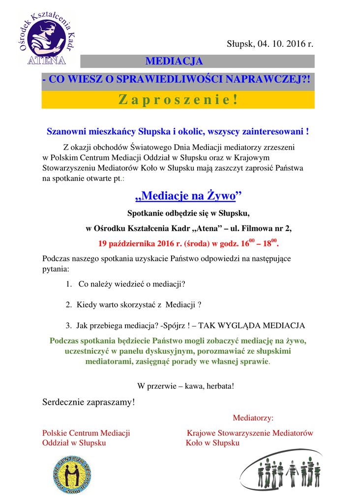 Słupsk, 04. 10. 2016 r. MEDIACJA - CO WIESZ O SPRAWIEDLIWOŚCI NAPRAWCZEJ?! Zaproszenie! Szanowni mieszkańcy Słupska i okolic, wszyscy zainteresowani ! Z okazji obchodów Światowego Dnia Mediacji mediatorzy zrzeszeni w Polskim Centrum Mediacji Oddział w Słupsku oraz w Krajowym Stowarzyszeniu Mediatorów Koło w Słupsku mają zaszczyt zaprosić Państwa na spotkanie otwarte pt.: „Mediacje na Żywo” Spotkanie odbędzie się w Słupsku, w Ośrodku Kształcenia Kadr „Atena” – ul. Filmowa nr 2, 19 października 2016 r. (środa) w godz. 1600 – 1800. Podczas naszego spotkania uzyskacie Państwo odpowiedzi na następujące pytania: 1. Co należy wiedzieć o mediacji? 2. Kiedy warto skorzystać z Mediacji ? 3. Jak przebiega mediacja? -Spójrz ! – TAK WYGLĄDA MEDIACJA Podczas spotkania będziecie Państwo mogli zobaczyć mediację na żywo, uczestniczyć w panelu dyskusyjnym, porozmawiać ze słupskimi mediatorami, zasięgnąć porady we własnej sprawie. W przerwie – kawa, herbata! Serdecznie zapraszamy! Mediatorzy: Polskie Centrum Mediacji Oddział w Słupsku Krajowe Stowarzyszenie Mediatorów Koło w Słupsku