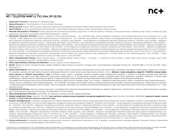 Regulamin Warunków Promocji: NC+ TELEFON MNP (z TV) 24m 3P (9/16) 1. 2. 3. 4. 5. Organizator Promocji: ITI Neovision S.A. (Dostawca usług). Nazwa Promocji: NC+ TELEFON MNP (z TV) 24m 3P (9/16) (Promocja). Oferta Łączona: Program Oferty Łączonej, uregulowany Regulaminem Szczegółowych Warunków Programu Oferty Łączonej z dnia 5.09.2016 r. Opis Promocji: Promocja umożliwia Abonentowi korzystanie z Usług Telekomunikacyjnych Dostawcy usług w ramach Programu Oferty Łączonej. Warunek skorzystania z Promocji: Promocja dostępna tylko dla Abonentów Dostawcy usług, którzy w chwili skorzystania z Promocji są stroną dwóch Umów z Dostawcą usług: Umowy o świadczenie Usług telewizyjnych oraz Umowy o świadczenie Usług Telekomunikacyjnych – Internet. 6. Dokumenty dotyczące Promocji: Umowa o świadczenie Usług Telekomunikacyjnych – NC+ TELEFON (dalej: Umowa), Regulamin świadczenia Usług Telekomunikacyjnych przez ITI Neovision S.A. z dnia 7.03.2016 r. (dalej: Regulamin), Cennik Usług Telekomunikacyjnych ITI Neovision S.A. – NC+ TELEFON z dnia 5.09.2016 r. (dalej: Cennik), Cennik Regulaminu Warunków Promocji NC+ TELEFON MNP (z TV) 24m 3P (9/16), Regulamin Szczegółowych Warunków świadczenia Usługi NC+ TELEFON z dnia 5.09.2016 r., Cennik Regulaminu Szczegółowych Warunków świadczenia Usługi NC+ TELEFON z dnia 5.09.2016 r., Regulamin Szczegółowych Warunków świadczenia Usługi nc+ doładowanie 2GB Mobile z dnia 5.09.2016 r., Cennik Regulaminu Szczegółowych Warunków świadczenia Usługi nc+ doładowanie 2GB Mobile z dnia 5.09.2016 r., Regulamin Szczegółowych Warunków świadczenia Usługi 5GB Mobile z dnia 5.09.2016 r., Cennik Regulaminu Szczegółowych Warunków świadczenia Usługi 5GB Mobile z dnia 5.09.2016 r., Regulamin Szczegółowych Warunków świadczenia Usługi Noce bez limitu Mobile z dnia 5.09.2016 r., Cennik Regulaminu Szczegółowych Warunków świadczenia Usługi Noce bez limitu Mobile z dnia 5.09.2016 r., Regulamin Szczegółowych Warunków Programu Oferty Łączonej z dnia 5.09.2016 r., Regulamin Szczegółowych Warunków świadczenia Usług połączeń międzynarodowych oraz roamingu międzynarodowego świadczonych przez ITI Neovision S.A. z dnia 5.09.2016 r., Cennik Regulaminu Szczegółowych Warunków świadczenia Usług połączeń międzynarodowych oraz roamingu międzynarodowego świadczonych przez ITI Neovision S.A. z dnia 5.09.2016 r., Regulamin Szczegółowych Warunków przenoszenia przydzielonego numeru telefonu przy zmianie dostawcy usług świadczonych w ruchomej publicznej sieci telekomunikacyjnej z dnia 7.03.2016 r., Cennik świadczenia Usług w trakcie trwania przeniesienia numeru do ITI Neovision S.A. z dnia 5.09.2016 r. 7. Okres obowiązywania Umowy: miesiąc zawarcia Umowy + 23 miesiące/miesiąc zawarcia Umowy + 22 miesiące - w zależności od dnia miesiąca, w którym Klient zawarł Umowę, szczegóły: patrz Cennik Regulaminu Warunków Promocji NC+ TELEFON MNP (z TV) 24m 3P (9/16). 8. Okres wypowiedzenia Umowy przez Abonenta: 1 miesiąc, zgodnie z Umową, Regulaminem. 9. Sprzęt: Abonent w ramach niniejszej Promocji uzyskuje możliwość nabycia Sprzętu na własność. Szczegóły patrz: Cennik Regulaminu Warunków Promocji NC+ TELEFON MNP (z TV) 24m 3P (9/16), Tabela Promocyjna 6 i 7. 10. Zgody marketingowe: Klient/Abonent przed skorzystaniem z Promocji/w trakcie trwania Okresu obowiązywania Umowy może wyrazić zgody na działania marketingowe, których zakres wskazany jest w Umowie. W przypadku wyrażenia tych zgód, Opłaty miesięczne obowiązujące Abonenta w trakcie okresu oznaczonego zostaną obniżone o 5 zł, tj. Abonent, z tytułu korzystania z Usługi NC+ TELEFON, TELEFON, uiszczać będzie Tabelach kwoty wskazane w Tabel ach promocyjnych 2 albo 4 . Obniżenie Opłat nastąpi w przypadku wyrażenia wszystkich zgód marketingowych zawartych w Umowie. W przypadku wycofania przez Abonenta którejkolwiek z tych zgód, suma Opłat miesięcznych może zostać podwyższona o 5 zł. Po ponownym wyrażeniu uprzednio wycofanych zgód lub po uzupełnieniu wszystkich wskazanych w Umowie zgód marketingowych, Opłaty miesięczne będą naliczane zgodnie z Tabelą promocyjną 2 albo 4 tak długo, jak długo obowiązywać będą wszystkie wskazane w Umowie zgody marketingowe. W przypadku jednoczesnego zawarcia przez Klienta/Abonenta więcej niż jednej Umowy z Dostawcą usług, w tym: Umowy o świadczenie Usług telewizyjnych, Umowy o świadczenie Usług Telekomunikacyjnych – Internet, Umowy o świadczenie Usług Telekomunikacyjnych – NC+ TELEFON, stanowiących łącznie pakiet usług, do uzyskania obniżenia Opłat opisanego w zdaniach poprzedzających, wystarczające jest wyrażenie i nieodwołanie zgód marketingowych tylko dla jednej z Umów. W przypadku niewyrażenia lub wycofania przez Abonenta którejkolwiek ze zgód, suma Opłat miesięcznych może zostać podwyższona o 5 zł – tylko dla jednej z Umów 11. Przekształcenie Umowy: umowa po okresie oznaczonym, w przypadku braku odmiennej decyzji Abonenta, przekształca się, zgodnie z Regulaminem, automatycznie w umowę na okres nieoznaczony, szczegóły patrz: Cennik Regulaminu Warunków Promocji NC+ TELEFON MNP (z TV) 24m 3P (9/16). 12. Okres obowiązywania Promocji: od 5.09.2016 r. do odwołania, z zachowaniem praw nabytych Abonentów. 13. Zasady wyłączania Usług: U sług: Usługa NC+ TELEFON: brak możliwości wyłączenia poza przypadkami przypadkam i rozwiązania/wygaśnięcia Umowy. Usługi: Noce bez limitu Mobile, 5GB Mobile: wyłączenie wyłączen ie nastąpi z końcem miesiąca, w którym dokonano zgłoszenia wyłączenia Usługi. Usługi. 14. Kwestie nieuregulowane: w kwestiach nieuregulowanych niniejszym Regulaminem Warunków Promocji zastosowanie będą miały postanowienia: Umowy, Regulaminu, Cennika, Cennika Regulaminu Warunków Promocji NC+ TELEFON MNP (z TV) 24m 3P (9/16), Regulaminu Szczegółowych Warunków świadczenia Usługi NC+ 