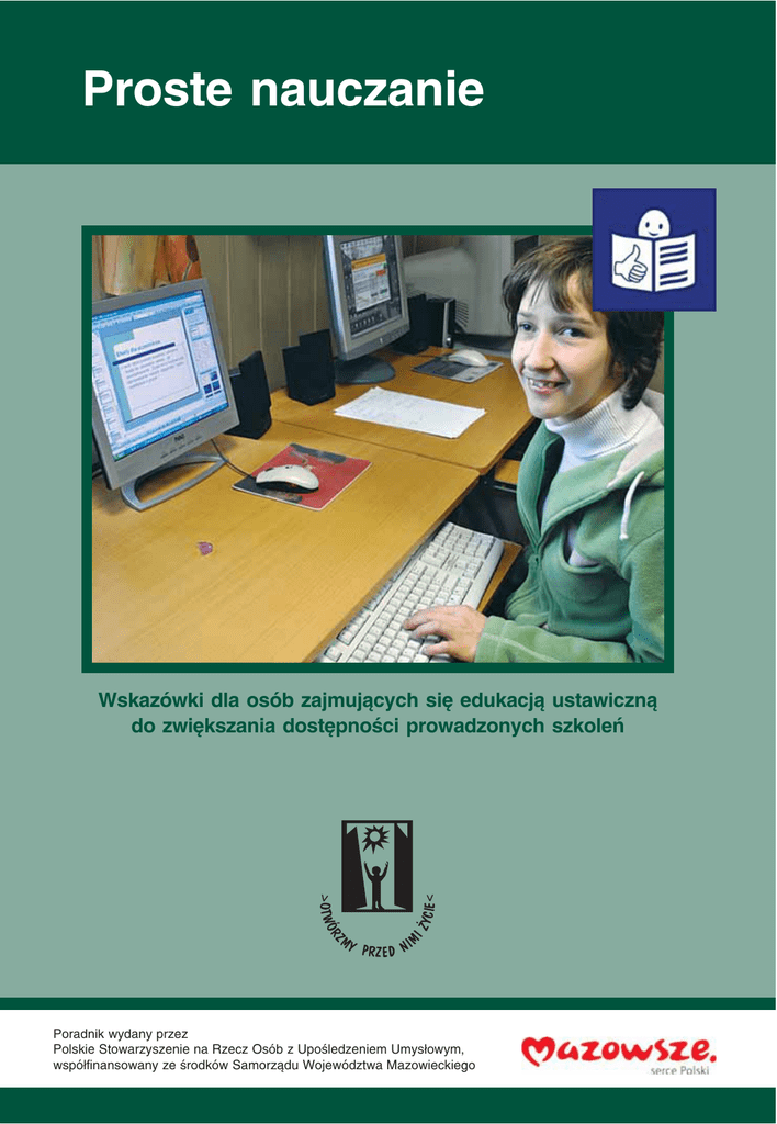 Proste nauczanie Wskazówki dla osób zajmujących się edukacją ustawiczną do zwiększania dostępności prowadzonych szkoleń Poradnik wydany przez Polskie Stowarzyszenie na Rzecz Osób z Upośledzeniem Umysłowym, współfinansowany ze środków Samorządu Województwa Mazowieckiego Proste nauczanie. Wskazówki dla osób zajmujących się edukacją ustawiczną do zwiększania dostępności prowadzonych szkoleń ISBN 978−83−60105−84−9 © Copyright for the Polish edition by PSOUU, 2012 Warszawa, 2012 Polskie Stowarzyszenie na Rzecz Osób z Upośledzeniem Umysłowym ul. Głogowa 2b, 02−639 Warszawa www.psouu.org.pl Tłumaczenie z języka francuskiego: Redakcja: Maria Lidia Czarkowska Tomasz Przybysz−Przybyszewski Konsultacja: Barbara Ewa Abramowska Skład i druk: DG−GRAF, Warszawa Poradnik opracowano w ramach projektu „Ścieżki edukacji dorosłych dla osób z niepełnosprawnością intelektualną” („Pathways to adult education for people with intellectual disabilities”; „Vers une formation continue pour les personnes handicapées intellectuelles”). Publikację w języku angielskim wydała organizacja Inclusion Europe przy wsparciu Komisji Europejskiej. Wydanie francuskie opublikowała organizacja UNAPEI (Narodowa Unia Stowarzyszeń Rodziców, Osób Niepełnosprawnych Intelektualnie i ich Przyjaciół), przy wsparciu Inclusion Europe i Komisji Europejskiej. Program uczenia się przez całe życie Dyrekcja Generalna Edukacja i Kultura Inclusion Europe Partnerzy projektu „Ścieżki edukacji dorosłych dla osób z niepełnosprawnością intelektualną” wydali także 3 inne poradniki. Ich polskie wersje są zamieszczone na stronie www.psouu.org.pl/publikacje Na stronie internetowej www.life−long−learning.eu poradniki są dostępne w językach: angielskim, niemieckim, francuskim, fińskim, portugalskim, litewskim. Proste nauczanie Spis treści 1. Wprowadzenie 5 2. W jaki sposób mówić 7 2.1. Używaj prostego języka 3. Materiały, jakich używasz podczas szkolenia 8 10 3.1. Używaj materiałów prostych i łatwych do czytania 10 3.2. Używaj pomocy wizualnych 11 4. Ty i Twoi słuchacze 12 4.1. Włączaj słuchaczy do swojej prezentacji 12 4.2. Utrzymuj kontakt z osobami z niepełnosprawnością intelektualną 13 3 Nie piszcie nic o nas bez nas! 4 Proste nauczanie Wprowadzenie 1 Ważne jest, aby materiały szkoleniowe i prezentacja, przygotowane przez osobę prowadzącą szkolenie, były opracowane w sposób dostępny dla słuchaczy. Jest to jeszcze ważniejsze, gdy słuchaczami są osoby dorosłe, ponieważ zdarza się, że mają one bardzo różne umiejętności. Na przykład niektórzy mówią innymi językami. Może być też tak, że niektórzy dużo się uczyli, a inni mało. Może się okazać, że osobami dorosłymi są osoby z niepełnosprawnością intelektualną. Wówczas dla szkoleniowca jest to jeszcze trudniejsze, ponieważ nie wie, w jaki sposób przekazywać informacje osobom z niepełnosprawnością intelektualną. Od wielu lat organizacja Inclusion Europe (czytaj: inklużyn jurop) pracuje z osobami z niepełnosprawnością intelektualną. Wydała wiele poradników i materiałów informacyjnych. Na przykład o europejskich standardach przygotowania tekstu łatwego do czytania i zrozumienia. 5 Proste nauczanie 1 Ten poradnik został opracowany dla szkoleniowców zajmujących się edukacją osób dorosłych, aby ich szkolenia były dostępne. Jest to ważne dla osób z niepełnosprawnością intelektualną, ale także dla innych uczestników szkolenia. Opracowaliśmy ten poradnik w tekście łatwym do czytania, na wypadek gdyby prowadzącymi szkolenia były osoby z niepełnosprawnością intelektualną. Jest on więc dostępny również dla nich. Chcemy w tym poradniku przedstawić pomysły i przykłady. Mamy nadzieję, że pomogą one szkoleniowcom przygotować kursy, które będą dostępne. Również sami szkoleniowcy powinni szukać własnych pomysłów i przystosować materiał szkoleniowy do sytuacji szczególnych. Najważniejsze, aby szkolenie było przystosowane do specyficznych potrzeb słuchaczy. Przed przygotowywaniem kursu szkoleniowiec powinien uzyskać więcej informacji o uczestnikach szkolenia i o ich możliwościach. 6 Proste nauczanie W jaki sposób mówić 2 Aby to, co mówisz, było łatwe do zrozumienia, radzimy zapoznać się ze standardami zawartymi w poradniku „Informacja dla wszystkich. Europejskie standardy przygotowania tekstu łatwego do czytania i zrozumienia”. 2 rozdziały tego poradnika pomogą Ci przedstawić to, co mówisz, w sposób łatwy do zrozumienia: ● Rozdział 1: Ogólne standardy przygotowania informacji łatwej do czytania i zrozumienia. ● Rozdział 4: Standardy dotyczące informacji wideo. 7 Proste nauczanie 2.1 Używaj prostego języka Ważne jest, aby mówić jasno i powoli. Prowadząc szkolenie musisz zwracać uwagę na to, czy słuchacze rozumieją to, co mówisz. Postaraj się znaleźć sposób na sprawdzenie, czy słuchacze rozumieją to, co mówisz. Jednym ze sposobów jest zadanie pytania: „Czy możecie własnymi słowami powiedzieć, o czym mówię?” Nie należy stawiać pytań w rodzaju: „Czy zrozumieliście?”. Ludzie mogą odpowiedzieć „tak”, mimo że nie zrozumieli. Może się zdarzyć, że słuchacze będą mieli trudności z wypowiedzeniem się. Trzeba wówczas zwrócić uwagę na ich mowę ciała. 8 Proste nauczanie W Inclusion Europe wprowadzono narzędzie w postaci kartek dostępności. 2.1 Każdy słuchacz ma 3 kartki: zieloną, żółtą i czerwoną. ● Podniesienie zielonej kartki oznacza, że słuchacze zgadzają się z Tobą. Podnoszą ją, aby zaznaczyć, że Cię rozumieją i nadążają za Tobą. ● Podniesienie żółtej kartki oznacza, że mówisz za szybko. ● Podniesienie czerwonej kartki oznacza, że to, co mówisz, jest niezrozumiałe lub że słuchacze chcą zadać pytanie. W tym ostatnim przypadku musisz jeszcze raz im wytłumaczyć to, co by