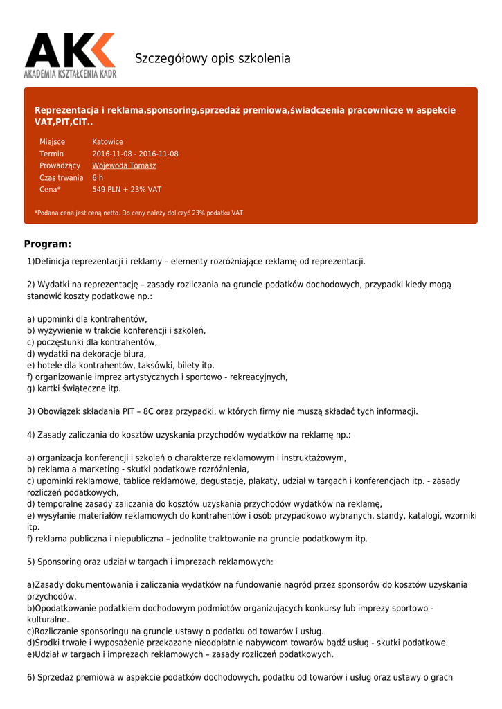 Szczegółowy opis szkolenia Reprezentacja i reklama,sponsoring,sprzedaż premiowa,świadczenia pracownicze w aspekcie VAT,PIT,CIT.. Miejsce Katowice Termin 2016-11-08 - 2016-11-08 Prowadzący Wojewoda Tomasz Czas trwania 6h Cena* 549 PLN + 23% VAT *Podana cena jest ceną netto. Do ceny należy doliczyć 23% podatku VAT Program: 1)Definicja reprezentacji i reklamy – elementy rozróżniające reklamę od reprezentacji. 2) Wydatki na reprezentację – zasady rozliczania na gruncie podatków dochodowych, przypadki kiedy mogą stanowić koszty podatkowe np.: a) upominki dla kontrahentów, b) wyżywienie w trakcie konferencji i szkoleń, c) poczęstunki dla kontrahentów, d) wydatki na dekoracje biura, e) hotele dla kontrahentów, taksówki, bilety itp. f) organizowanie imprez artystycznych i sportowo - rekreacyjnych, g) kartki świąteczne itp. 3) Obowiązek składania PIT – 8C oraz przypadki, w których firmy nie muszą składać tych informacji. 4) Zasady zaliczania do kosztów uzyskania przychodów wydatków na reklamę np.: a) organizacja konferencji i szkoleń o charakterze reklamowym i instruktażowym, b) reklama a marketing - skutki podatkowe rozróżnienia, c) upominki reklamowe, tablice reklamowe, degustacje, plakaty, udział w targach i konferencjach itp. - zasady rozliczeń podatkowych, d) temporalne zasady zaliczania do kosztów uzyskania przychodów wydatków na reklamę, e) wysyłanie materiałów reklamowych do kontrahentów i osób przypadkowo wybranych, standy, katalogi, wzorniki itp. f) reklama publiczna i niepubliczna – jednolite traktowanie na gruncie podatkowym itp. 5) Sponsoring oraz udział w targach i imprezach reklamowych: a)Zasady dokumentowania i zaliczania wydatków na fundowanie nagród przez sponsorów do kosztów uzyskania przychodów. b)Opodatkowanie podatkiem dochodowym podmiotów organizujących konkursy lub imprezy sportowo kulturalne. c)Rozliczanie sponsoringu na gruncie ustawy o podatku od towarów i usług. d)Środki trwałe i wyposażenie przekazane nieodpłatnie nabywcom towarów bądź usług - skutki podatkowe. e)Udział w targach i imprezach reklamowych – zasady rozliczeń podatkowych. 6) Sprzedaż premiowa w aspekcie podatków dochodowych, podatku od towarów i usług oraz ustawy o grach losowych i zakładach wzajemnych: a)Upominki premiowe, nagrody w organizowanych przez sprzedawcę bądź producenta konkursach i losowaniach zasady zaliczania poniesionych wydatków do kosztów uzyskania przychodów. b)Zasady opodatkowania podatkiem dochodowym zwycięzców konkursów i promocji otrzymujących nagrody związane ze sprzedażą premiową, zwolnienia z podatku dochodowego od osób fizycznych. c)Przypadki, w których organizator sprzedaży premiowej pełni funkcję płatnika podatku dochodowego od osób fizycznych. d)Zasady rozliczania sprzedaży premiowej na gruncie VAT (możliwość potrącenia podatku naliczonego, przypadki gdy nie powstaje obowiązek uiszczenia podatku należnego itp.). e)Rabaty naturalne – zasady rozliczeń na gruncie podatków dochodowych i podatku od towarów i usług. f)Sprzedaż premiowa – skutki na gruncie ustawy o grach losowych i zakładach wzajemnych. 7) Sprzedaż towarów i usług za cenę symboliczną (1 zł lub 1 gr) skutki w zakresie podatku od towarów i usług oraz podatków dochodowych. 8) Świadczenia na rzecz pracowników, zasady zaliczania wydatków do kosztów uzyskania przychodów u pracodawcy, ustalanie przychodów pracowników, zasady stosowania zwolnień z podatku dochodowego od osób fizycznych oraz z ubezpieczeń społecznych i zdrowotnych np.: a)wydatki pracodawcy na: prezenty, nagrody, paczki świąteczne, bony towarowe, bony obiadowe, posiłki i napoje dla pracowników, opiekę medyczną, zakup ubrań dla pracowników, zapomogi pieniężne i rzeczowe, fundowanie wycieczek, wynajem lokali mieszkalnych, używanie służbowych telefonów do prywatnych celów pracowników itp. b)wydatki na rzecz pracowników nie stanowiące kosztów uzyskania przychodów. 9) Wykorzystywanie samochodów służbowych do prywatnych celów pracowników – zasady ustalania przychodów pracownikom oraz stosowania zwolnienia z ubezpieczeń społecznych i zdrowotnych, zaliczanie wydatków do kosztów podatkowych, rozliczenia na gruncie VAT. 10) Zasady zaliczania do kosztów uzyskania przychodów oraz zwolnienia z podatku dochodowego od osób fizycznych kwot zwracanych pracownikom z tytułu uczęszczania dzieci pracowników do przedszkoli, żłobków, klubów dziecięcych, wynajęcie dziennego opiekuna itp. 11) Wyrok Trybunału Konstytucyjnego z 8 lipca 2014 r. i jego korzystne skutki w zakresie opodatkowania przychodów pracowników z tytułu nieodpłatnych świadczeń otrzymanych od pracodawcy. 12) Spotkania i wyjazdy integracyjne, szkolenia pracowników – warunki zaliczenia wydatków do kosztów uzyskania przychodów, zwolnienia z podatku dochodowego od osób fizycznych oraz z ubezpieczeń społecznych i zdrowotnych, rozliczanie na gruncie ustawy o podatku od towarów i usług. 13) Podatek VAT należny i naliczony zasady zaliczania do kosztów uzyskania przychodów. 14) Świadczenie usług oraz przekazanie i zużycie towarów na potrzeby reprezentacji i reklamy w aspekcie podatku od towarów i usług np.: a)zasady rozliczania VAT – u należnego w przypadku świadczenia usług oraz przekazania lub zużycia towarów na potrzeby reprezentacji i reklamy, b)upominki i nagrody dla kontrahentów, c)zakup usług obcych na potrzeby reprezentacji i reklamy - najkorzystniejsze metody rozliczeń podatkowych, d)przekazanie a zużycie towarów na potrzeby reprezentacji i reklamy - różnice w rozliczeniach podatkowych, e)poczęstunki dla kontrahentów (usługi cateringowe, posiłki, napoje itp.), f)użyczenie składników majątku kontrahentom – zasady rozliczeń podatkowych, g)zasady ustalania podstawy opodatkowania, h)import oraz wewnątrzwspólnotowe nabycie towarów o charakterze reklamowym, towarów otrzymanych w drodze
