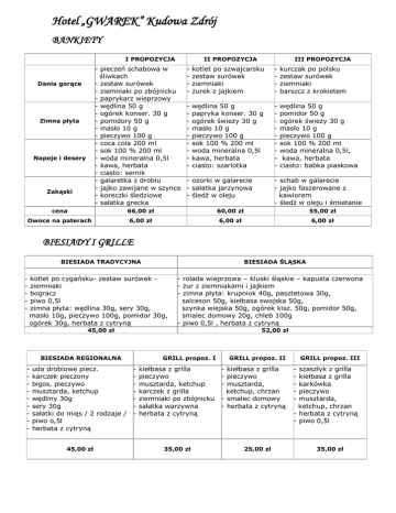 Hotel „GWAREK” Kudowa Zdrój BANKIETY I PROPOZYCJA II PROPOZYCJA - pieczeń schabowa w śliwkach - zestaw surówek - ziemniaki po zbójnicku - paprykarz wieprzowy - wędlina 50 g - ogórek konser. 30 g - pomidory 50 g - masło 10 g - pieczywo 100 g - coca cola 200 ml - sok 100 % 200 ml - woda mineralna 0,5l - kawa, herbata - ciasto: sernik - galaretka z drobiu - jajko zawijane w szynce - koreczki śledziowe - sałatka grecka Dania gorące Zimna płyta Napoje i desery Zakąski III PROPOZYCJA - kotlet po szwajcarsku zestaw surówek ziemniaki żurek z jajkiem - kurczak po polsku zestaw surówek ziemniaki barszcz z krokietem - wędlina 50 g papryka konser. 30 g ogórek świeży 30 g masło 10 g pieczywo 100 g sok 100 % 200 ml woda mineralna 0,5l kawa, herbata ciasto: szarlotka - wędlina 50 g pomidor 50 g ogórek świeży 30 g masło 10 g pieczywo 100 g sok 100 % 200 ml woda mineralna 0,5l, kawa, herbata ciasto: babka piaskowa - ozorki w galarecie - sałatka jarzynowa - śledź w oleju - schab w galarecie - jajko faszerowane z kawiorem - śledź w oleju i śmietanie cena 66,00 zł 60,00 zł 55,00 zł Owoce na paterach 6,00 zł 6,00 zł 6,00 zł BIESIADY I GRILLE BIESIADA TRADYCYJNA - BIESIADA ŚLĄSKA kotlet po cygańsku- zestaw surówek ziemniaki bogracz piwo 0,5l zimna płyta: wędlina 30g, sery 30g, masło 10g, pieczywo 100g, pomidor 30g, ogórek 30g, herbata z cytryną - rolada wieprzowa – kluski śląskie – kapusta czerwona - żur z ziemniakami i jajkiem - zimna płyta: krupniok 40g, pasztetowa 30g, salceson 50g, kiełbasa swojska 50g, szynka wiejska 50g, ogórek kisz. 50g, pomidor 50g, smalec domowy 20g, chleb 100g - piwo 0,5l , herbata z cytryną 45,00 zł 52,00 zł BIESIADA REGIONALNA - uda drobiowe piecz. karczek pieczony bigos, pieczywo musztarda, ketchup wędliny 30g sery 30g sałatki do mięs / 2 rodzaje / piwo o,5l herbata z cytryną 45,00 zł - GRILL propoz. I GRILL propoz. II kiełbasa z grilla pieczywo musztarda, ketchup karczek z grilla ziemniaki po zbójnicku sałatka warzywna herbata z cytryną - kiełbasa z grilla - pieczywo - musztarda, ketchup, chrzan - smalec domowy - herbata z cytryną 35,00 zł 25,00 zł GRILL propoz. III - szaszłyk z grilla kiełbasa z grilla karkówka pieczywo musztarda, ketchup, chrzan - herbata z cytryną - piwo 0,5l 35,00 zł