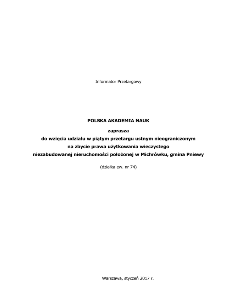 Informator Przetargowy POLSKA AKADEMIA NAUK zaprasza do wzięcia udziału w piątym przetargu ustnym nieograniczonym na zbycie prawa użytkowania wieczystego niezabudowanej nieruchomości położonej w Michrówku, gmina Pniewy (działka ew. nr 74) Warszawa, styczeń 2017 r. INFORMACJA O NIERUCHOMOŚCI Zakres szczegółowy oferty nieruchomości przeznaczonej do sprzedaży Podstawa zbycia prawa użytkowania wieczystego w drodze ustnego przetargu nieograniczonego nieruch omości Zarządzenie Nr 6/2017 Kanclerza Polskiej Akademii Nauk z dnia 23 stycznia 2017 roku w sprawie wyrażenia zgody na sprzedaż prawa użytkowania wieczystego nieruchomości położonej w Michrówku, gmina Pniewy. Położenie nieruchomości Nieruchomość położona jest na terenie gminy Pniewy, w miejscowości Michrówek. Michrówek znajduje się w północnej części gminy, w odległości ok. 6 km od siedziby gminy, 15 km od Grójca, 26 km od Janek. Orientacyjne położenie nieruchomości na mapie: 2 Opis nieruchomości Przedmiotowa nieruchomość stanowi działkę o numerze ewidencyjnym 74. Przedmiotowa działka jest działką niezabudowaną oraz nieogrodzoną, użytkowaną rolniczo. Nieruchomość opisana jest w załączonym wypisie z rejestru gruntów: 3 Stan prawny nieruchomości Przedmiotową nieruchomość stanowi grunt oznaczony w ewidencji, jako działka nr 74 o pow. 2,21 ha, obręb Michrówek, gmina Pniewy, powiat grójecki, województwo mazowieckie, dla której Sąd Rejonowy w Grójcu, V Wydział Ksiąg Wieczystych prowadzi księgę wieczystą RA1G/00029458/8. Działka gruntu w wieczystym użytkowaniu od dnia 19 stycznia 1994 r. Właścicielem nieruchomości jest Skarb Państwa, a Polska Akademia Nauk jest jej użytkownikiem wieczystym. Dział III i Dział IV nie zawierają wpisów. Ustalenia planu miejscowego dla terenu Zgodnie z ustaleniami Miejscowego Planu Zagospodarowania Przestrzennego gminy Pniewy, zatwierdzonego Uchwałą Nr XXIX/208/2002 Rady Gminy z dnia 28 czerwca 2002 r. teren, na którym znajduje się działka ewidencyjna nr 74, oznaczony jest symbolem R – tereny gruntów upraw polowych i sadowniczych. Zakres finansowy oferty Przedmiotem sprzedaży jest prawo wieczystego użytkowania gruntu, oznaczonego jako działki nr 74 z obrębu Michrówek. Cena wywoławcza oraz wysokość wadium przedstawiają się następująco: Cena wywoławcza: 155 000,00 PLN Wysokość wadium: 15 500,00 PLN Osoby przystępujące do przetargu muszą przedłożyć komisji przetargowej, w dniu przetargu dowód wpłaty wadium, dokument tożsamości, a osoby reprezentujące firmy lub spółki, dodatkowo aktualny wypis z odpowiedniego rejestru lub ewidencji działalności gospodarczej wraz z ważnym pełnomocnictwem. Obowiązuje postąpienie nie mniej niż 1 550,00 zł, przy czym wymagane jest co najmniej jedno postąpienie. Sprzedaż nieruchomości zwolniona jest z podatku VAT - art. 43 ust. 1 pkt 9 ustawy o VAT Nabywcy i zbywcy przysługuje prawo rezygnacji ze zwolnienia i objęcia sprzedaży podatkiem pod warunkiem zgody uzyskanej z urzędu skarbowego właściwego dla nabywcy. W takim przypadku oferent zobowiązany jest dołączyć do „Zgłoszenia udziału w przetargu” stosowne oświadczenie. Koszty związane z podpisaniem umowy sprzedaży ponosi kupujący. Informacje o trybie przeprowadzenia przetargu Sprzedaż zostanie przeprowadzona w trybie ustnego przetargu nieograniczonego. Warunkiem udziału w przetargu jest wniesienie wadium w pieniądzu, w wysokości określonej w ogłoszeniu, na rachunek Polskiej Akademii Nauk nr 38 1130 1017 0020 1462 9420 0006 do dnia 17 lutego 2017 roku. Za datę wpływu uważać się będzie dzień wpływu wadium na konto PAN. 4 Wadium zostanie zwrócone uczestnikom niezwłocznie po odwołaniu albo zamknięciu przetargu, jednak nie później niż przed upływem 3 dni od dnia odpowiednio: odwołania przetargu, zamknięcia przetargu, unieważnienia przetargu, zakończenia przetargu wynikiem negatywnym. Wadium przepada na rzecz Polskiej Akademii Nauk, w przypadku uchylenia się od zawarcia umowy przez osobę, która wygra przetarg. Wadium wpłacone przez osobę, która wygra przetarg, zostanie zaliczone na poczet ceny nabycia nieruchomości. Przetarg na sprzedaż prawa użytkowania wieczystego do działki ew. nr 74 odbędzie się w dniu 23 lutego 2017 r. o godz. 10.00 w siedzibie Polskiej Akademii Nauk w Warszawie, PKiN, Plac Defilad 1, piętro XXV, pok. 2513. 5