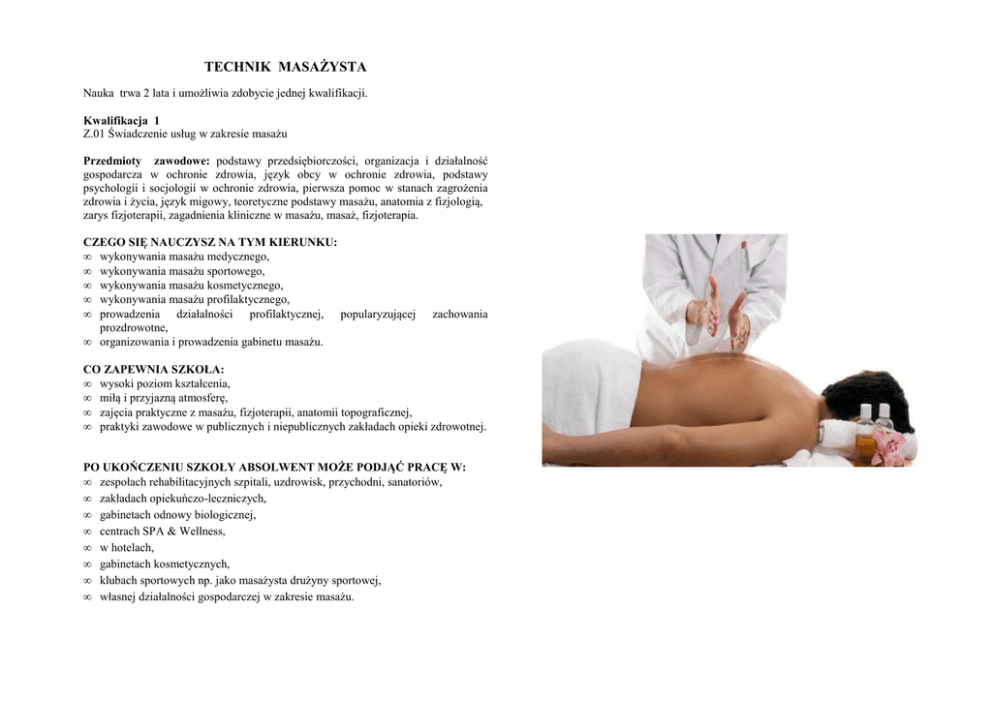 TECHNIK MASAŻYSTA Nauka trwa 2 lata i umożliwia zdobycie jednej kwalifikacji. Kwalifikacja 1 Z.01 Świadczenie usług w zakresie masażu Przedmioty zawodowe: podstawy przedsiębiorczości, organizacja i działalność gospodarcza w ochronie zdrowia, język obcy w ochronie zdrowia, podstawy psychologii i socjologii w ochronie zdrowia, pierwsza pomoc w stanach zagrożenia zdrowia i życia, język migowy, teoretyczne podstawy masażu, anatomia z fizjologią, zarys fizjoterapii, zagadnienia kliniczne w masażu, masaż, fizjoterapia. CZEGO SIĘ NAUCZYSZ NA TYM KIERUNKU: • wykonywania masażu medycznego, • wykonywania masażu sportowego, • wykonywania masażu kosmetycznego, • wykonywania masażu profilaktycznego, • prowadzenia działalności profilaktycznej, popularyzującej prozdrowotne, • organizowania i prowadzenia gabinetu masażu. zachowania CO ZAPEWNIA SZKOŁA: • wysoki poziom kształcenia, • miłą i przyjazną atmosferę, • zajęcia praktyczne z masażu, fizjoterapii, anatomii topograficznej, • praktyki zawodowe w publicznych i niepublicznych zakładach opieki zdrowotnej. PO UKOŃCZENIU SZKOŁY ABSOLWENT MOŻE PODJĄĆ PRACĘ W: • zespołach rehabilitacyjnych szpitali, uzdrowisk, przychodni, sanatoriów, • zakładach opiekuńczo-leczniczych, • gabinetach odnowy biologicznej, • centrach SPA & Wellness, • w hotelach, • gabinetach kosmetycznych, • klubach sportowych np. jako masażysta drużyny sportowej, • własnej działalności gospodarczej w zakresie masażu.