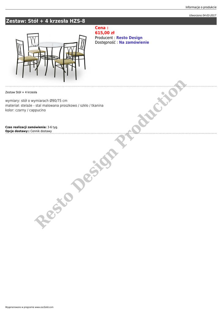 Informacje o produkcie Utworzono 04-03-2017 Zestaw: Stół + 4 krzesła HZS-8 Cena : 615,00 zł Zestaw Stół + 4 krzesła wymiary: stół o wymiarach Ø90/75 cm materiał: stelaże - stal malowana proszkowo / szkło / tkanina kolor: czarny / cappucino R es t o D es ig n Czas realizacji zamówienia: 3-6 tyg. Opcje dostawy:: Cennik dostawy Pr od uc ti o n Producent : Resto Design Dostępność : Na zamówienie Wygenerowano w programie www.oscGold.com
