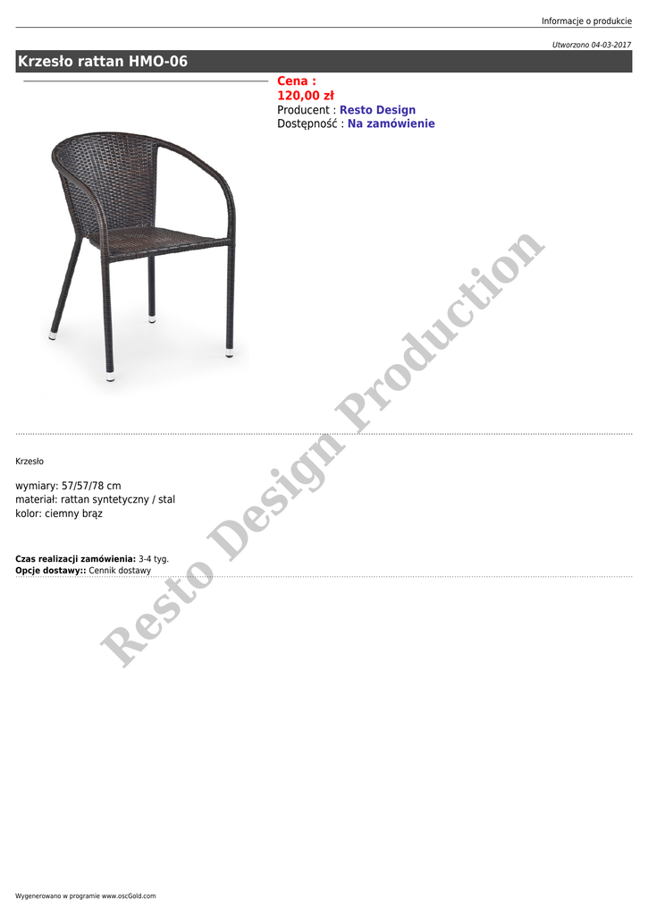 Informacje o produkcie Utworzono 04-03-2017 Krzesło rattan HMO-06 Cena : 120,00 zł ig n Pr od uc ti o n Producent : Resto Design Dostępność : Na zamówienie wymiary: 57/57/78 cm materiał: rattan syntetyczny / stal kolor: ciemny brąz R es t o Czas realizacji zamówienia: 3-4 tyg. Opcje dostawy:: Cennik dostawy D es Krzesło Wygenerowano w programie www.oscGold.com