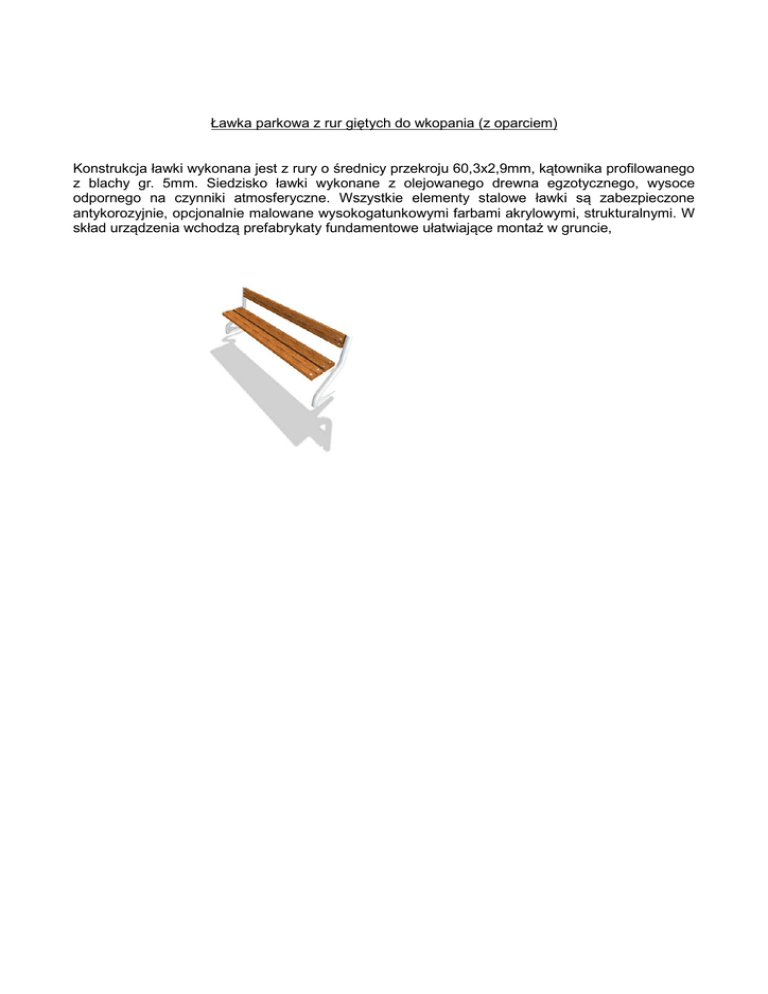 Ławka parkowa z rur giętych do wkopania (z oparciem) Konstrukcja ławki wykonana jest z rury o średnicy przekroju 60,3x2,9mm, kątownika profilowanego z blachy gr. 5mm. Siedzisko ławki wykonane z olejowanego drewna egzotycznego, wysoce odpornego na czynniki atmosferyczne. Wszystkie elementy stalowe ławki są zabezpieczone antykorozyjnie, opcjonalnie malowane wysokogatunkowymi farbami akrylowymi, strukturalnymi. W skład urządzenia wchodzą prefabrykaty fundamentowe ułatwiające montaż w gruncie,