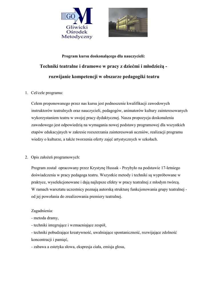Program kursu doskonalącego dla nauczycieli: Techniki teatralne i dramowe w pracy z dziećmi i młodzieżą rozwijanie kompetencji w obszarze pedagogiki teatru 1. Cel/cele programu: Celem proponowanego przez nas kursu jest podnoszenie kwalifikacji zawodowych instruktorów teatralnych oraz nauczycieli, pedagogów, animatorów kultury zainteresowanych wykorzystaniem teatru w swojej pracy dydaktycznej. Nasza propozycja doskonalenia zawodowego jest odpowiedzią na wymagania nowej podstawy programowej dla wszystkich etapów edukacyjnych w zakresie rozszerzania zainteresowań uczniów, realizacji programu wiedzy o kulturze, a także tworzenia oferty zajęć artystycznych w szkołach. 2. Opis założeń programowych: Program został opracowany przez Krystynę Hussak - Przybyło na podstawie 17-letniego doświadczenia w pracy pedagoga teatru. Wszystkie metody i techniki są wypróbowane w praktyce, wyselekcjonowane i dają najlepsze efekty w pracy teatralnej z młodym twórcą. W ramach warsztatu uczestnicy poznają autorską strukturę funkcjonowania grupy teatralnej od jej powołania do zrealizowania premiery teatralnej. Zagadnienia: - metoda dramy, - techniki integrujące i wzmacniające zespół, - techniki pobudzające kreatywność, uwalniające spontaniczność, rozwijające zdolność koncentracji i pamięć, - zabawa a estetyka słowa, ekspresja ciała, emisja głosu, - dobór i opracowanie repertuaru, - opracowanie koncepcji formalnej spektaklu, - istota premiery. 3. Uczestnicy programu (opis grupy docelowej): instruktorzy teatralni, pedagodzy, animatorzy kultury, osoby prowadzące koła teatralne w placówkach oświatowych oraz wszyscy zainteresowani, którzy mają już pewne doświadczenie w pracy teatralnej z dziećmi i młodzieżą, jak również ci, którzy dopiero planują organizację koła teatralnego 4. Opis działań/harmonogram: Czas trwania kursu - 24 godziny. Szczegółowa tematyka kursu obejmuje następujące tematy: 7 stycznia 2017 r. Metoda DRAMY w pracy teatralnej z młodym twórcą. 4 lutego 2017 r. Podstawowe elementy reżyserii teatru dzieci i młodzieży. 4 marca 2017 r. Dobór i opracowanie repertuaru - jak korzystać ze współczesnej dramaturgii dla dzieci i młodzieży oraz samodzielnie stworzyć tekst dla teatru . 1 kwietnia 2017 r. Techniki rozwijające estetykę słowa, emisję głosu, ekspresję ciała. 6 maja 2017 r. Opracowanie koncepcji formalnej spektaklu (zapoznanie z różnymi konwencjami teatralnymi: teatr lalki, teatr przedmiotu, teatr cieni itd.). 5. Osoba/y odpowiedzialne za realizację programu: Krystyna Hussak – Przybyło Absolwentka Pedagogiki Uniwersytetu Jagiellońskiego oraz Reżyserii Teatru Dzieci i Młodzieży w Państwowej Wyższej Szkole Teatralnej w Krakowie, stypendystka Ministra Kultury i Dziedzictwa Narodowego w 2012 r., laureatka Nagrody Prezydenta Krakowa w 2007 r i 2016 r. ,Nagrody Edukacyjnej Miasta Krakowa w 2011 r. oraz Nagrody im. L. Cyganika Za Wybitne Osiągnięcia w Teatrze Dzieci i Młodzieży w 2015 r. . Od 17 lat prowadzi Dziecięce Studio Teatralne WYJĄTEK przy Staromiejskim Centrum Kultury Młodzieży w Krakowie. Spektakle wyreżyserowane przez Krystynę Hussak-Przybyło otrzymały wiele prestiżowych nagród w Polsce i zagranicą. Od 2000 r. współpracuje z Narodowym Starym Teatrem w Krakowie, gdzie przygotowała obsady dziecięce do następujących spektakli: "Lunatycy" oraz "Mistrz i Małgorzata" Krystiana Lupy, "Makbet" Andrzeja Wajdy, "Trzystygmaty Palmera Spotkania odbywać się będą od stycznia 2017 r. w każdą pierwszą sobotę miesiąca w godzinach 10:00 – 14:00 w Teatrze Miejskim w Gliwicach. Kurs zakończy się otrzymaniem certyfikatu. Cena całego kursu: 200 zł Wpłata za udział w kursiena konto: Teatr Miejski w Gliwicach 44-100 Gliwice, ul. Nowy Świat 55/57 ING Bank Śląski SA nr 36 1050 1298 1000 0090 3027 7637 ____________________________________________________________________________ ul. Okrzei 20 44-100 Gliwice NIP 631-23-54-314 Tel. Fax +48 32/302 19 90 www.gom.gliwice.pl +48 32/302 19 91 [email protected] Nr konta 46 1050 1285 1000 0023 3732 2883