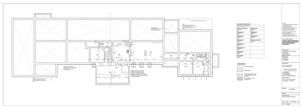 A likwidacja ściany tarasowej do poziomu gruntu ZESTAWIENIE POMIESZCZEŃ cokół: -czyszczenie, wykonanie tynku tynku cementowo-wapiennego wykonanie równej powierzchni pod tynk cokołu -tynk cieńkowarstwowy wodoodporny kolor ciemny 2x masa asfaltowa przeciwwilgociowa typu Abizol R+P poniŜej poziomu gruntu ściana zewnętrzna murowana POMIESZCZENIA PIWNICY montaŜ drzwiczek rewizyjnych 2 szt zamkniecie przewodu wentylacyjnego 22 0.12 12x19,5x28 12 W. @ 19 cm 11 Sz. @ 28 cm schody projektowane wg odrebnego opracowania -2,35 9x17,2 30 100 140 montaŜ drzwiczek rewizyjnych 0.09 KLATKA SCHODOWA SKŁAD OPAŁU posadzka beton. 6,79 m2 posadzka beton. 43,02 m2 0.02 0.10 POM.PIWNICY POM.PIWNICY posadzka beton. 4,99 m2 posadzka beton. 15,67 m2 0.03 0.11 POM.PIWNICY KOMUNIKACJA posadzka beton. 10,44 m2 posadzka beton. 7,91 m2 0.04 0.12 POM.PIWNICY KLATKA SCHODOWA posadzka beton. 12,85 m2 posadzka beton. 6,54 m2 0.05 KOMUNIKACJA 100 197 posadzka beton. 6,90 m2 otwory drzwiowe wg odrebnego projektu kotłowni 29 0.01 UWAGA: 1) Wszystkie prace wykonać zgodnie ze sztuką budowlaną oraz obowiązującymi normami. 2) W razie wystapienia problemów nie objetych opracowaniem naleŜy skontaktować się z projektantem. 3) Rozwiązania warsztatowe naleŜy omówić z projektantem. 4) Przed przystapieniem do robót budowlanych naleŜy sprawdzić wymiary oraz ilości na miejscu budowy. TYTUŁ OPRACOWANIA: PROJEKT TERMOMODERNIZACJI ORAZ PRZEBUDOWY BUDYNKU SZKOŁY PODSTAWOWEJ W GODOWIE 0.06 16 KOMUNIKACJA 99 posadzka beton. 6,02 m2 160 200 82 196 0.11 576 0.07 posadzka beton. 50,60 m2 42 450 42 d16 387 40 84 197 44 355 462 d17 hp=128 hp=128 10 203 OZNACZENIA: ŚCIANY ISTNIEJĄCE 90 57 183 O3 hp=128 hp=128 hp=128 hp=128 100 57 100 57 85 hp=128 O4 O4 O4 O4 O4 PROJEKTANT: mgr inŜ. Roman Mucha nr uprawnień 89/02 BIURO INśYNIERSKIE WYBURZENIA 100 57 58 Uwaga: Roboty oraz wszelkie przeróbki budowlane w piwnicy, zwiazane z projektem kotłowni uwzglednione w odrebnym projekcie. Naniesione zmiany na rzucie piwnic wg opracowania kotłowni 0.03 ŚCIANY PROJEKTOWANE / ZAMUROWANIA ściany z typy Ytong ŚCIANY LEKKIE Z PŁYT GIPSOWYCH mgr inŜ. Roman Mucha Ul. Mariańska 9 47-460 Racibórz tel.: 032/4152586 e-mail : [email protected] SPRAWDZAJĄCY: mgr inŜ. arch. Bernard Łopacz nr uprawnień 171/91/OP A 229 25 O3 0.04 100 57 projektowana konstrukcja wsporcza płyty nad składem węgla 350 272 100 57 O3 90 57 90 57 25 25 25 EI 60 90 57 350 25 INWESTOR: Gmina Godów ul. 1 Maja 53 44-340 Godów posadzka beton. 25,07 m2 0.01 0.02 0.09 57 KOTŁOWNIA hp=128 355 elemenyt zsypu wg odrebnego opracoawnia cokół: -czyszczenie, uzupełnienie tynku, wykonanie równej powierzchni pod tynk cokołu -tynk cieńkowarstwowy wodoodporny kolor ciemny 115 280 94 EI 60 O3 25 90 otwory drzwiowe wg odrebnego projektu kotłowni EI 60 styropian EPS 100 gr.10 cm 2x masa asfaltowa przeciwwilgociowa typu Izoplast KL poniŜej poziomu gruntu tynk kat I/rapówka ściana zewnętrzna murowana 84 197 0.08 12 W. @ 19 cm 12x19,5x25 11 Sz. @ 25 cm 86 190 100 200 376 -2,30 0.05 84 190 otwory drzwiowe wg odrebnego projektu kotłowni 0.06 84 190 84 190 194 montaŜ drzwiczek rewizyjnych 2szt 27 -2,30 150 210 hp=128 montaŜ drzwiczek rewizyjnych 4 szt. 8x194 196 POM.PIWNICY 100 200 15 d16 385 0.08 100 balustrada stalowa schody projektowane wg odrebnego opracowania 175 292 0.10 30 LOKALIZACJA: Szkoła Podstawowa w Godowie ul. Szkolna 11 44-340 Godów działka nr 683/143 0.07 -3,90 RYSUNEK rzut piwnic FORMAT OPRACOWAŁA: mgr inŜ.arch. Beata Drewniok SKALA DATA 1:100 NR RYSUNKU A1 12.2012