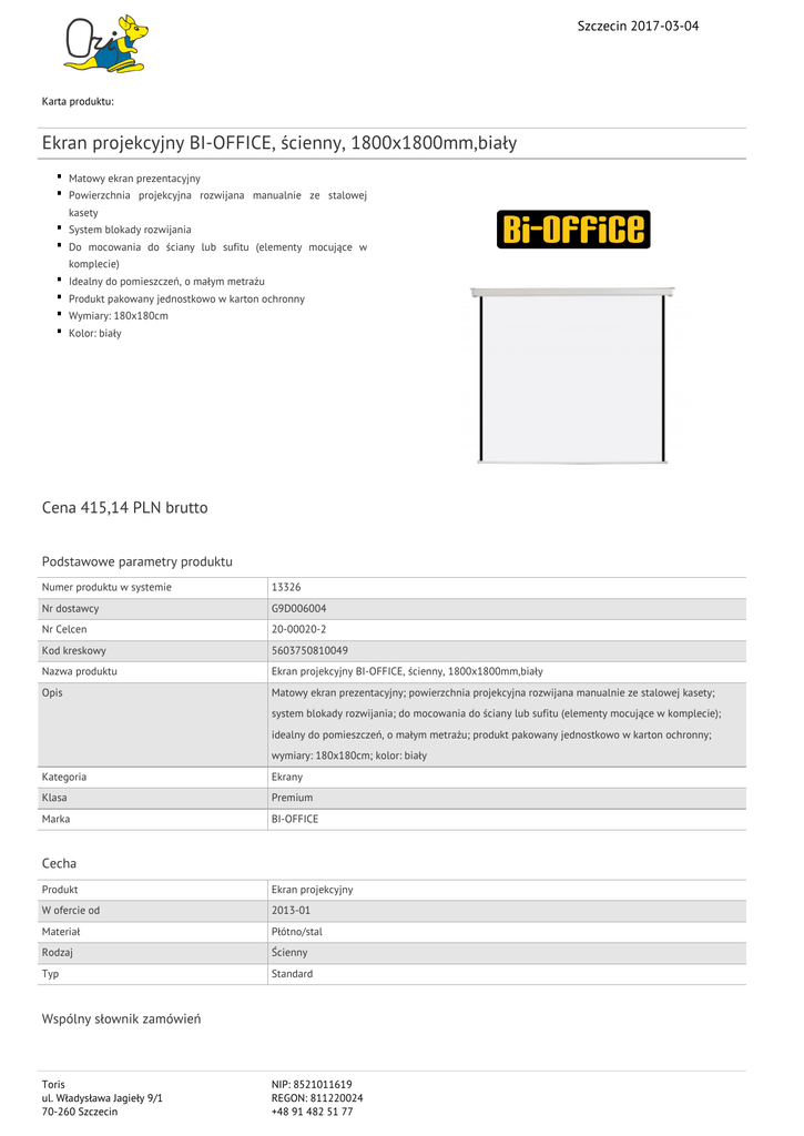 Szczecin 2017-03-04 Karta produktu: Ekran projekcyjny BI-OFFICE, ścienny, 1800x1800mm,biały Matowy ekran prezentacyjny Powierzchnia projekcyjna rozwijana manualnie ze stalowej kasety System blokady rozwijania Do mocowania do ściany lub sufitu (elementy mocujące w komplecie) Idealny do pomieszczeń, o małym metrażu Produkt pakowany jednostkowo w karton ochronny Wymiary: 180x180cm Kolor: biały Cena 415,14 PLN brutto Podstawowe parametry produktu Numer produktu w systemie 13326 Nr dostawcy G9D006004 Nr Celcen 20-00020-2 Kod kreskowy 5603750810049 Nazwa produktu Ekran projekcyjny BI-OFFICE, ścienny, 1800x1800mm,biały Opis Matowy ekran prezentacyjny; powierzchnia projekcyjna rozwijana manualnie ze stalowej kasety; system blokady rozwijania; do mocowania do ściany lub sufitu (elementy mocujące w komplecie); idealny do pomieszczeń, o małym metrażu; produkt pakowany jednostkowo w karton ochronny; wymiary: 180x180cm; kolor: biały Kategoria Ekrany Klasa Premium Marka BI-OFFICE Cecha Produkt Ekran projekcyjny W ofercie od 2013-01 Materiał Płótno/stal Rodzaj Ścienny Typ Standard Wspólny słownik zamówień Toris ul. Władysława Jagieły 9/1 70-260 Szczecin NIP: 8521011619 REGON: 811220024 +48 91 482 51 77 Szczecin 2017-03-04 Karta katalogowa produktu cd. Ekran projekcyjny BI-OFFICE, ścienny, 1800x1800mm,biały CPV 30237210-4 Ekrany antyodblaskowe Certyfikaty Nowy produkt w ofercie Standard Hit Standard Kolor Kolor Biały Wymiary Wymiary (mm) 1800x1800 Serdecznie zapraszamy do współpracy Toris zespół. Toris ul. Władysława Jagieły 9/1 70-260 Szczecin NIP: 8521011619 REGON: 811220024 +48 91 482 51 77