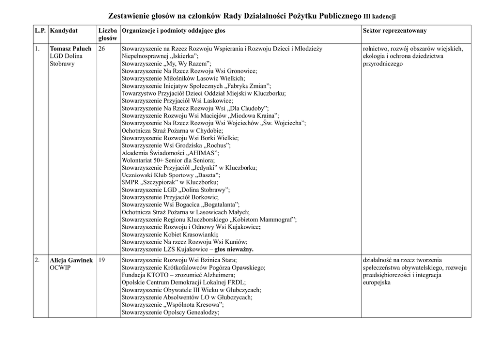 Zestawienie głosów na członków Rady Działalności Pożytku Publicznego III kadencji L.P. Kandydat Liczba Organizacje i podmioty oddające głos głosów 1. Tomasz Paluch LGD Dolina Stobrawy 26 2. Alicja Gawinek 19 OCWIP Sektor reprezentowany Stowarzyszenie na Rzecz Rozwoju Wspierania i Rozwoju Dzieci i Młodzieży Niepełnosprawnej „Iskierka”; Stowarzyszenie „My, Wy Razem”; Stowarzyszenie Na Rzecz Rozwoju Wsi Gronowice; Stowarzyszenie Miłośników Lasowic Wielkich; Stowarzyszenie Inicjatyw Społecznych „Fabryka Zmian”; Towarzystwo Przyjaciół Dzieci Oddział Miejski w Kluczborku; Stowarzyszenie Przyjaciół Wsi Laskowice; Stowarzyszenie Na Rzecz Rozwoju Wsi „Dla Chudoby”; Stowarzyszenie Rozwoju Wsi Maciejów „Miodowa Kraina”; Stowarzyszenie Na Rzecz Rozwoju Wsi Wojciechów „Św. Wojciecha”; Ochotnicza Straż Pożarna w Chydobie; Stowarzyszenie Rozwoju Wsi Borki Wielkie; Stowarzyszenie Wsi Grodziska „Rochus”; Akademia Świadomości „AHIMAS”; Wolontariat 50+ Senior dla Seniora; Stowarzyszenie Przyjaciół „Jedynki” w Kluczborku; Uczniowski Klub Sportowy „Baszta”; SMPR „Szczypiorak” w Kluczborku; Stowarzyszenie LGD „Dolina Stobrawy”; Stowarzyszenie Przyjaciół Borkowic; Stowarzyszenie Wsi Bogacica „Bogatalanta”; Ochotnicza Straż Pożarna w Lasowicach Małych; Stowarzyszenie Regionu Kluczborskiego „Kobietom Mammograf”; Stowarzyszenie Rozwoju i Odnowy Wsi Kujakowice; Stowarzyszenie Kobiet Krasowianki; Stowarzyszenie Na rzecz Rozwoju Wsi Kuniów; Stowarzyszenie LZS Kujakowice – głos nieważny. rolnictwo, rozwój obszarów wiejskich, ekologia i ochrona dziedzictwa przyrodniczego Stowarzyszenie Rozwoju Wsi Bzinica Stara; Stowarzyszenie Krótkofalowców Pogórza Opawskiego; Fundacja KTOTO – zrozumieć Alzheimera; Opolskie Centrum Demokracji Lokalnej FRDL; Stowarzyszenie Obywatele III Wieku w Głubczycach; Stowarzyszenie Absolwentów LO w Głubczycach; Stowarzyszenie „Wspólnota Kresowa”; Stowarzyszenie Opolscy Genealodzy; działalność na rzecz tworzenia społeczeństwa obywatelskiego, rozwoju przedsiębiorczości i integracja europejska Stowarzyszenie „Mój duch przyjazny”; Stowarzyszenie Rozwoju Wsi Lipowa; Stowarzyszenie Upowszechniania i Wspierania Sportów Modelarskich Klub Modelarski Zawadzkie; Fundacja Rozwój; Stowarzyszenie Rodzin Zastępczych „Dobra Rodzina” Stowarzyszenie Immaculata; Fundacja Promocji Aktywnego Trybu Życia RIAD; Fundacja Pomocy Dzieciom „Bądź Dobroczyńcą”; Stowarzyszenie Kulturalne Opole; Stowarzyszenie Przyjaciół LO im. Mickiewicza; Stowarzysznie Rozwoju Wsi Lipowa; Stowarzyszenie Klub Abstynenta Dziewięćsił – głos nieważny. 3. Maria Pobóg – Lenartowicz ZHP 9 Fundacja „Wiedzieć Więcej”; Fundacja CIS Ziemi Kozielskiej; Opolskie Bractwo Wojciechowe; Chorągiew Opolska ZHP; Polskie Towarzystwo Historyczne Oddział w Opolu; Towarzystwo Przyjaciół Chmielowic; Stowarzyszenie „Europa Iuvenis”; Towarzystwo Przyjaźni Polsko – Francuskiej Oddział Opole; Partnerstwo Borów Niemodlińskich. sport, turystyka, krajoznawstwo, ratownictwo i ochrona ludności 4. Władysław Sztefic Wojewódzkie Towarzystwo Walki z Kalectwem 5 Polski Związek Niewidomych Okręg Opolski; Opolskie Centrum Inicjatyw Pozarządowych; Polskie Stowarzyszenie Diabetyków Oddział Wojewódzki w Opolu; Polskie Stowarzyszenie Diabetyków Oddział Miejski w Opolu; Polski Związek Głuchych Oddział Opolski; Wojewódzkie Towarzystwo Walki z Kalectwem – głos nieważny; Miejski Ośrodek Pomocy Rodzinie – głos nieważny. ochrona zdrowia, pomoc społeczna oraz przeciwdziałanie uzależnieniom i wykluczeniu społecznemu 5. Amelia Gąsiorowska Tarnowiec wczoraj, dziś i jutro 4 Eksperci Techniczno – Motoryzacyjni „Rzeczoznawcy – PZM”; Uczniowski Klub Sportowy OKAY; Stowarzyszenie „Tarnowiec wczoraj, dziś i jutro”; Stowarzyszeni Na Rzecz Dzieci i Młodzieży Niepełnosprawnej „Jesteśmy Wyjątkowi”; Gminny Ośrodek Kultury w Lubszy; - głos nieważny. rolnictwo, rozwój obszarów wiejskich, ekologia i ochrona dziedzictwa przyrodniczego 6. 3 Arleta Augustyniak Fundacja Pomoc Pokrzywdzonym VICTIM Fundacja Pomoc Pokrzywdzonym VICTIM; Stowarzyszenie Quisisana; Towarzyszenie Przyjaciół Dzieci Opolski Oddział Regionalny w Opolu. ochrona zdrowia, pomoc społeczna oraz przeciwdziałanie uzależnieniom i wykluczeniu społecznemu Fundacja Menagerska CREATIVE; Fundacja Vithatherapy. działalność na rzecz tworzenia społeczeństwa obywatelskiego, rozwoju przedsiębiorczości i integracja europejska Dominika Bilik 1 OPAK Stowarzyszenie Opolski Projektor Animacji Kulturalnych kultura, sztuka i dziedzictwo narodowe 9. Helena Rożenek 1 Wojewódzkie Towarzystwo Walki z Kalectwem Brzeskie Stowarzyszenie Promocji Zdrowia ochrona zdrowia, pomoc społeczna oraz przeciwdziałanie uzależnieniom i wykluczeniu społecznemu 10. Anetta Sałacka Ludowy Klub Jeździecki „Lewada” Jezuicki Ośrodek Formacji i Kultury „Xaverianum” sport, turystyka, krajoznawstwo, ratownictwo i ochrona ludności 7. Monika Kościów Fundacja Menagerska CREATIVE 8. 2 1 REZYGNACJA KANDYDATA 11. 0 Irena Kalita Towarzystwo Miłośników Lwowa i Kresów Płd.-Wsch. - działalność na rzecz mniejszości narodowych i etnicznych oraz języka regionalnego 12. Ewa Kosowska 0 – Korniak Fundacja Pomoc Pokrzywdzonym VICTIM - ochrona zdrowia, pomoc społeczna oraz przeciwdziałanie uzależnieniom i wykluczeniu społecznemu 13. 0 Przemysław Malinowski Fundacja Pomoc Pokrzywdzonym VICTIM - ochrona zdrowia, pomoc społeczna oraz przeciwdziałanie uzależnieniom i wykluczeniu społecznemu
