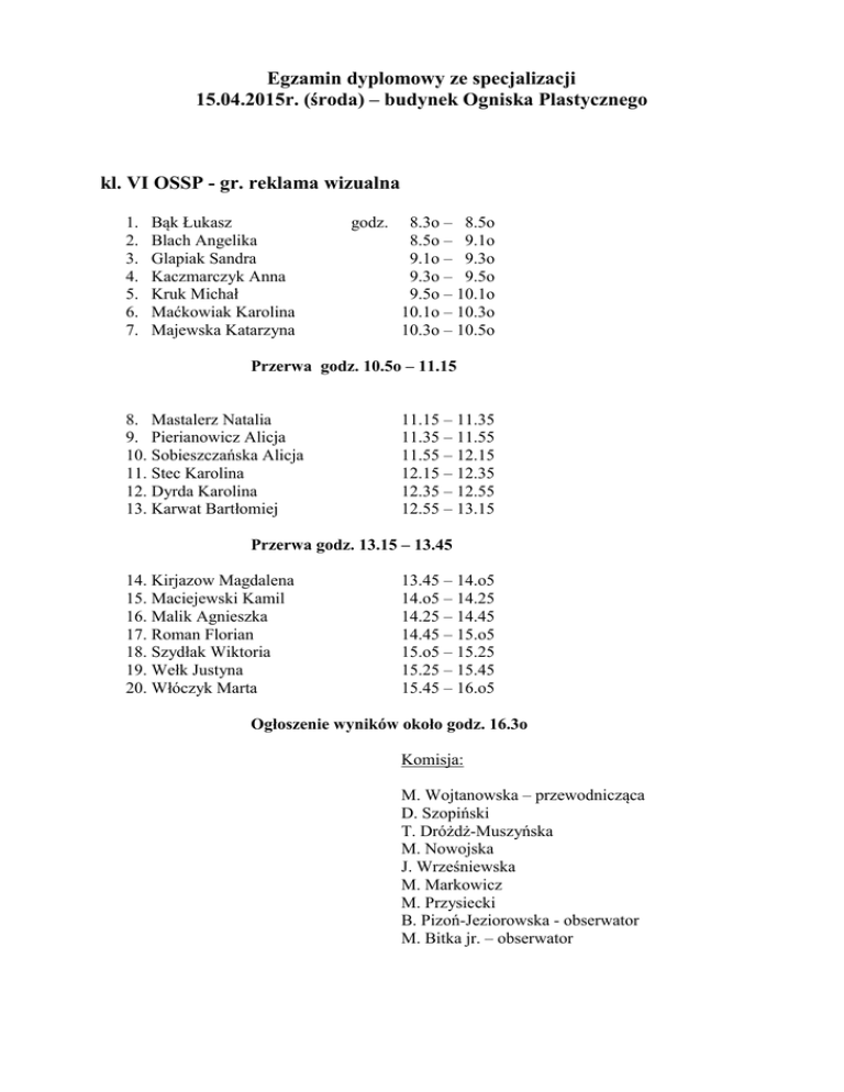 Egzamin dyplomowy ze specjalizacji 15.04.2015r. (środa) – budynek Ogniska Plastycznego kl. VI OSSP - gr. reklama wizualna 1. 2. 3. 4. 5. 6. 7. Bąk Łukasz Blach Angelika Glapiak Sandra Kaczmarczyk Anna Kruk Michał Maćkowiak Karolina Majewska Katarzyna godz. 8.3o – 8.5o 8.5o – 9.1o 9.1o – 9.3o 9.3o – 9.5o 9.5o – 10.1o 10.1o – 10.3o 10.3o – 10.5o Przerwa godz. 10.5o – 11.15 8. Mastalerz Natalia 9. Pierianowicz Alicja 10. Sobieszczańska Alicja 11. Stec Karolina 12. Dyrda Karolina 13. Karwat Bartłomiej 11.15 – 11.35 11.35 – 11.55 11.55 – 12.15 12.15 – 12.35 12.35 – 12.55 12.55 – 13.15 Przerwa godz. 13.15 – 13.45 14. Kirjazow Magdalena 15. Maciejewski Kamil 16. Malik Agnieszka 17. Roman Florian 18. Szydłak Wiktoria 19. Wełk Justyna 20. Włóczyk Marta 13.45 – 14.o5 14.o5 – 14.25 14.25 – 14.45 14.45 – 15.o5 15.o5 – 15.25 15.25 – 15.45 15.45 – 16.o5 Ogłoszenie wyników około godz. 16.3o Komisja: M. Wojtanowska – przewodnicząca D. Szopiński T. Dróżdż-Muszyńska M. Nowojska J. Wrześniewska M. Markowicz M. Przysiecki B. Pizoń-Jeziorowska - obserwator M. Bitka jr. – obserwator