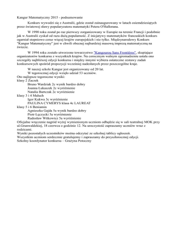 Kangur Matematyczny 2015 - podsumowanie Konkurs wywodzi się z Australii, gdzie został zainaugurowany w latach osiemdziesiątych przez światowej sławy popularyzatora matematyki Petera O'Hallorana. W 1990 roku został po raz pierwszy zorganizowany w Europie na terenie Francji i podobnie jak w Australii zyskał od razu dużą popularność. Z inicjatywy matematyków francuskich konkurs ogarniał stopniowo coraz więcej krajów europejskich i nie tylko. Międzynarodowy Konkurs "Kangur Matematyczny" jest w chwili obecnej najbardziej masową imprezą matematyczną na świecie. W 1994 roku zostało utworzone towarzystwo "Kangourou Sans Frontières", skupiające organizatorów konkursu z wszystkich krajów. Na corocznym walnym zgromadzeniu ustala ono szczegóły najbliższej edycji konkursu i między innymi wybiera ostateczne zestawy zadań konkursowych spośród propozycji wcześniej nadesłanych przez poszczególne kraje. W naszej szkole Kangur jest organizowany od 20 lat. W tegorocznej edycji wzięło udział 53 uczniów. Oto najlepsze tegoroczne wyniki: klasy 2 Żaczek Bruno Wardziak 2c wynik bardzo dobry Joanna Łukaszek 2c wyróżnienie Natalia Bartczak 2c wyróżnienie klasy 3 i 4 Maluch Igor Kukwa 3c wyróżnienie PAULINA CYMERYS klasa 4c LAUREAT klasy 5 i 6 Beniamin Agnieszka Gajda 5a wynik bardzo dobry Piotr Łęczycki 5a wyróżnienie Radosław Witkowicz 5a wyróżnienie Oficjalne wręczenie nagród wyżej wymienionym uczniom odbędzie się w sali teatralnej MOK przy ul.Grunwaldzkiej, 18 czerwca o godzinie 12. Na uroczystość zapraszamy uczniów wraz z rodzicami. Wyniki pozostałych uczestników można odczytać ze szkolnej tablicy ogłoszeń. Wszystkim uczniom serdecznie gratulujemy i zapraszamy do przyszłorocznej edycji. Szkolny koordynator konkursu – Grażyna Potoczny