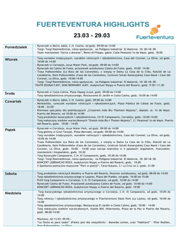 FUERTEVENTURA HIGHLIGHTS 23.03 - 29.03 Poniedziałek - Ryneczek w Morro Jable, C.H. Cosmo, od godz. 09:00 do 14:00 Targi: Targi Rzemieślnicze, rolno-spożywcze, na Polígono Industrial El Matorral, 10: 00-18: 00 Teatr marionetek “Serce z drewna”, Remo di Filippo, gdzie: Calle Peatonal 1o de Mayo, godz. 18:00 Wtorek - Targ wyrobów tradycyjnych, wyrobów rolniczych i rękodzielnictwa, Casa del Coronel, La Oliva, od godz. 10:00 do 14:00 - Ryneczek w Corralejo, Acua Water Park, od godz. 09:00 do 14:00 - Ryneczek de Caleta de Fuste, przystanek autobusowy Caleta de Fuste, godz. 10:00 -14:00 - Trasa Pułkowników (La Ruta de los Coroneles), z wizytą w Domu La Casa de la Cilla, Kościół de La Candelaria, Dom Pułkowników (Casa de los Coroneles), Centrum Sztuki Kanaryjskiej Casa Mané i Casa del Coronel, La Oliva, godz. 10:00:14:00 Targi: Targi Rzemieślnicze, rolno-spożywcze, na Polígono Industrial El Matorral, 10: 00-18: 00 TEATR EDUKACYJNY, DOM BERNARDY ALBY, Audytorium Wyspy w Puerto del Rosario, godz. 9:30 i 11:30 Środa - Ryneczek w Costa Calma, Plaza Hapag LLoyd, godz. 09:00 do 14:00 - Targ rękodzielnictwa artystycznego, Restaurante El Jardín w Costa Calma, godz. 10:00 do 14:00 Czwartek - Ryneczek w Morro Jable, C.H. Cosmo, godz. 09:00 do 14:00 - Merkastillo, ryneczek wyrobów rolniczych i rękodzielniczych, Plaza Pública de Caleat de Fuste, godz. 18:00 - 22:00 - Kiermasz specjalny dla podróżujących „Cruzerem Aida Blu Thomson Majesty”, deptak, ul. 1o de Mayo. Puerto del Rosario, od 10:00 do 14:00 Targ produktów kanaryjskich i rękodzielnictwa, CH El Campanario, Corralejo, godz. 10:00-14:00 Targ wakacyjny statków wycieczkowych “Statek Aida Blu i Thoson Majesty”, C/ Peatonal 1o de Mayo. Puerto del Rosario, godz. 10:00 - 14:00 Piątek -- Ryneczek w Corralejo, Acua Water Park, od godz. 09:00 do 14:00 WYSTAWA DAMASO W MAXORATA, Centrum Sztuki Juana Ismaela w Puerto del Rosario, godz. 20:00 Targ gminny w Gran Tarajal, Plaza Mercado, od godz. 09:00 do 14:00 Targ wyrobów tradycyjnych, wyrobów rolniczych i rękodzielnictwa, Casa del Coronel, La Oliva, od godz. 10:00 do 14:00 Trasa Pułkowników (La Ruta de los Coroneles), z wizytą w Domu La Casa de la Cilla, Kościół de La Candelaria, Dom Pułkowników (Casa de los Coroneles), Centrum Sztuki Kanaryjskiej Casa Mané i Casa del Coronel, La Oliva, godz. 10:00 - 14:00 oraz wersja teatralna w 4 językach: angielskim, francuskim, niemieckim i hiszpańskim, godz. 10:30 Targ Kanaryjski Campanario, C.H. El Campanario, godz. 10:30 do 14:00 Targi: Targi Rzemieślnicze, rolno-spożywcze, na Polígono Industrial El Matorral, 10: 00-18: 00 KONCERT LEBRANCHO ROCK, Audytorium Wyspy w Puerto del Rosario, godz. 19:00 II Spotkania poetyczno-muzyczne “Port w poezji”, Taras Kasyno, C/ La Cruz no 2, godz. 21:00 Sobota - Niedziela Targ kanaryjskiego rękodzielnictwa artystycznego w Corralejo, C.H. El Campanario, od godz. 10:00 do 14:00 - Targ rolniczy i rękodzielnictwa artystycznego w Fuerteventura Oasis Park (La Lajita), od godz. 10:00 do 14:00 - Targ rękodzielnictwa artystycznego, Restauracja El Jardín w Costa Calma, godz. 10:00 - 14:00 Targ wakacyjny statków wycieczkowych, Statek MSC (H)Armonia, Plaza de la Paz w Puerto del Rosario, godz. 08:00-14:00 Targ produktów rolniczych Biosfery w Puerto del Rosario, Dworzec Autobusowy, od godz. 08:00 do 14:00 Targ rękodzielnictwa artystycznego w Lajares, Plaza del Pueblo, od godz. 10:00 do 15:00 Pchli targ Campanario w Corralejo, C.H. El Campanario, od godz. 10:00 do 14:00 Ryneczek Caleta de Fuste, Przystanek autobusowy Caleta de Fuste, od godz. 10:00 do 14:00 KONCERT LEBRANCHO ROCK, Audytorium Wyspy w Puerto del Rosario, godz. 19:00 - Wystawy, od 13.03- 09.05.: - “La fiesta es para todos” (Fiesta jest dla wszystkich) - Moneiba Lemes, oraz “Habitare” - Pilar Rodiles, Dom Pułkowników, La Oliva