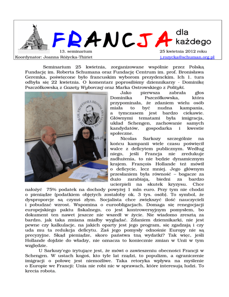 FRANCJA dla każdego 13. seminarium 25 kwietnia 2012 roku Koordynator: Joanna RóżyckaThiriet [email protected] Seminarium 25 kwietnia, zorganizowane wspólnie przez Polską Fundację im. Roberta Schumana oraz Fundację Centrum im. prof. Bronisława Geremka, poświęcone było francuskim wyborom prezydenckim. Ich 1. tura odbyła się 22 kwietnia. O komentarz poprosiliśmy dziennikarzy Dominikę Pszczółkowską z Gazety Wyborczej oraz Marka Ostrowskiego z Polityki. Jako pierwsza zabrała głos Dominika Pszczółkowska, która przypominała, że zdaniem wielu osób miała to być nudna kampania, a tymczasem jest bardzo ciekawie. Głównymi tematami była imigracja, układ Schengen, zachowanie samych kandydatów, gospodarka i kwestie społeczne. Nicolas Sarkozy szczególnie na końcu kampanii wiele czasu poświęcił walce z deficytem publicznym. Według niego, jeśli Francja nie zredukuje zadłużenia, to nie będzie dynamicznym krajem. François Hollande też mówił o deficycie, lecz mniej. Jego głównym przesłaniem była równość – bogacze za dużo zarabiają, biedni za bardzo ucierpieli na skutek kryzysu. Chce nałożyć 75% podatek na dochody powyżej 1 mln euro. Przy tym nie chodzi o pieniądze (podatkiem objętych zostałoby ok. 3 tys. osób). To symbol, że dysproporcje są czymś złym. Socjalista chce zwiększyć ilość nauczycieli i pobudzać wzrost. Wspomina o euroobligacjach. Domaga się renegocjacji europejskiego paktu fiskalnego, co jest kontrowersyjnym pomysłem, bo dokument ten nawet jeszcze nie wszedł w życie. Nie wiadomo zresztą za bardzo, jak taka zmiana miałby wyglądać. Zdaniem dziennikarki, nie jest pewne czy kalkulacje, na jakich oparty jest jego program, się zgadzają i czy uda mu ta redukcja deficytu. Zaś jego pomysły odnośnie Europy nie są precyzyjne. Skąd pieniądze, skoro państwa tną wydatki? Tak więc, jeśli Hollande dojdzie do władzy, nie oznacza to koniecznie zmian w Unii w tym względzie. U Sarkozy'ego irytujące jest, że mówi o zawieszeniu obecności Francji w Schengen. W ustach kogoś, kto tyle lat rządzi, to populizm, a ograniczenie imigracji o połowę jest niemożliwe. Taka retoryka wpływa na myślenie o Europie we Francji: Unia nie robi nic w sprawach, które interesują ludzi. To krecia robota. Zdaniem redaktor, zmiana u steru rządów nie zmieni stosunków polsko francuskich. Są kwestie, które nas różnią. Francja ma wizję Unii w węższym gronie. Francuzi chyba nie do końca pogodzili się z rozszerzeniem UE. Sądzą, że w mniejszym gronie było łatwiej się dogadać, a w mniejszej Unii Francja była większa. W ostatnich latach relacje dwustronne były dosyć chłodne, choć początki kadencji Sarkozy'ego były entuzjastyczne (ma korzenie w tej części Europy). Gdyby prezydentem został Hollande, może pomogłoby jego pojednawcze nastawienie. Co nie zmienia faktu, że w sprawach zasadniczych zmian nie będzie. Zresztą dla Polski najważniejsza jest walka z kryzysem w Unii. Z opiniami Dominiki Pszczółkowskiej zgodził się Marek Ostrowski. Dodał, że w Polsce nie bardzo wiadomo, jak mówić o Francji. Francuzi nie są lubiani. Traktują się jak wynalazców oświecenia, praw człowieka, katedr. Z drugiej strony we Francji jest coś, co każe nam się nią zachwycać. Redaktor Ostrowski podkreślił, że prawdziwe problemy Polski nie są związane z Francją czy Niemcami. To szkolnictwo, koleje itd. Hollande słusznie mówi o stymulacji gospodarki, ale gdzie się to udało za publiczne pieniądze? Państwo powinno wykształcić obywateli. Ten dziennikarz uważa, że renegocjacja paktu fiskalnego jest niebezpieczna. na jego negocjowanie stracono mnóstwo czasu, a teraz miałoby się to zacząć od nowa? Jakie są różnice między kandydatami? Marek Ostrowski przypomniał, że objęcie władzy przez lewicę w 1981 roku przyniosło ogromną zmianę. Np. znacjonalizowano wszystkie banki, wprowadzono ograniczenia w wywozie waluty z kraju. Po 18 miesiącach François Mitterrand wycofuje się z socjalizmu, ponieważ Francja nie wytrzymywała jego dobrodziejstw. Francuzi otrzymali podwyżki, ale zaczęli za nie kupować zagraniczne produkty. O tej lekcji Hollande powinien pamiętać. Między dwoma kandydatami jest też różnica wrażliwości. Są przywiązani do innych wartości. Ponadto Sarkozy jest prezydentem bez klasy, w niefrancuskim stylu. Aktualny prezydent stawia na przedsiębiorczość, podczas gdy Hollande stawia na równość i likwidację przywilejów. Na marginesie, to Francja jako pierwsza zaczęła mówić po kryzysie 2008 roku o niesprawiedliwym podziale dóbr, o tym, że bankierzy za dużo zarabiają. Dominka Pszczółkowska dodała, że kandydatów różni też podejście do prawa wyborczego dla cudzoziemców w wyborach lokalnych (chodzi głównie o muzułmanów). Hollande jest na tak. Mają inne podejście do ślubów homoseksualnych. W teorii mają odmienny stosunek do imigracji. Kolejnym wątkiem w dyskusji była kampania wyborcza i jej forma. Redaktor Ostrowski przypomniał, że „The Economist” wykpił, iż kandydaci nie mówili Francuzom prawdy o potrzebie oszczędności. Więcej o tym wspominał Sarkozy (zdaniem Dominiki Pszczółkowskiej po lekturze wymienionego artykułu). Wyborcze obietnice Hollande'a szacowane są na 50 mld euro, Sarkozy'ego na 25 mld. Kandydaci, według redaktora Ostrowskiego, wykazali się brakiem odpowiedzialności, ale czy wyborcy chcieliby tego słuchać? Marek Ostrowski przyznał, że francuska praktyka rozsyłania ulotek wyborczych wszystkich kandydatów do wyborców jest sensowna – może ogranicza demagogię. Także francuska telewizja jest na wyższym poziomie niż nasza – tamtejsze programy są o czymś. Dominika Pszczółkowska wskazała, że we Francji plakaty wyborcze mogą być rozklejane wyłącznie w miejscach do tego przeznaczonych, na specjalnych tablicach, których jest tyle, ile kandydatów. Nie ma reklam wielkoformatowych. Mimo to kampanie są