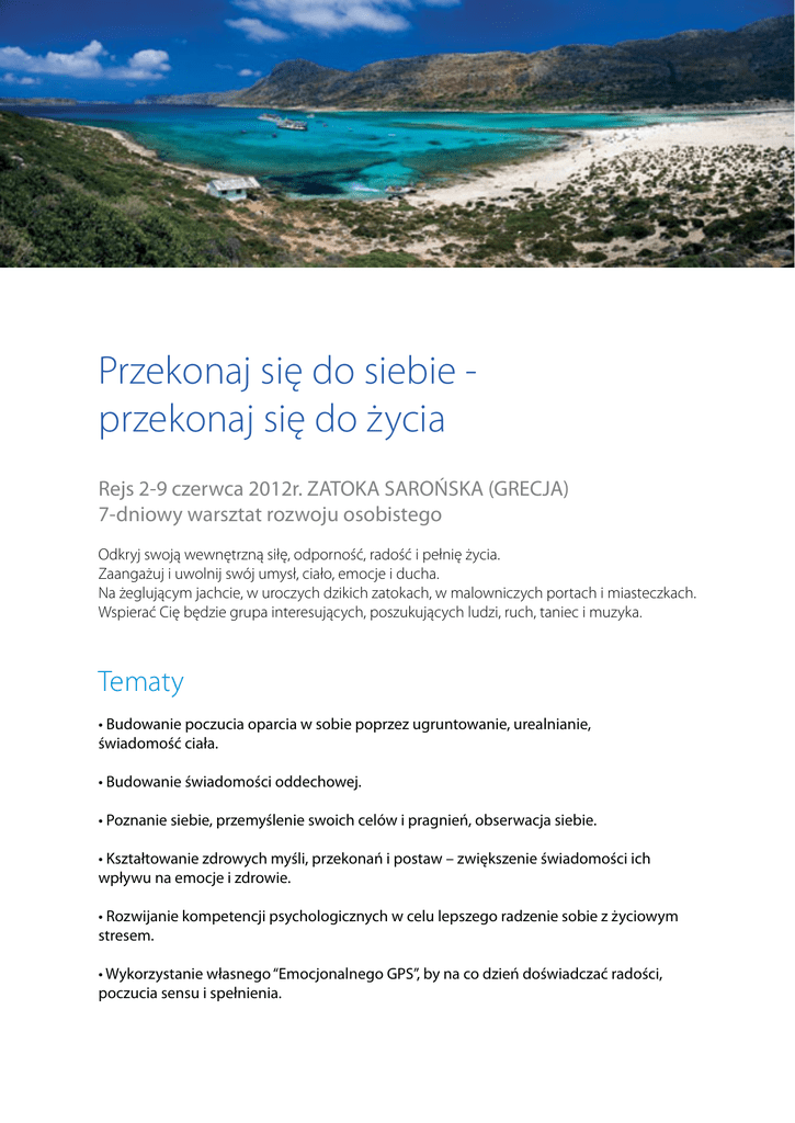 Przekonaj się do siebie przekonaj się do życia Rejs 2-9 czerwca 2012r. ZATOKA SAROŃSKA (GRECJA) 7-dniowy warsztat rozwoju osobistego Odkryj swoją wewnętrzną siłę, odporność, radość i pełnię życia. Zaangażuj i uwolnij swój umysł, ciało, emocje i ducha. Na żeglującym jachcie, w uroczych dzikich zatokach, w malowniczych portach i miasteczkach. Wspierać Cię będzie grupa interesujących, poszukujących ludzi, ruch, taniec i muzyka. Tematy • Budowanie poczucia oparcia w sobie poprzez ugruntowanie, urealnianie, świadomość ciała. • Budowanie świadomości oddechowej. • Poznanie siebie, przemyślenie swoich celów i pragnień, obserwacja siebie. • Kształtowanie zdrowych myśli, przekonań i postaw – zwiększenie świadomości ich wpływu na emocje i zdrowie. • Rozwijanie kompetencji psychologicznych w celu lepszego radzenie sobie z życiowym stresem. • Wykorzystanie własnego “Emocjonalnego GPS”, by na co dzień doświadczać radości, poczucia sensu i spełnienia. • Praca nad urealnianiem się i nauka koncentracji (bycia w żywym i mocnym kontakcie z tym, co dzieje się tu i teraz). • Oraz dodatkowo program Od ciszy po jazgot: – ćwiczenie uważności poprzez wspólną improwizację muzyczną, – muzyka jako forma niewerbalnej komunikacji Forma Program warsztatu będzie realizowany podczas postojów w formie grupowych zajęć wieczornych i porannych oraz częściowo także w trakcie żeglugi w wymiarze do 4-6 godzin dziennie. Prowadzący Wojciech Eichelberger – psycholog, psychoterapeuta i trener. W swoich projektach szkoleniowych i terapeutycznych odwołuje się do koncepcji terapii integralnej, która oprócz psychiki bierze pod uwagę ciało, energię i duchowość człowieka. Joanna Zapała – psycholog, psychoterapeuta i trener. Jest nauczycielem Rational Behavior Therapy (RBT) – od lat uczy jak pracować z przekonaniami, by osiągać zdrowe życiowe cele. Z zapałem wprowadza idee integralnego rozwoju w prowadzone przez nią projekty szkoleniowe, pozarządowe i biznesowe. Rafał Zapała – doktor kompozycji, wykładowca Akademii Muzycznej w Poznaniu Kompozytor i punk rocker w jednym, gra na wielu instrumentach – koncentruje się na holistycznym, uniwersalnym wymiarze sztuki dźwięków. Termin Rozpoczęcie: Grecja – Ateny 2.06.2012r. Zakończenie: Grecja – Ateny 9.06.2012r. Trasa rejsu Ateny – Ateny – rejs tygodniowy 1 dzień – zaokrętowanie w Atenach 2 dzień – Ateny - Perdika 3 dzień - Perdika - Hydra 4 dzień - Hydra - Ermioni 5 dzień - Ermioni - Vathi 6 dzień - Vathi -Epidavros 7 dzień - Epidavros - Ateny 8 dzień - wyokrętowanie w Atenach Trasa rejsu może ulec zmianie na skutek decyzji organizatora wynikających np. z warunków pogodowych. Jachty Komfortowe 2 jachty CYCLADES 50.5 : • Długość 15,62 m • Powierzchnia żagli 110 m2 • Liczba kabin 5+1, • Liczba koi 10 • Toalety 3 Cena: 990 Euro/osoba Zawiera: program warsztatu, czarter jachtów, opłaty portowe, paliwo, koszt wynajęcia sterników, ubezpieczenie KL, NNW i bagaż Nie zawiera: kosztów transportu do i z Aten, wyżywienia (pokrywane ze wspólnej kasy jachtowej, załoga zapewnia wyżywienie sternikom) Zniżka 10%: w przypadku rezerwacji więcej niż 1 miejsca Zniżka 5%: dla osób które były już na rejsie z Wojciechem Eichelbergerem Noclegi: Na jachtach typu Cyclades 50.5 w dwuosobowych kabinach. Wyżywienie: Śniadania i lunch – przygotowywane przez załogi. Obiadokolacje w tawernach. Dojazd: We własnym zakresie. Zasady rezerwacji Prosimy o kontakt - wyślemy Państwu umowę, którą należy odesłać w ciągu 3 dni oraz wpłacić zaliczkę w wysokości 50% ceny. Drugą ratę należy wpłacić do dnia 30 kwietnia 2012r. Informacje i zgłoszenia CPI Training ul. Wierzbięcice 18/5 61-568 Poznań tel. 61 820 27 46, 502 994 497 e-mail: [email protected] www.cpi.poznan.pl Szczegółowy program rejsu: 1 dzień - 2 czerwca – zaokrętowanie w Atenach W zależności od sposobu i terminu dotarcia poszczególnych osób do Aten spotykamy się na lotnisku lub w porcie. Zaookrętowanie i czas wolny wieczorem na zwiedzanie miasta lub zakupy. 2 dzień – 3 czerwca - Ateny - Perdika Po śniadaniu na jachcie wypływamy w kierunku Perdiki. Perdika to śliczna mała tradycyjna wioska rybacka 9km na południe od miasta Aegina. Zbudowana na wzgórzu skąd rozciąga się wspaniały widok na zatokę i pobliską wysepkę Moni. 3 dzień - 4 czerwca - Perdika - Hydra Hydra to przepięknie położony porcik rybacki. W zatoczce otoczonej wzgórzami znajdziemy wymarzone miejsce na postój. Warto przypłynąć wczesnym popołudniem, aby spędzić tu jak najwięcej czasu. Jedyna wyspa grecka, na której jedynym dopuszczonym środkiem transportu są osiołki. W okolicach portu można znaleźć wiele uroczych restauracji, kawiarni i sklepów. 4 dzień - 5 czerwca - Hydra - Ermioni Ermioni to malownicza i spokojna miejscowość nad zatoką z piaszczystą plażą. 5 dzień - 6 czerwca - Ermioni - Vathi Vathi na półwyspie Methana to malutki porcik rybacki z tylko dwiema restauracyjkami. Bardzo klimatyczne miejsce. 6 dzień - 7 czerwca - Vathi - Epidavros Miejscowość znana głównie z antycznego teatru na 14000 widzów uchodzącego za najlepiej zachowany obiekt tego typu w Grecji. Do teatru można dotrzeć np. taksówką (ok. 30 minut jazdy). 7 dzień - 8 czerwca - Epidavros - Ateny W połowie dnia przybijamy do portu w Arenach. Czas wolny na zwiedzanie lub/i zakupy. Wieczorem wspólne oglądanie pierwszego meczu Euro 2012 - mecz Polska-Grecja 8 dzień - 9 czerwca - wyokrętowanie w Atenach