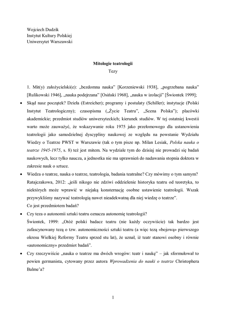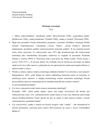 Wojciech Dudzik Instytut Kultury Polskiej Uniwersytet Warszawski Mitologie teatrologii Tezy 1. Mit(y) założycielski(e): „bezdomna nauka” [Korzeniewski 1938], „pogrzebana nauka” [Rulikowski 1946], „nauka podejrzana” [Osiński 1968], „nauka w izolacji” [Świontek 1999]; Skąd nasz początek? Dzieła (Estreicher); programy i postulaty (Schiller); instytucje (Polski Instytut Teatrologiczny); czasopisma („Życie Teatru”, „Scena Polska”); placówki akademickie; przedmiot studiów uniwersyteckich; kierunek studiów. W tej ostatniej kwestii warto może zauważyć, że wskazywanie roku 1975 jako przełomowego dla ustanowienia teatrologii jako samodzielnej dyscypliny naukowej ze względu na powstanie Wydziału Wiedzy o Teatrze PWST w Warszawie (tak o tym pisze np. Milan Lesiak, Polska nauka o teatrze 1945-1975, s. 8) też jest mitem. Na wydziale tym do dzisiaj nie prowadzi się badań naukowych, lecz tylko naucza, a jednostka nie ma uprawnień do nadawania stopnia doktora w zakresie nauk o sztuce. Wiedza o teatrze, nauka o teatrze, teatrologia, badania teatralne? Czy mówimy o tym samym? Ratajczakowa, 2012: „jeśli nikogo nie zdziwi oddzielenie historyka teatru od teoretyka, to niektórych może wprawić w niejaką konsternację osobne ustawienie teatrologii. Wszak przywykliśmy nazywać teatrologią nawet nieadekwatną dla niej wiedzę o teatrze”. Co jest przedmiotem badań? Czy teza o autonomii sztuki teatru oznacza autonomię teatrologii? Świontek, 1999: „Otóż polski badacz teatru (nie każdy oczywiście) tak bardzo jest zafascynowany tezą o tzw. autonomiczności sztuki teatru (a więc tezą «bojową» pierwszego okresu Wielkiej Reformy Teatru sprzed stu lat), że uznał, iż teatr stanowi osobny i równie «autonomiczny» przedmiot badań”. Czy rzeczywiście „nauka o teatrze ma dwóch wrogów: teatr i naukę” – jak sformułował to pewien germanista, cytowany przez autora Wprowadzenia do nauki o teatrze Christophera Balme’a? 1 2. Mit dzieła scenicznego Dzieło sceniczne – co to takiego? „Bądź co bądź, my jedni badamy dzieła, których nie ma” [Raszewski 1970]. Zob. Jolanta Brach-Czaina, Na drodze dwudziestowiecznej myśli teatralnej, 1975 – gdzie jednak autorka, po historycznym rekonesansie i po analizie żywych wówczas doświadczeń happeningu, stwierdzała, że trudno mówić o „zdefiniowaniu dzieła teatralnego przestającego istnieć”. Zob. Pleśniarowicz, Przestrzenie deziluzji, 1996: „niniejsza książka jest próbą podsumowania współczesnej wiedzy na temat postulowanej od wielu dziesięcioleci odrębności dzieła teatralnego oraz wytyczanych nieustannie granic teatralności”. Opis przedstawienia teatralnego – problem semiotyczny [Sinko, 1982]. Zapis przedstawienia („Dialog” – Próby zapisu) rubryka tak nazwana wbrew rozróżnieniu Tadeusza Kowzana, który opisem nazywał utrwalenie przebiegu przedstawienia z pozycji widza, a zapisem – utrwalenie przedstawienia przez jego twórców. Ale w momencie ogłaszania tej książki problem zapisu i opisu dotyczył tylko języka naturalnego i przekładu intersemiotycznego z jednego systemu znaków na drugi. Dzisiaj problem zapisu to problem rejestracji przedstawienia i problem jego medialności. Poszukiwanie przedmiotu badań. Powtórzę tu to, co napisałem w swojej ostatniej książce Struktura w antystrukturze: „Historia badań teatrologicznych jest w gruncie rzeczy historią poszukiwania przedmiotu badań”. 2 a. Mit teatru jako dziedziny sztuki Ciągle odzywają się głosy w tej sprawie. Ostatnio Wojciech Majcherek w komentarzu do dyskusji radiowej kilkorga polskich teatrologów zdziwił się – jak pisze – „postawą dystansu, jaką teatrolodzy zajęli wobec teatru jako dziedziny sztuki”. I wini za to m.in. performatykę. A może to nie performatyka jest winna, tylko czasy, w jakich żyjemy (a antologię pt. Zmierzch estetyki wydał Stefan Morawski w 1987 roku). 3. Mitologie historii teatru „Krótka” czy „długa” historia teatru polskiego? Paradygmat historyczny vs. paradygmat antropologiczny? Raszewski vs. Kolankiewicz? Czy tu przebiega linia podziału? Tak by się mogło wydawać w 1999, kiedy ukazały się „szatańskie wersety teatrologii polskiej” (Dziady. 2 Teatr święta zmarłych). Już wcześniej, bo w 1991 roku, Kolankiewicz mówił o antropologii teatru na konferencji w Nieborowie (jego wystąpienie ukazało się drukiem jednak dopiero w 1998 roku w tomie zbiorowym Od dokumentacji do interpretacji, od interpretacji do teorii. Wybór materiałów z Sesji Komitetu Nauk o Sztuce Polskiej Akademii Nauk. Nieborów 9–11.10.1991 r., red. Danuta Kuźnicka, Hanna Samsonowicz). Leszek Kolankiewicz z pewnością nadał nową dynamikę antropologii teatru, ale warto przypomnieć, że w Polsce postulaty badań antropologicznych w ramach teatrologii formułował już w roku 1925… Witold Wandurski. W dyskusji o potrzebie powołania Instytutu Teatralnego pisał: „Co zaś dotyczy badań, które z braku lepszego terminu, objąłem zdaniem «antropologii teatru» – to wysuwają się tu na pierwszy plan prace eksperymentalne z zakresu folkloru. Należy inscenizować niektóre, bogate teatralnością, obrzędy i gusła ludowe, zbadać kukły, maszkary, kostiumy, tańce...”. Dziś, jak się zdaje, nie ma paradygmatów, a spektrum badań teatralnych jest całkiem duże – z położeniem akcentu na medialność teatru, sytuację komunikacyjną, jaką stwarza przedstawienie teatralne i doświadczenie widzów. Koniec historiografii teatralnej? Niech żyje historia teatru! Ale jaka? Może taka, jak spróbował to zrobić Dariusz Kosiński w książce pod niefortunnym, moim zdaniem, tytułem Teatra polskie i ze świetnym podtytułem Historie (pluralis). Może taka, jak próbowała to przedstawić Joanna Krakowska w cyklu wykładów prowadzonych przez nią w Instytucie Teatralnym w ubiegłym roku Teatr PRL. Przedstawienia? Może taka, jak spróbo