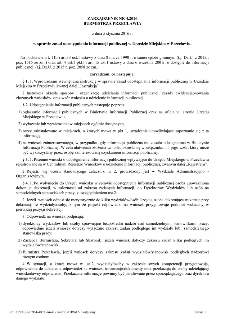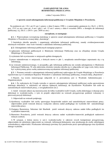 ZARZĄDZENIE NR 4.2016 BURMISTRZA PRZECŁAWIA z dnia 5 stycznia 2016 r. w sprawie zasad udostępniania informacji publicznej w Urzędzie Miejskim w Przecławiu. Na podstawie art. 11b i art.33 ust.1 ustawy z dnia 8 marca 1990 r. o samorządzie gminnym (t.j. Dz.U. z 2015r. poz. 1515 ze zm.) oraz art. 4 ust.1 pkt1 i art. 15 ust.1 ustawy z dnia 6 września 2001r. o dostępie do informacji publicznej (t.j. Dz.U. z 2015 r. poz. 2058 ze zm.) zarządzam, co następuje: § 1. 1. Wprowadzam wewnętrzną instrukcję w sprawie zasad udostepniania informacji publicznej w Urzędzie Miejskim w Przecławiu zwanej dalej „Instrukcją". 2. Instrukcja określa sposoby i organizację udzielania informacji publicznej, zasady ewidencjaonowania złożonych wniosków oraz wzór wniosku o udzielenie informacji publicznej. § 2. Udostępnianie informacji publicznych następuje poprzez: 1) ogłaszanie informacji publicznych w Biuletynie Informacji Publicznej oraz na oficjalnej stronie Urzędu Miejskiego w Przecławiu, 2) wyłożenie lub wywieszenie w miejscach ogólnie dostępnych, 3) przez zainstalowane w miejscach, o których mowa w pkt 1, urządzenia umożliwiające zapoznanie się z tą informacją, 4) na wniosek zainteresowanego, w przypadku, gdy informacja publiczna nie została udostępniona w Biuletynie Informacji Publicznej. W celu ułatwienia złożenia wniosku określa się w załączniku nr1 jego wzór, który może być wykorzystany przez osobę zainteresowaną uzyskaniem informacji publicznej. § 3. 1. Pisemne wnioski o udostępnienie informacji publicznej wpływające do Urzędu Miejskiego w Przecławiu rejestrowane są w Centralnym Rejestrze Wniosków o udzielenie informacji publicznej, zwanym dalej „Rejestrem”. 2. Rejestr, wg wzoru stanowiącego załącznik nr 2, prowadzony jest w Wydziale Administracyjno Organizacyjnym. § 4. 1. Po wpłynięciu do Urzędu wniosku w sprawie udostępnienia informacji publicznej osoba upoważniona dokonuje dekretacji, w zależności od zakresu żądanych informacji, do Dyrektorów Wydziałów lub osób na samodzielnych stanowiskach pracy, z uwzględnieniem ust.2. 2. Jeżeli wniosek odnosi się merytorycznie do kilku wydziałów/osób Urzędu, osoba dekretująca wskazuje przy dekretacji te wydziały/osoby, z tym że projekt odpowiedzi na wniosek przygotowuje podmiot wskazany w pierwszej pozycji dekretacji. 3. Odpowiedź na wniosek podpisują: 1) dyrektorzy wydziałów lub osoby sprawujące bezpośredni nadzór nad samodzielnymi stanowiskami pracy, odpowiednio jeżeli wniosek dotyczy wyłącznie zakresu zadań podległego im wydziału lub samodzielnego stanowiska pracy; 2) Zastępca Burmistrza, Sekretarz lub Skarbnik jeżeli wniosek dotyczy zakresu zadań kilku podległych im wydziałów/stanowisk; 3) Burmistrz Przecławia, jeżeli wniosek dotyczy zakresu zadań wydziałów/stanowisk podległych nadzorowi różnym osobom. 4. W sytuacji, o której mowa w ust.2, wydziały/osoby w zakresie swych kompetencji przygotowują, odpowiednie do udzielenia odpowiedzi na wniosek, informacje/dokumenty oraz przekazują do osoby udzielającej wnioskodawcy odpowiedzi. Przekazane informacje powinny być parafowane przez sporządzającego oraz dyrektora danego wydziału. Id: 1C287178-F7D4-40C1-A6AF-149C2BFD9AF5. Podpisany Strona 1 § 5. 1. Udzielenie informacji publicznej winno nastąpić w terminach przywołanej w podstawie prawnej niniejszego zarządzenia. i formie określonych w ustawie 2. Dyrektorzy wydziałów lub osoby na samodzielnych stanowiskach pracy odpowiadają za terminowe i pełne udzielenie żądanych informacji publicznych. 3. W przypadku wniosku o udostępnienie informacji publicznej przetworzonej należy rozważyć, czy wnioskodawca właściwie wykazał, że uzyskanie informacji jest szczególnie istotne dla interesu publicznego. 3. W przypadku udzielenia informacji publicznej w formie ustnej należy ten fakt udokumentować w formie notatki urzędowej, sporządzonej niezwłocznie po udzieleniu tej informacji, podając datę udostępnienia, zakres udzielonej informacji oraz w miarę możliwości dane osoby, której udostępniono informacje. 4. U uzasadnionych przypadkach należy zwrócić się do radcy prawnego, administratora bezpieczeństwa informacji lub pełnomocnika ds. informacji niejawnych o opinię dotyczącą możliwości udostępnienia wnioskowanej informacji. § 6. Dostęp do informacji publicznej jest bezpłatny z zastrzeżeniem, że jeżeli wytworzenie tej informacji wiąże się z poniesieniem dodatkowych kosztów można pobrać opłatę w wysokości odpowiadającej tym kosztom. Decyzję każdorazowo podejmuje udzielający informacji po uprzedniej aprobacie przełożonego. § 7. Informacje publiczne są udostępniane do przeglądania w Urzędzie Miejskim w Przecławiu w godzinach pracy w obecności pracownika wyznaczonego przez właściwego do danego zakresu dyrektora wydziału. § 8. Odmowa udostępnienia informacji publicznej oraz umorzenie postępowania o udostępnienie informacji publicznej następuje na zasadach określonych w ustawie o dostępie do informacji publicznej, a za czynności w tym zakresie odpowiada właściwy ze względu na treść wniosku o udzielenie informacji dyrektor wydziału lub nadzorujący samodzielne stanowisko pracy. § 9. W sprawach nieuregulowanych niniejszym zarządzeniem należy kierować się postanowieniami ustawy o dostępie do informacji publicznej i Kodeksu postępowania administracyjnego. § 10. Wykonanie zarządzenia powierza się Dyrektorowi Wydziału Administracyjno - Organizacyjnemu a nazdzór powierza się Sekretarzowi Gminy. § 11. Zarządzenie wchodzi w życie z dniem podpisania. Burmistrz Przecławia mgr Ryszard Wolanin Id: 1C287178-F7D4-40C1-A6AF-149C2BFD9AF5. Podpisany Strona 2 Załącznik Nr 1 do zarządzenia Nr 4.2016 Burmistrza Przecławia z dnia 5 stycznia 2016 r. ................................................. ................................................. ....................................