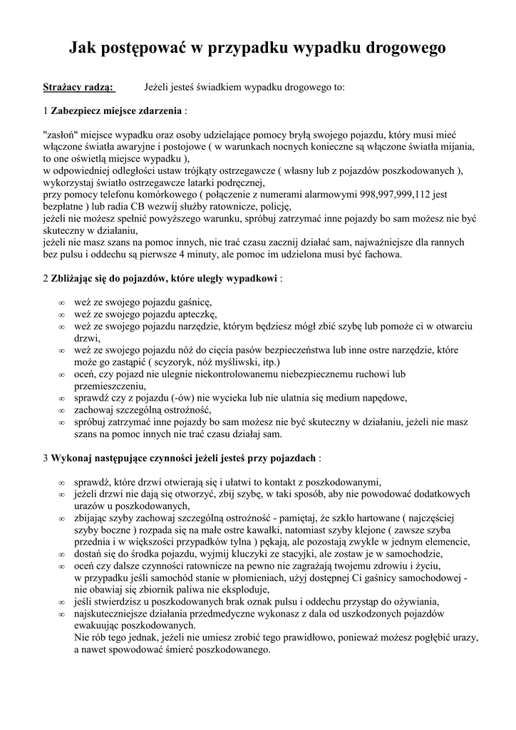 Jak postępować w przypadku wypadku drogowego StraŜacy radzą: JeŜeli jesteś świadkiem wypadku drogowego to: 1 Zabezpiecz miejsce zdarzenia : "zasłoń" miejsce wypadku oraz osoby udzielające pomocy bryłą swojego pojazdu, który musi mieć włączone światła awaryjne i postojowe ( w warunkach nocnych konieczne są włączone światła mijania, to one oświetlą miejsce wypadku ), w odpowiedniej odległości ustaw trójkąty ostrzegawcze ( własny lub z pojazdów poszkodowanych ), wykorzystaj światło ostrzegawcze latarki podręcznej, przy pomocy telefonu komórkowego ( połączenie z numerami alarmowymi 998,997,999,112 jest bezpłatne ) lub radia CB wezwij słuŜby ratownicze, policję, jeŜeli nie moŜesz spełnić powyŜszego warunku, spróbuj zatrzymać inne pojazdy bo sam moŜesz nie być skuteczny w działaniu, jeŜeli nie masz szans na pomoc innych, nie trać czasu zacznij działać sam, najwaŜniejsze dla rannych bez pulsu i oddechu są pierwsze 4 minuty, ale pomoc im udzielona musi być fachowa. 2 ZbliŜając się do pojazdów, które uległy wypadkowi : • • • • • • • • weź ze swojego pojazdu gaśnicę, weź ze swojego pojazdu apteczkę, weź ze swojego pojazdu narzędzie, którym będziesz mógł zbić szybę lub pomoŜe ci w otwarciu drzwi, weź ze swojego pojazdu nóŜ do cięcia pasów bezpieczeństwa lub inne ostre narzędzie, które moŜe go zastąpić ( scyzoryk, nóŜ myśliwski, itp.) oceń, czy pojazd nie ulegnie niekontrolowanemu niebezpiecznemu ruchowi lub przemieszczeniu, sprawdź czy z pojazdu (-ów) nie wycieka lub nie ulatnia się medium napędowe, zachowaj szczególną ostroŜność, spróbuj zatrzymać inne pojazdy bo sam moŜesz nie być skuteczny w działaniu, jeŜeli nie masz szans na pomoc innych nie trać czasu działaj sam. 3 Wykonaj następujące czynności jeŜeli jesteś przy pojazdach : • • • • • • • sprawdź, które drzwi otwierają się i ułatwi to kontakt z poszkodowanymi, jeŜeli drzwi nie dają się otworzyć, zbij szybę, w taki sposób, aby nie powodować dodatkowych urazów u poszkodowanych, zbijając szyby zachowaj szczególną ostroŜność - pamiętaj, Ŝe szkło hartowane ( najczęściej szyby boczne ) rozpada się na małe ostre kawałki, natomiast szyby klejone ( zawsze szyba przednia i w większości przypadków tylna ) pękają, ale pozostają zwykle w jednym elemencie, dostań się do środka pojazdu, wyjmij kluczyki ze stacyjki, ale zostaw je w samochodzie, oceń czy dalsze czynności ratownicze na pewno nie zagraŜają twojemu zdrowiu i Ŝyciu, w przypadku jeśli samochód stanie w płomieniach, uŜyj dostępnej Ci gaśnicy samochodowej nie obawiaj się zbiornik paliwa nie eksploduje, jeśli stwierdzisz u poszkodowanych brak oznak pulsu i oddechu przystąp do oŜywiania, najskuteczniejsze działania przedmedyczne wykonasz z dala od uszkodzonych pojazdów ewakuując poszkodowanych. Nie rób tego jednak, jeŜeli nie umiesz zrobić tego prawidłowo, poniewaŜ moŜesz pogłębić urazy, a nawet spowodować śmierć poszkodowanego. 4 Zaalarmuj słuŜby ratownicze, a w przypadku gdy : • • • • • samochód nie jest naraŜony na niekontrolowany ruch lub przemieszczenie nie ma wycieków paliwa odłączona jest instalacja elektryczna pojazdu miejsce zdarzenia jest odpowiednio zabezpieczone poszkodowani dają oznaki Ŝycia, ale są uwięzieni w pojeździe, - przystąp do udzielania im pierwszej pomocy ( opatrzenia ran, tamowania krwotoków, ustabilizowania kręgosłupa i kończyn ). Kontroluj oddech i czynności serca poszkodowanych, okryj ich kocem lub odzieŜą w celu uniknięcia pogłębienia wstrząsu. Zostań przy poszkodowanych do czasu przybycia ratowników. Pamiętaj aby wszystkie czynności wykonywać z rozwagą, bez niepotrzebnych emocji i dodatkowych zniszczeń, do czasu aŜ przybędą specjalistyczne słuŜby ratownicze. Pamiętaj, Ŝe Ty równieŜ moŜesz się znaleźć w podobnej sytuacji. Materiał opracowali: st. kpt. mgr inŜ. Aleksander Adamski, kpt. mgr inŜ. Dariusz Dąbek Katedra Techniki PoŜarniczej, Zakład Ratownictwa Technicznego, Szkoła Główna SłuŜby PoŜarniczej w Warszawie Wydruk pochodzi z serwisu Komendy Głównej Państwowej StraŜy PoŜarnej http://www.straz.gov.pl