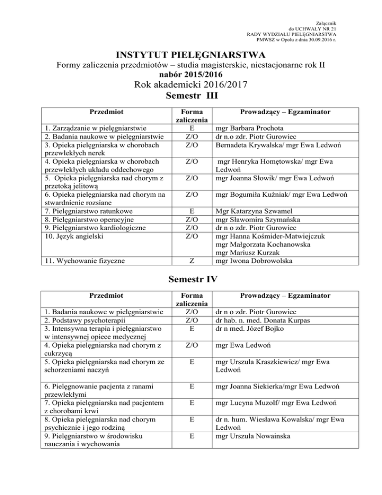 Załącznik do UCHWAŁY NR 21 RADY WYDZIAŁU PIELĘGNIARSTWA PMWSZ w Opolu z dnia 30.09.2016 r. INSTYTUT PIELĘGNIARSTWA Formy zaliczenia przedmiotów – studia magisterskie, niestacjonarne rok II nabór 2015/2016 Rok akademicki 2016/2017 Semestr III Przedmiot 1. Zarządzanie w pielęgniarstwie 2. Badania naukowe w pielęgniarstwie 3. Opieka pielęgniarska w chorobach przewlekłych nerek 4. Opieka pielęgniarska w chorobach przewlekłych układu oddechowego 5. Opieka pielęgniarska nad chorym z przetoką jelitową 6. Opieka pielęgniarska nad chorym na stwardnienie rozsiane 7. Pielęgniarstwo ratunkowe 8. Pielęgniarstwo operacyjne 9. Pielęgniarstwo kardiologiczne 10. Język angielski 11. Wychowanie fizyczne Forma zaliczenia E Z/O Z/O Prowadzący – Egzaminator mgr Barbara Prochota dr n.o zdr. Piotr Gurowiec Bernadeta Krywalska/ mgr Ewa Ledwoń Z/O mgr Henryka Homętowska/ mgr Ewa Ledwoń mgr Joanna Słowik/ mgr Ewa Ledwoń Z/O mgr Bogumiła Kuźniak/ mgr Ewa Ledwoń E Z/O Z/O Z/O Mgr Katarzyna Szwamel mgr Sławomira Szymańska dr n o zdr. Piotr Gurowiec mgr Hanna Kośmider-Matwiejczuk mgr Małgorzata Kochanowska mgr Mariusz Kurzak mgr Iwona Dobrowolska Z/O Z Semestr IV Przedmiot 1. Badania naukowe w pielęgniarstwie 2. Podstawy psychoterapii 3. Intensywna terapia i pielęgniarstwo w intensywnej opiece medycznej 4. Opieka pielęgniarska nad chorym z cukrzycą 5. Opieka pielęgniarska nad chorym ze schorzeniami naczyń 6. Pielęgnowanie pacjenta z ranami przewlekłymi 7. Opieka pielęgniarska nad pacjentem z chorobami krwi 8. Opieka pielęgniarska nad chorym psychicznie i jego rodziną 9. Pielęgniarstwo w środowisku nauczania i wychowania Forma zaliczenia Z/O Z/O E Z/O Prowadzący – Egzaminator dr n o zdr. Piotr Gurowiec dr hab. n. med. Donata Kurpas dr n med. Józef Bojko mgr Ewa Ledwoń E mgr Urszula Kraszkiewicz/ mgr Ewa Ledwoń E mgr Joanna Siekierka/mgr Ewa Ledwoń E mgr Lucyna Muzolf/ mgr Ewa Ledwoń E dr n. hum. Wiesława Kowalska/ mgr Ewa Ledwoń mgr Urszula Nowainska E Załącznik do UCHWAŁY NR 21 RADY WYDZIAŁU PIELĘGNIARSTWA PMWSZ w Opolu z dnia 30.09.2016 r.