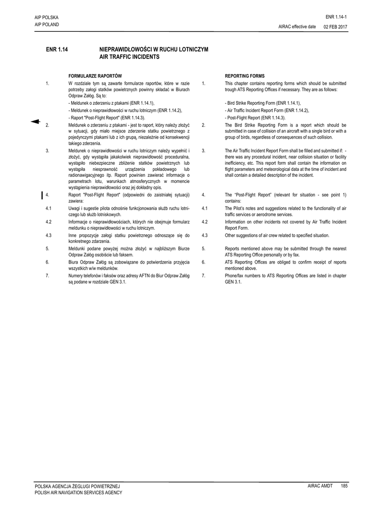 ENR 1.14-1 AIP POLSKA AIP POLAND ENR 1.14 AIRAC effective date NIEPRAWIDŁOWOŚCI W RUCHU LOTNICZYM AIR TRAFFIC INCIDENTS FORMULARZE RAPORTÓW 1. 02 FEB 2017 W rozdziale tym są zawarte formularze raportów, które w razie potrzeby załogi statków powietrznych powinny składać w Biurach Odpraw Załóg. Są to: REPORTING FORMS 1. - Meldunek o zderzeniu z ptakami (ENR 1.14.1), This chapter contains reporting forms which should be submitted trough ATS Reporting Offices if necessary. They are as follows: - Bird Strike Reporting Form (ENR 1.14.1), - Meldunek o nieprawidłowości w ruchu lotniczym (ENR 1.14.2), - Air Traffic Incident Report Form (ENR 1.14.2), - Raport "Post-Flight Report" (ENR 1.14.3). - Post-Flight Report (ENR 1.14.3). 2. Meldunek o zderzeniu z ptakami - jest to raport, który należy złożyć w sytuacji, gdy miało miejsce zderzenie statku powietrznego z pojedynczymi ptakami lub z ich grupą, niezależnie od konsekwencji takiego zderzenia. 2. The Bird Strike Reporting Form is a report which should be submitted in case of collision of an aircraft with a single bird or with a group of birds, regardless of consequences of such collision. 3. Meldunek o nieprawidłowości w ruchu lotniczym należy wypełnić i złożyć, gdy wystąpiła jakakolwiek nieprawidłowość proceduralna, wystąpiło niebezpieczne zbliżenie statków powietrznych lub wystąpiła niesprawność urządzenia pokładowego lub radionawigacyjnego itp. Raport powinien zawierać informacje o parametrach lotu, warunkach atmosferycznych w momencie wystąpienia nieprawidłowości oraz jej dokładny opis. 3. The Air Traffic Incident Report Form shall be filled and submitted if: there was any procedural incident, near collision situation or facility inefficiency, etc. This report form shall contain the information on flight parameters and meteorological data at the time of incident and shall contain a detailed description of the incident. 4. Raport "Post-Flight Report" (odpowiedni do zaistniałej sytuacji) zawiera: 4. The “Post-Flight Report” (relevant for situation - see point 1) contains: 4.1 Uwagi i sugestie pilota odnośnie funkcjonowania służb ruchu lotniczego lub służb lotniskowych. 4.1 The Pilot’s notes and suggestions related to the functionality of air traffic services or aerodrome services. 4.2 Informacje o nieprawidłowościach, których nie obejmuje formularz meldunku o nieprawidłowości w ruchu lotniczym. 4.2 Information on other incidents not covered by Air Traffic Incident Report Form. 4.3 Inne propozycje załogi statku powietrznego odnoszące się do konkretnego zdarzenia. 4.3 Other suggestions of air crew related to specified situation. 5. Meldunki podane powyżej można złożyć w najbliższym Biurze Odpraw Załóg osobiście lub faksem. 5. Reports mentioned above may be submitted through the nearest ATS Reporting Office personally or by fax. 6. Biura Odpraw Załóg są zobowiązane do potwierdzenia przyjęcia wszystkich w/w meldunków. 6. ATS Reporting Offices are obliged to confirm receipt of reports mentioned above. 7. Numery telefonów i faksów oraz adresy AFTN do Biur Odpraw Załóg są podane w rozdziale GEN 3.1. 7. Phone/fax numbers to ATS Reporting Offices are listed in chapter GEN 3.1. POLSKA AGENCJA ŻEGLUGI POWIETRZNEJ POLISH AIR NAVIGATION SERVICES AGENCY AIRAC AMDT 185 STRONA WOLNA INTENTIONALLY LEFT BLANK ENR 1.14.1-1 AIP POLSKA AIP POLAND AIRAC effective date 02 FEB 2017 INFORMACJE O ZDERZENIU Z PTAKAMI nr: EP........../........../20..... LOTNISKO/NUMER/ROK Towarzystwo lotnicze..................................................... 01/02 Producent samolotu/typ................................................. 03/04 bez wpływu 32 Producent silnika/typ...................................................... 05/06 przerwano start 33 Znak rejestracyjny ACFT................................................ 07 lądowanie awaryjne 34 Data: dzień...........miesiąc................rok......................... 08 wyłączenie silnika 35 Czas lokalny................................................................... 09 inne (opisać) 36 brzask A dzień B zmierzch C noc Wpływ na przebieg lotu: D 10 Nazwa lotniska............................................................... 11/12 Użyta RWY..................................................................... 13 bezchmurne A Położenie ACFT, jeżeli w przelocie................................ 14 lekkie zachmurzenie B duże zachmurzenie C Wysokość (AGL)....................ft 15 Prędkość (IAS)....................kt 16 Faza lotu: 17 Stan nieba: 37 Opady: mgła 38 deszcz 39 śnieg 40 postój A Gatunek ptaków........................................................................................................................... kołowanie B Liczebność ptaków: start C wznoszenie D 1 A A przelot E 2-10 B B zniżanie F 11-100 C C D przelatujących podejście G więcej lądowanie H Wielkość ptaków: Części ACFT: uderzone uszkodzone S średnie M duże L szyba 19 dziób (bez ww.) 20 silnik nr 1 21 silnik nr 2 22 silnik nr 3 23 silnik nr 4 24 Czy pilot był uprzedzony o ptakach? śmigło 25 Tak płat 26 kadłub 27 podwozie 28 29 30 inne (wskazać) 31 43 B małe 18 reflektory uderzających 44 owiewka ogon 42 41 45 Y Nie X 46/47 UWAGI (opisz uszkodzenia, obrażenia i inne informacje): ..................................................................................................................................... ..................................................................................................................................... ..................................................................................................................................... LOTNISKO: EP............................ CZAS: ............................ DATA .................................................................................... PRZYJĄŁ: ............................................................................ POL