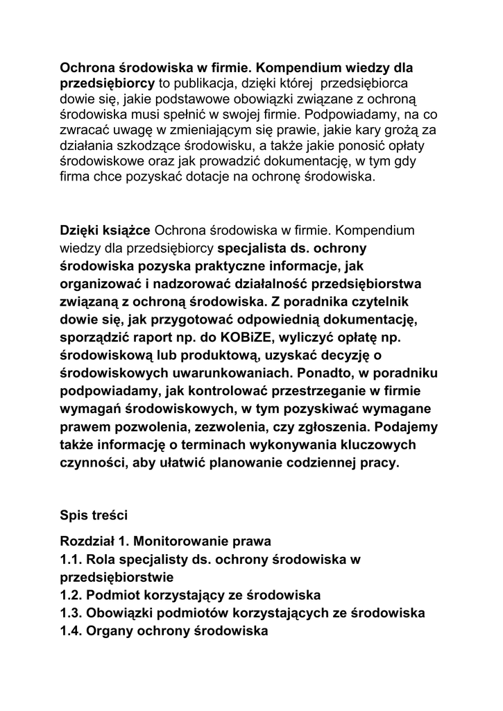 Ochrona środowiska w firmie. Kompendium wiedzy dla przedsiębiorcy to publikacja, dzięki której przedsiębiorca dowie się, jakie podstawowe obowiązki związane z ochroną środowiska musi spełnić w swojej firmie. Podpowiadamy, na co zwracać uwagę w zmieniającym się prawie, jakie kary grożą za działania szkodzące środowisku, a także jakie ponosić opłaty środowiskowe oraz jak prowadzić dokumentację, w tym gdy firma chce pozyskać dotacje na ochronę środowiska. Dzięki książce Ochrona środowiska w firmie. Kompendium wiedzy dla przedsiębiorcy specjalista ds. ochrony środowiska pozyska praktyczne informacje, jak organizować i nadzorować działalność przedsiębiorstwa związaną z ochroną środowiska. Z poradnika czytelnik dowie się, jak przygotować odpowiednią dokumentację, sporządzić raport np. do KOBiZE, wyliczyć opłatę np. środowiskową lub produktową, uzyskać decyzję o środowiskowych uwarunkowaniach. Ponadto, w poradniku podpowiadamy, jak kontrolować przestrzeganie w firmie wymagań środowiskowych, w tym pozyskiwać wymagane prawem pozwolenia, zezwolenia, czy zgłoszenia. Podajemy także informację o terminach wykonywania kluczowych czynności, aby ułatwić planowanie codziennej pracy. Spis treści Rozdział 1. Monitorowanie prawa 1.1. Rola specjalisty ds. ochrony środowiska w przedsiębiorstwie 1.2. Podmiot korzystający ze środowiska 1.3. Obowiązki podmiotów korzystających ze środowiska 1.4. Organy ochrony środowiska 1.5. Kontrole w zakresie ochrony środowiska Rozdział 2. Prowadzenie dokumentacji 2.1. Wymogi formalne w zakresie gospodarki odpadami 2.2. Wymogi formalne w zakresie gospodarki wodnościekowej 2.3. Wymogi formalne w zakresie ochrony powietrza Rozdział 3. Naliczanie opłat i obowiązki sprawozdawcze 3.1. Opłata środowiskowa 3.2. Opłata produktowa 3.3. Ewidencjonowanie składowania odpadów 3.4. Zaliczenie opłat za korzystanie ze środowiska do kosztów podatkowych 3.5. Kary pieniężne Rozdział 4. Odpowiadanie za szkody w środowisku naturalnym 4.1. Odpowiedzialność cywilna 4.2. Odpowiedzialność karna i karnoadministracyjna 4.3. Odpowiedzialność administracyjna 4.4. Odpowiedzialność za szkody w środowisku naturalnym wg dyrektywy 2004/35/WE Rozdział 5. Pozyskiwanie zewnętrznych środków inwestycyjnych 5.1. Zasady zarządzania projektami środowiskowymi 5.2. Ocena projektów i konkursy 5.3. Błędy formalne, merytoryczne i finansowe 5.4. Umowa o dofinansowanie projektu 5.5. Decyzje środowiskowe w procesie inwestycyjnym