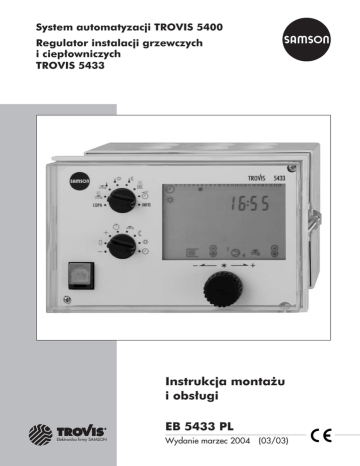 System automatyzacji TROVIS 5400 Regulator instalacji grzewczych i ciepłowniczych TROVIS 5433 Instrukcja montażu i obsługi EB 5433 PL Elektronika firmy SAMSON Wydanie marzec 2004 (03/03) Gwarancja Gwarancja Prowadzimy ci¹g³e prace nad udoskonalaniem produktów, z tego powodu zastrzegamy sobie prawo do modyfikowania naszych produktów w ka¿dym czasie i bez wczeœniejszego powiadomienia. Nie dajemy gwarancji prawid³owoœci i kompletnoœci poni¿szej instrukcji obs³ugi. Nie rêczymy za mo¿liwoœæ wykorzystania produktów przez Nabywcê w okreœlonym zastosowaniu. Roszczenia Nabywcy, zw³aszcza roszczenia odszkodowawcze w³¹cznie z odszkodowaniem za utracony zysk i inne szkody maj¹tkowe, s¹ wykluczone. Powy¿sze nie ma zastosowania, jeœli przyczyna szkody zwi¹zana jest z dzia³aniem zamierzonym lub powa¿nym zaniedbaniem. Jeœli zaniedbany zostanie istotny obowi¹zek wynikaj¹cy z umowy, odpowiadamy tylko za mo¿liwe do przewidzenia szkody. Wskazówki dotycz¹ce bezpieczeñstwa 4 Monta¿ i uruchomienie urz¹dzenia mo¿e przeprowadzaæ tylko fachowy personel, który zaznajomiony jest z monta¿em, uruchomieniem i eksploatacj¹ tego produktu. Wymagany jest odpowiedni transport i sk³adowanie urz¹dzeñ. 4 Urz¹dzenie przeznaczone jest do zastosowania w instalacjach energetycznych. W trakcie pod³¹czania i konserwacji nale¿y przestrzegaæ odnoœnych przepisów BHP. 2 EB 5433 PL Spis treści Spis treœci 1 1.1 1.1.1 1.1.2 1.2 1.3 1.4 1.5 1.6 1.6.1 1.6.2 1.7 Obs³uga . . . . . . . . . . . . . . . . . . . . . . . . . . . . . . . . 6 Elementy obs³ugi . . . . . . . . . . . . . . . . . . . . . . . . . . . . 6 Pokrêt³o . . . . . . . . . . . . . . . . . . . . . . . . . . . . . . . . 6 Prze³¹cznik obrotowy. . . . . . . . . . . . . . . . . . . . . . . . . . 6 Tryby pracy . . . . . . . . . . . . . . . . . . . . . . . . . . . . . . 7 Wyœwietlacz . . . . . . . . . . . . . . . . . . . . . . . . . . . . . . 8 Odczyt parametrów . . . . . . . . . . . . . . . . . . . . . . . . . . 9 Nastawa czasu systemowego . . . . . . . . . . . . . . . . . . . . . 10 Dostosowanie programów czasowych . . . . . . . . . . . . . . . . . 11 Wprowadzenie dni œwi¹tecznych . . . . . . . . . . . . . . . . . . . 13 Wprowadzenie okresów ferii . . . . . . . . . . . . . . . . . . . . . 14 Nastawa wartoœci zadanych temperatury . . . . . . . . . . . . . . . 16 2 2.1 2.2 2.3 2.4 2.5 Uruchomienie . . . . . . . . . . . . Nastawa numeru schematu instalacji . Aktywacja i deaktywacja funkcji . . . Zmiana parametrów . . . . . . . . Wzorcowanie czujników . . . . . . Przywrócenie nastaw fabrycznych . . 3 Rêczny tryb pracy . . . . . . . . . . . . . . . . . . . . . . . . . . 24 4 Schematy instalacji . . . . . . . . . . . . . . . . . . . . . . . . . . 25 5 5.1 5.1.1 5.1.2 5.2 5.3 5.3.1 5.3.2 5.3.3 5.3.4 5.4 5.5 5.6 5.7 5.8 Funkcje obiegu c.o. . . . . . . . . . . . . . . . . . . . . . . . . . Pogodowa regulacja temperatury . . . . . . . . . . . . . . . . . . Krzywa grzania okreœlona na podstawie wsp. nachylenia. . . . . . . 4-punktowa krzywa grzania . . . . . . . . . . . . . . . . . . . . . Regulacja wed³ug wartoœci sta³ej. . . . . . . . . . . . . . . . . . . Wy³¹czenie uzale¿nione od temperatury zewnêtrznej . . . . . . . . Temperatura zewnêtrzna wy³¹czenia dla nominalnego trybu pracy . . Temperatura zewnêtrzna wy³¹czenia dla zredukowanego trybu pracy Temperatura zewnêtrzna za³¹czenia dla nominalnego trybu pracy . . Letni tryb pracy . . . . . . . . . . . . . . . . . . . . . . . . . . . OpóŸniona rejestracja temperatury zewnêtrznej . . . . . . . . . . . Ogrzewanie wstêpne uzale¿nione od temperatury zewnêtrznej . . . . Zdalne sterowanie . . . . . . . . . . . . . . . . . . . . . . . . . Optymalizacja przy wykorzystaniu czujnika temp. w pomieszczeniu . Adaptacja krótkoczasowa . . . . . . . . . . . . . . . . . . . . . . . . . . . . . . . . . . . . . . . . . . . . . . . . . . . . . . . . . . . . . . . . . . . . . . . . . . . . . . . . . . . . . . . . . . . . . . . . . . . . . . . . . . . . . . . . . . . . . . . . . . . . . . . . . . . . . . . . . . . EB 5433 PL 17 17 18 20 21 23 34 34 35 36 37 37 37 38 38 38 39 40 40 41 43 3 Spis treści 6 6.1 6.2 6.3 6.4 6.5 6.6 6.7 6.7.1 6.7.2 6.8 6.9 6.10 Funkcje obiegu c.w.u. . . . . . . . . . . . . . . . . . . . . . . . Przygotowanie c.w.u. w systemie zasobnikowym . . . . . . . . . . Przygotowanie c.w.u. w systemie zasobnikowym z ³adowaniem. . . Przygotowanie c.w.u. w systemie przep³ywowym . . . . . . . . . . Okresowe za³¹czanie obiegu c.o. w trakcie przygotowywania c.w.u Równoleg³a praca pomp . . . . . . . . . . . . . . . . . . . . . Praca pompy cyrkulacyjnej podczas ³adowania zasobnika . . . . . Priorytet przygotowania c.w.u. . . . . . . . . . . . . . . . . . . Regulacja inwersyjna . . . . . . . . . . . . . . . . . . . . . . . Obni¿ony tryb pracy . . . . . . . . . . . . . . . . . . . . . . . Wymuszone ³adowanie zasobnika c.w.u. . . . . . . . . . . . . . Termiczna dezynfekcja zasobnika c.w.u. . . . . . . . . . . . . . . Ferie i dni œwi¹teczne tak¿e dla przygotowania c.w.u. . . . . . . . . . . . . . . . . . . . . . . . . . . . . . . . . . 44 44 46 48 49 49 49 50 50 50 51 51 52 7 7.1 7.2 7.3 7.4 7.5 7.6 7.7 7.8 7.9 7.10 Funkcje obowi¹zuj¹ce dla ca³ej instalacji . . . . . . . . . . Automatyczne prze³¹czenie miêdzy czasem letnim i zimowym Ochrona przeciwmrozowa . . . . . . . . . . . . . . . . . Wymuszona praca pomp . . . . . . . . . . . . . . . . . . Ograniczenie temperatury wody powrotnej . . . . . . . . . Regulacja kondensatu . . . . . . . . . . . . . . . . . . . . Regulacja trójpunktowa . . . . . . . . . . . . . . . . . . . Regulacja dwupunktowa. . . . . . . . . . . . . . . . . . . Sygna³ zewnêtrznego zapotrzebowania . . . . . . . . . . . Blokada rêcznego trybu pracy . . . . . . . . . . . . . . . . Blokada prze³¹cznika obrotowego . . . . . . . . . . . . . . . . . . . . . . . . . . . . . . . . . . . . . . . . . . . . . . . . . . . . . . . . . .