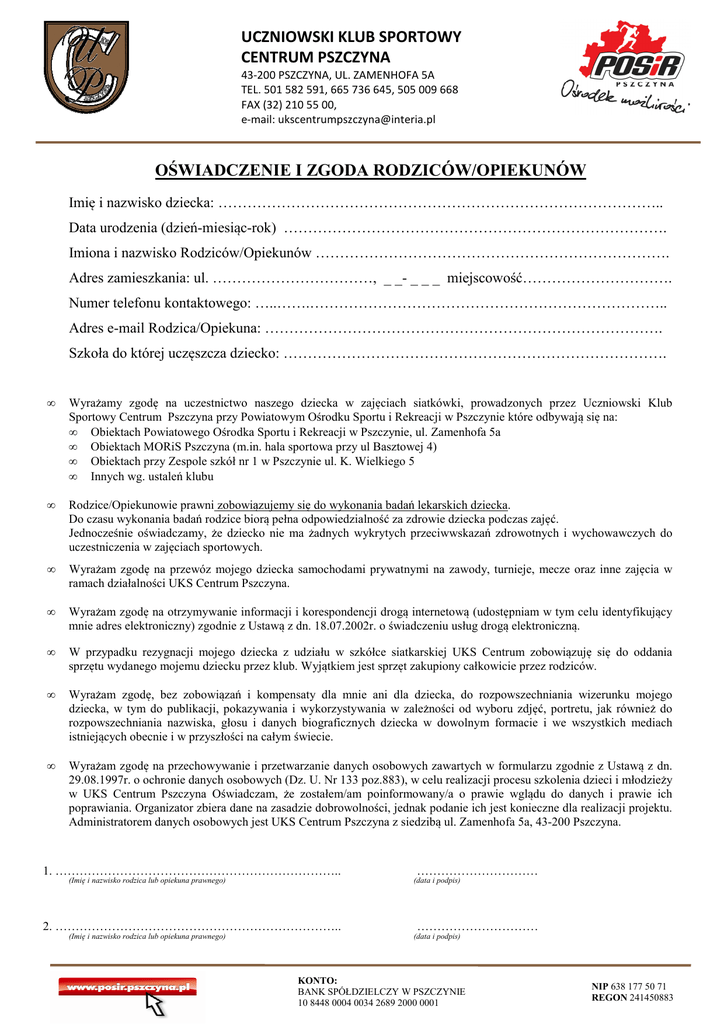 UCZNIOWSKI KLUB SPORTOWY CENTRUM PSZCZYNA 43-200 PSZCZYNA, UL. ZAMENHOFA 5A TEL. 501 582 591, 665 736 645, 505 009 668 FAX (32) 210 55 00, e-mail: [email protected] OŚWIADCZENIE I ZGODA RODZICÓW/OPIEKUNÓW Imię i nazwisko dziecka: ……………………………………………………………………………….. Data urodzenia (dzień-miesiąc-rok) ……………………………………………………………………. Imiona i nazwisko Rodziców/Opiekunów ………………………………………………………………. Adres zamieszkania: ul. ……………………………, _ _- _ _ _ miejscowość…………………………. Numer telefonu kontaktowego: …..…….……………………………………………………………….. Adres e-mail Rodzica/Opiekuna: ………………………………………………………………………. Szkoła do której uczęszcza dziecko: ……………………………………………………………………. • Wyrażamy zgodę na uczestnictwo naszego dziecka w zajęciach siatkówki, prowadzonych przez Uczniowski Klub Sportowy Centrum Pszczyna przy Powiatowym Ośrodku Sportu i Rekreacji w Pszczynie które odbywają się na: • Obiektach Powiatowego Ośrodka Sportu i Rekreacji w Pszczynie, ul. Zamenhofa 5a • Obiektach MORiS Pszczyna (m.in. hala sportowa przy ul Basztowej 4) • Obiektach przy Zespole szkół nr 1 w Pszczynie ul. K. Wielkiego 5 • Innych wg. ustaleń klubu • Rodzice/Opiekunowie prawni zobowiązujemy się do wykonania badań lekarskich dziecka. Do czasu wykonania badań rodzice biorą pełna odpowiedzialność za zdrowie dziecka podczas zajęć. Jednocześnie oświadczamy, że dziecko nie ma żadnych wykrytych przeciwwskazań zdrowotnych i wychowawczych do uczestniczenia w zajęciach sportowych. • Wyrażam zgodę na przewóz mojego dziecka samochodami prywatnymi na zawody, turnieje, mecze oraz inne zajęcia w ramach działalności UKS Centrum Pszczyna. • Wyrażam zgodę na otrzymywanie informacji i korespondencji drogą internetową (udostępniam w tym celu identyfikujący mnie adres elektroniczny) zgodnie z Ustawą z dn. 18.07.2002r. o świadczeniu usług drogą elektroniczną. • W przypadku rezygnacji mojego dziecka z udziału w szkółce siatkarskiej UKS Centrum zobowiązuję się do oddania sprzętu wydanego mojemu dziecku przez klub. Wyjątkiem jest sprzęt zakupiony całkowicie przez rodziców. • Wyrażam zgodę, bez zobowiązań i kompensaty dla mnie ani dla dziecka, do rozpowszechniania wizerunku mojego dziecka, w tym do publikacji, pokazywania i wykorzystywania w zależności od wyboru zdjęć, portretu, jak również do rozpowszechniania nazwiska, głosu i danych biograficznych dziecka w dowolnym formacie i we wszystkich mediach istniejących obecnie i w przyszłości na całym świecie. • Wyrażam zgodę na przechowywanie i przetwarzanie danych osobowych zawartych w formularzu zgodnie z Ustawą z dn. 29.08.1997r. o ochronie danych osobowych (Dz. U. Nr 133 poz.883), w celu realizacji procesu szkolenia dzieci i młodzieży w UKS Centrum Pszczyna Oświadczam, że zostałem/am poinformowany/a o prawie wglądu do danych i prawie ich poprawiania. Organizator zbiera dane na zasadzie dobrowolności, jednak podanie ich jest konieczne dla realizacji projektu. Administratorem danych osobowych jest UKS Centrum Pszczyna z siedzibą ul. Zamenhofa 5a, 43-200 Pszczyna. 1. …………………………………………………………….. (Imię i nazwisko rodzica lub opiekuna prawnego) 2. …………………………………………………………….. (Imię i nazwisko rodzica lub opiekuna prawnego) ………………………… (data i podpis) ………………………… (data i podpis) KONTO: BANK SPÓŁDZIELCZY W PSZCZYNIE 10 8448 0004 0034 2689 2000 0001 NIP 638 177 50 71 REGON 241450883