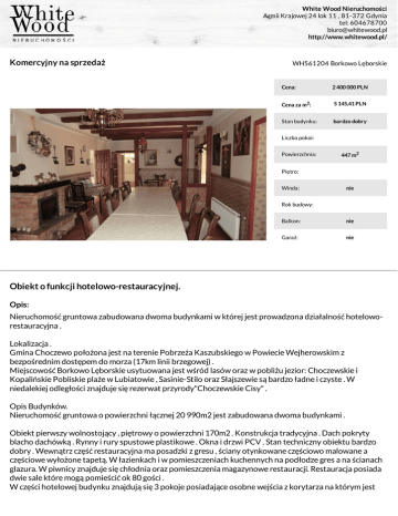 White Wood Nieruchomości Armii Krajowej 24 lok 11 , 81-372 Gdynia tel: 604678700 [email protected] http://www.whitewood.pl/ Komercyjny na sprzedaż WH561204 Borkowo Lęborskie Cena: 2 400 000 PLN Cena za m2: 5 145,41 PLN Stan budynku: bardzo dobry Liczba pokoi: Powierzchnia: 447 m2 Piętro: Winda: nie Rok budowy: Balkon: nie Garaż: nie Obiekt o funkcji hotelowo-restauracyjnej. Opis: Nieruchomość gruntowa zabudowana dwoma budynkami w której jest prowadzona działalność hoteloworestauracyjna . Lokalizacja . Gmina Choczewo położona jest na terenie Pobrzeża Kaszubskiego w Powiecie Wejherowskim z bezpośrednim dostępem do morza (17km linii brzegowej) . Miejscowość Borkowo Lęborskie usytuowana jest wśród lasów oraz w pobliżu jezior: Choczewskie i Kopalińskie Pobliskie plaże w Lubiatowie , Sasinie-Stilo oraz Słajszewie są bardzo ładne i czyste . W niedalekiej odległości znajduje się rezerwat przyrody"Choczewskie Cisy" . Opis Budynków. Nieruchomość gruntowa o powierzchni łącznej 20 990m2 jest zabudowana dwoma budynkami . Obiekt pierwszy wolnostojący , piętrowy o powierzchni 170m2 . Konstrukcja tradycyjna . Dach pokryty blacho dachówką . Rynny i rury spustowe plastikowe . Okna i drzwi PCV . Stan techniczny obiektu bardzo dobry . Wewnątrz część restauracyjna ma posadzki z gresu , ściany otynkowane częściowo malowane a częściowe wyłożone tapetą. W łazienkach i w pomieszczeniach kuchennych na podłodze gres a na ścianach glazura. W piwnicy znajduje się chłodnia oraz pomieszczenia magazynowe restauracji. Restauracja posiada dwie sale które mogą pomieścić ok 80 gości . W części hotelowej budynku znajdują się 3 pokoje posiadające osobne wejścia z korytarza na którym jest White Wood Nieruchomości Armii Krajowej 24 lok 11 , 81-372 Gdynia tel: 604678700 [email protected] http://www.whitewood.pl/ łazienka. Podłoga w pokojach wykonana z deski barlineckiej . W łazience i korytarzu posadzka z gresu. Obiekt drugi to budynek mieszkalno-hotelowy , piętrowy ,niepodpiwniczony o powierzchni użytkowej 259m2 . Konstrukcja tradycyjna . dach pokryty blacho dachówką. Rynny i rury spustowe plastikowe. Okna i drzwi PCV . Stan techniczny obiektu bardzo dobry. Obiekt wykończony przy użyciu materiałów dobrej jakości . Część mieszkalna składa się z 3 pokoi , kuchni , korytarza holu , łazienki , WC , garażu i kotłowni(kocioł grzewczy na Eko-groszek) . Podłoga w pokojach wykonana z paneli . W łazience i w korytarzu posadzka z gresu. Ściany w pokojach gipsowe , malowane . w łazience płytki ceramiczne . Grzejniki Purmo . Część hotelowa składa się z 6 pokoi z łazienkami oraz korytarza. Podłoga w pokojach pokryta wykładziną . W łazience i w korytarzu posadzka z gresu Ściany w pokojach gipsowe , malowane. W łazienkach płytki ceramiczne . Wokół budynków roztacza się piękny ogród którego część jest używana w sezonie letnim jako ogródek restauracyjny . Dojazd do nieruchomości drogą asfaltową. Z uwagi na wielofunkcyjne przeznaczenie tej nieruchomości posiada ona bardzo duży potencjał z możliwością rozbudowy. Kontakt : Dorota Król +48-790-366-966 Dorota Król +48-790-366-966 White Wood Nieruchomości Dorota Król Armii Krajowej 24 lok 11 , 81-372 Gdynia +48-790-366-966 [email protected] http://www.whitewood.pl/