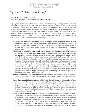 Kryzys szansą od Boga Rekolekcje Radiowe 2012 Tydzień 2: Nie lękajcie się! Dzień 9 (8 marca 2012, czwartek) Tekst do rozważania na dzisiejszy dzień: Mk 4, 35–41 Gdy zapadł wieczór owego dnia, rzekł do nich: «Przeprawmy się na drugą stronę». Zostawili więc tłum, a Jego zabrali, tak jak był w łodzi. Także inne łodzie płynęły z Nim. Naraz zerwał się gwałtowny wicher. Fale biły w łódź, tak że łódź już się napełniała. On zaś spał w tyle łodzi na wezgłowiu. Zbudzili Go i powiedzieli do Niego: «Nauczycielu, nic Cię to nie obchodzi, że giniemy?» On wstał, rozkazał wichrowi i rzekł do jeziora: «Milcz, ucisz się!» Wicher się uspokoił i nastała głęboka cisza. Wtedy rzekł do nich: «Czemu tak bojaźliwi jesteście? Jakże wam brak wiary?» Oni zlękli się bardzo i mówili jeden do drugiego: «Kim właściwie On jest, że nawet wicher i jezioro są Mu posłuszne?». Na początku modlitwy uświadom sobie, że stajesz przed Bogiem i chcesz z Nim rozmawiać. On jest teraz obecny przy Tobie. Po uczynieniu znaku krzyża poproś Go o łaskę skupienia na modlitwie, aby to Duch Święty ją prowadził i usuwał wszelkie przeszkody, oraz aby Twoje myśli, zamiary i decyzje oczyszczał i kierował ku większej chwale Boga. Wchodząc w modlitwę przypomnij sobie tekst, który będziesz rozważał (możesz go jeszcze raz przeczytać), a następnie wyobraź sobie rozważaną scenę burzy na jeziorze. Uczniowie na zaproszenie Jezusa po trudnym i pracowitym dniu wsiadają do łodzi, aby przepłynąć na drugą stronę i odpocząć. Bądź przez cały ten czas z nimi, w łodzi. Poczuj najpierw spokój, wręcz komfort żeglowania, zobacz uczniów, śpiącego Jezusa, sąsiednie łodzie płynące obok. Mają przepłynąć na drugą stronę, na odpoczynek. Nagle zrywa się gwałtowny wiatr. Napierające fale zaczynają zalewać łódź. Nie sposób opanować sytuacji. Robi się niebezpiecznie. Zobacz siebie w tej sytuacji. A Jezus spokojnie śpi. „Jak możesz tak spać!? Nie widzisz, co się dzieje? Przecież za chwilę łódź zatonie! A co z nami!?” wołają uczniowie. Jezus jednym gestem ucisza żywioły. I pyta: „Dlaczego brak wam wiary?” Uczniowie lękliwie zastanawiają się: „Kim On właściwie jest?” Poproś teraz Pana o to, czego pragniesz. Dziś poproś szczególnie o łaskę wiary w to, że Jezus jest zawsze z Tobą: wtedy gdy jesteś bezpieczny i wtedy, gdy Ci coś zagraża. Jezus daje zadanie, bardzo proste, takie, które już wiele razy wykonywałeś. Wiesz, jak to się robi. Uczniowie nie pierwszy raz płynęli łodzią – byli rybakami i wiedzieli, jak trzeba postąpić. Tak jak i Ty, znali zagrożenia i niebezpieczeństwa z tym związane. Byli przekonani, że w tak prostej sprawie sobie poradzą. Cóż to jest dla nich, cóż to jest dla Ciebie?! Czy w sytuacji prostej i jasnej, gdy nic Ci nie grozi, prosisz Jezusa o pomoc? A może jesteś przekonany, że sam sobie poradzisz i tak, jak uczniowie zapominasz o Jezusie? Nagle pojawia się zagrożenie. Początkowo sytuacja jest trudna, ale wiadomo co robić. Wydaje się, że panujemy na sytuacją: uczniowie nad łodzią, Ty nad zadaniem, czy problemem, który stoi przed Tobą. Ale sytuacja wcale się nie poprawia. Pomimo znanych i realizowanych zabiegów wcale nie jest lepiej. Robi się coraz trudniej i, co gorsza, niebezpiecznie. I to się pogłębia. Już nie wiadomo, co robić. Zostajesz sam. „Boże, gdzie Ty jesteś!?!? Nie widzisz, że sobie nie radzę? Nic Cię to nie obchodzi, że ginę!?!?” Czy miałeś tak dramatyczne przejścia w swoim życiu? Jak się wtedy czułeś? Czy zwracałeś się do Jezusa o pomoc? Jeśli nie przeżywałeś takich sytuacji, spróbuj w oparciu o tę scenę teraz ją przeżyć. Co czujesz? Co chcesz powiedzieć Jezusowi? Powiedz mu o swoim lęku. Nie obawiaj się tego. Jezus jednym gestem ręki ucisza burzę. Otoczenie zewnętrzne wraca do poprzedniego stanu. Nastaje cisza i pokój. Ale pojawia się pytanie Jezusa do Ciebie: „Dlaczego jesteś tak bojaźliwy?” I proste stwierdzenie: „Jakże bardzo brakuje Ci jeszcze wiary!” Co na to powiesz? Zewnętrzne czynniki mogą wywoływać w nas przestrach, czasem do tego stopnia, że Jezusowi może być trudno przebić się przez nasze przerażenie. Ale to od nas zależy, na czym chcemy bardziej skupiać uwagę: na wichrze, na tym, co przeraża czy też na Jezusie, który przychodzi, abyśmy mieli wiarę silniejszą od lęku. A Ty na czym chcesz skupić swoją uwagę? Na koniec porozmawiaj z Jezusem o tym wszystkim, co zrodziło się w Twoim sercu pod wpływem dzisiejszej modlitwy. Wypowiedz przed Nim swoje uczucia – radości, pokoju, bezpieczeństwa, ale również smutku, obawy, lęku. Bądź szczery przed Panem. Możesz Mu podziękować za to, co odkryłeś lub poprosić Go o coś, czego bardzo potrzebujesz. Porozmawiaj z Nim przez chwilę serdecznie – jak przyjaciel z przyjacielem. Na zakończenie pomódl się słowami modlitwy „Ojcze nasz”. © Trójmiejska Wspólnota Życia Chrześcijańskiego www.wzch-trojmiasto.pl