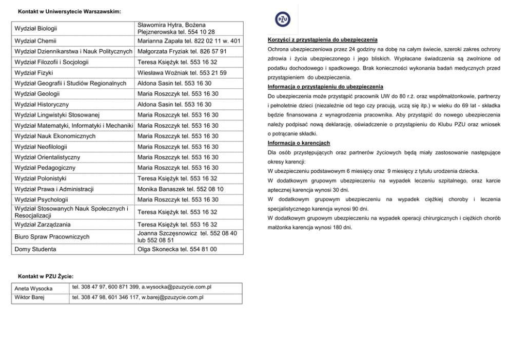 Kontakt w Uniwersytecie Warszawskim: Sławomira Hytra, Bożena Plejznerowska tel. 554 10 28 Marianna Zapała tel. 822 02 11 w. 401 Wydział Biologii Wydział Chemii Wydział Dziennikarstwa i Nauk Politycznych Małgorzata Fryziak tel. 826 57 91 Korzyści z przystąpienia do ubezpieczenia Ochrona ubezpieczeniowa przez 24 godziny na dobę na całym świecie, szeroki zakres ochrony zdrowia i życia ubezpieczonego i jego bliskich. Wypłacane świadczenia są zwolnione od Wydział Filozofii i Socjologii Teresa Księżyk tel. 553 16 32 Wydział Fizyki Wiesława Woźniak tel. 553 21 59 Wydział Geografii i Studiów Regionalnych Aldona Sasin tel. 553 16 30 Wydział Geologii Informacja o przystąpieniu do ubezpieczenia Maria Roszczyk tel. 553 16 30 Do ubezpieczenia może przystąpić pracownik UW do 80 r.ż. oraz współmałżonkowie, partnerzy Wydział Historyczny Aldona Sasin tel. 553 16 30 i pełnoletnie dzieci (niezależnie od tego czy pracują, uczą się itp.) w wieku do 69 lat - składka Wydział Lingwistyki Stosowanej Maria Roszczyk tel. 553 16 30 będzie finansowana z wynagrodzenia pracownika. Aby przystąpić do nowego ubezpieczenia Wydział Matematyki, Informatyki i Mechaniki Maria Roszczyk tel. 553 16 30 należy podpisać nową deklarację, oświadczenie o przystąpieniu do Klubu PZU oraz wniosek Wydział Nauk Ekonomicznych Maria Roszczyk tel. 553 16 30 o potrącanie składki. Wydział Neofilologii Maria Roszczyk tel. 553 16 30 Wydział Orientalistyczny Maria Roszczyk tel. 553 16 30 Wydział Pedagogiczny Maria Roszczyk tel. 553 16 30 Wydział Polonistyki Teresa Księżyk tel. 553 16 32 Wydział Prawa i Administracji Monika Banaszek tel. 552 08 10 aptecznej karencja wynosi 30 dni. Wydział Psychologii Wydział Stosowanych Nauk Społecznych i Resocjalizacji Wydział Zarządzania Maria Roszczyk tel. 553 16 30 W Teresa Księżyk tel. 553 16 32 specjalistycznego karencja wynosi 90 dni. Biuro Spraw Pracowniczych Domy Studenta Teresa Księżyk tel. 553 16 32 Joanna Szczęsnowicz tel. 552 08 40 lub 552 08 51 Olga Skonecka tel. 554 81 00 Kontakt w PZU Życie: Aneta Wysocka tel. 308 47 97, 600 871 399, [email protected] Wiktor Barej tel. 308 47 98, 601 346 117, [email protected] podatku dochodowego i spadkowego. Brak konieczności wykonania badań medycznych przed przystąpieniem do ubezpieczenia. Informacja o karencjach Dla osób przystępujących oraz partnerów życiowych będą miały zastosowanie następujące okresy karencji: W ubezpieczeniu podstawowym 6 miesięcy oraz 9 miesięcy z tytułu urodzenia dziecka. W dodatkowym grupowym ubezpieczeniu na wypadek leczeniu szpitalnego, oraz karcie dodatkowym grupowym ubezpieczeniu na wypadek ciężkiej choroby i leczenia W dodatkowym grupowym ubezpieczeniu na wypadek operacji chirurgicznych i ciężkich chorób małżonka karencja wynosi 180 dni. Progra Ubezpieczeniowy dla Pracowników Uniwersytetu Warszawskiego oraz ich współmałżonków partnerów życiowych i pełnoletnich dzieci Grupowe Ubezpieczenie Pracownicze typ P Plus RODZAJ ŚWIADCZENIA / KWOTA ŚWIADCZENIA Zgon ubezpieczonego (naturalny) Zgon ubezpieczonego w wyniku NW zgon ubezpieczonego w wyniku zawału zgon ubezpieczonego spowodowany WK zgon ubezpieczonego spowodowany WP zgon ubezpieczonego spowodowany WK+WP TU za 1% trwałego uszczerbku TU za 1% trwałego uszczerbku w wyniku zawału zgon współmałżonka zgon współmałżonka w wyniku NW Zgon dziecka Zgon rodziców teściów Urodzenie dziecka Martwe urodzenie dziecka Osierocenie dziecka OBECNY OBECNY OBECNY OBECNY NOWY 38 000 76 000 63 000 96 000 96 000 116 000 380 380 12 350 22 350 3 000 2 000 1 000 2 000 4 000 44 000 88 000 121 000 121 000 121 000 154 000 440 440 14 300 26 300 3 474 2 316 1158 2 316 4 632 52 000 104 000 91 000 156 000 156 000 208 000 520 520 16 900 30 900 4 106 2 737 1 369 2 738 5 474 150 000 300 000 300 000 500 000 500 000 700 000 650 650 25 000 50 000 3 000 10 000 28 000 56 000 45 500 91 000 91 000 126 000 350 280 8 750 15 750 2 450 1 750 700 1 400 3 400 125 150 150 175 75 150 180 180 210 90 175 210 210 245 105 240 320 320 400 320 87,50 105 105 122,50 52,50 50 60 70 80 35 500 25 4 500 1 750/1 050/350 2 500 9 500 300 2 000 TAK 48 zł 600 30 5 500 2 500/1 500/500 2 500 11 000 300 2 500 TAK 55 zł 700 35 6 500 3 500/2 100/700 5 000 13 000 300 3 000 TAK 65 zł 800 40 7 000 4 000/2 400/800 5 000 25 000 300 5 000 TAK 100 zł 350 17,50 3 450 1 500/900/300 2 500 7 000 300 2 000 TAK 40 zł Za każdy dzień pobytu ubezpieczonego w szpitalu: nieszczęśliwym wypadkiem wypadkiem komunikacyjnym wypadkiem przy pracy wypadkiem komunikacyjnym w pracy zawałem serca lub krwotokiem śródmózgowym chorobą oraz powyższymi zdarzeniami powyżej 14 dnia Pobyt w szpitalu na OIT Rekonwalescencja Ciężkie choroby – zakres rozszerzony Operacje chirurgiczne Leczenie specjalistyczne Trwała niezdolność do pracy Karta Apteczna Ciężkie choroby małżonka – zakres podstawowy Karta Klubu PZU POMOC Składka miesięczna: NW –nieszczęśliwy wypadek, WK – wypadek komunikacyjny, WP – wypadek przy pracy, TU – trwały uszczerbek, OIT - Oddział Intensywnej Terapii Kwota świadczenia jest skumulowaną wysokością świadczeń wynikających z OWU wypłacaną w przypadku zajścia danego zdarzenia.