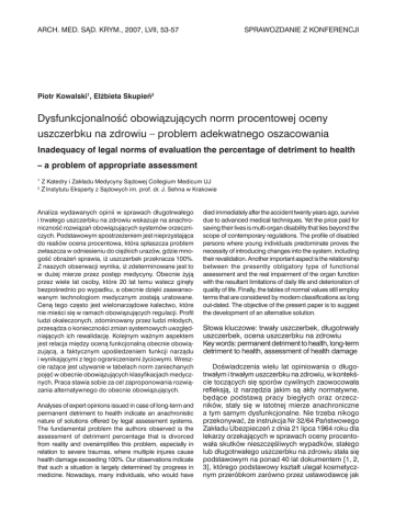 ARCH. MED. SĄD. KRYM., 2007, LVII, 53-57 Sprawozdanie z konferencji Piotr Kowalski1, Elżbieta Skupień2 Dysfunkcjonalność obowiązujących norm procentowej oceny uszczerbku na zdrowiu – problem adekwatnego oszacowania Inadequacy of legal norms of evaluation the percentage of detriment to health – a problem of appropriate assessment 1 2 Z Katedry i Zakładu Medycyny Sądowej Collegium Medicum UJ Z Instytutu Eksperty z Sądowych im. prof. dr. J. Sehna w Krakowie Analiza wydawanych opinii w sprawach długotrwałego i trwałego uszczerbku na zdrowiu wskazuje na anachroniczność rozwiązań obowiązujących systemów orzeczniczych. Podstawowym spostrzeżeniem jest nieprzystająca do realiów ocena procentowa, która spłaszcza problem zwłaszcza w odniesieniu do ciężkich urazów, gdzie mnogość obrażeń sprawia, iż uszczerbek przekracza 100%. Z naszych obserwacji wynika, iż zdeterminowane jest to w dużej mierze przez postęp medycyny. Obecnie żyją przez wiele lat osoby, które 20 lat temu wstecz ginęły bezpośrednio po wypadku, a obecnie dzięki zaawansowanym technologiom medycznym zostają uratowane. Ceną tego często jest wielonarządowe kalectwo, które nie mieści się w ramach obowiązujących regulacji. Profil ludzi okaleczonych, zdominowany przez ludzi młodych, przesądza o konieczności zmian systemowych uwzględniających ich rewalidację. Kolejnym ważnym aspektem jest relacja między oceną funkcjonalną obecnie obowiązującą, a faktycznym upośledzeniem funkcji narządu i wynikającymi z tego ograniczeniami życiowymi. Wreszcie rażące jest używanie w tabelach norm zaniechanych pojęć w obecnie obowiązujących klasyfikacjach medycznych. Praca stawia sobie za cel zaproponowania rozwiązania alternatywnego do obecnie obowiązujących. Analyses of expert opinions issued in case of long-term and permanent detriment to health indicate an anachronistic nature of solutions offered by legal assessment systems. The fundamental problem the authors observed is the assessment of detriment percentage that is divorced from reality and oversimplifies this problem, especially in relation to severe traumas, where multiple injures cause health damage exceeding 100%. Our observations indicate that such a situation is largely determined by progress in medicine. Nowadays, many individuals, who would have died immediately after the accident twenty years ago, survive due to advanced medical techniques. Yet the price paid for saving their lives is multi-organ disability that lies beyond the scope of contemporary regulations. The profile of disabled persons where young individuals predominate proves the necessity of introducing changes into the system, including their revalidation. Another important aspect is the relationship between the presently obligatory type of functional assessment and the real impairment of the organ function with the resultant limitations of daily life and deterioration of quality of life. Finally, the tables of normal values still employ terms that are considered by modern classifications as long out-dated. The objective of the present paper is to suggest the development of an alternative solution. Słowa kluczowe: trwały uszczerbek, długotrwały uszczerbek, ocena uszczerbku na zdrowiu Key words: permanent detriment to health, long-term detriment to health, assessment of health damage Doświadczenia wielu lat opiniowania o długotrwałym i trwałym uszczerbku na zdrowiu, w kontekś cie toczących się sporów cywilnych zaowocowała refleksją, iż narzędzia jakim są akty normatywne, będące podstawą pracy biegłych oraz orzeczników, stały się w istotnej mierze anachroniczne a tym samym dysfunkcjonalne. Nie trzeba nikogo przekonywać, że instrukcja Nr 32/64 Państwowego Zakładu Ubezpieczeń z dnia 21 lipca 1964 roku dla lekarzy orzekających w sprawach oceny procentowała skutków nieszczęśliwych wypadków, stałego lub długotrwałego uszczerbku na zdrowiu stała się podstawowym na ponad 40 lat dokumentem [1, 2, 3], którego podstawowy kształt ulegał kosmetycznym przeróbkom zarówno przez ustawodawcę jak 54 Piotr Kowalski, Elżbieta Skupień w mniejszym lub w większym stopniu przez towarzystwa ubezpieczeniowe. Nowelizacja wprowadzona w 2002 roku rozporządzenia o ocenie stałego i długotrwałego uszczerbku na zdrowiu jest przykładem tych kosmetycznych rozwiązań. Pomijam elementarne braki w tych dokumentach, jak brak komentarza co do podstaw kwalifikacji wymienianych skutków dla poszczególnych ocen, archaiczne zaniechane rozpoznania czy też wyłączne zainteresowanie następstwami zdarzeń nagłych urazowych i pominięcie wielu innych stanów klinicznych będących ścisłymi następstwami urazów. Motywującym do podjęcia tego problemu jest oczywiste dla wszystkich zjawi- Nr 1 sko, że nieadekwatna ocena uszczerbku na zdrowiu skutkuje niemożnością realnego oszacowania rzeczywistych kosztów finansowych związanych z następstwami wypadków, mając na myśli każde nagłe zdarzenie niezależnie od miejsca gdzie ono wystąpiło [4, 5, 6, 7, 8]. Opiniując o skutkach długotrwałych i trwałych pokusiliśmy się w latach 2002-2006 na oderwanie się od narzuconej cezury maksymalnego stu procentowego uszczerbku na zdrowiu [9, 10] i okazało się, iż w 30% przypadków uszczerbek ten wynosił od 110% do 255%, kilka z nich prezentujemy w poniższych tabelach. Tabela I. Rodzaj następstwa obrażeń, mężczyzna, lat 17 Procent trwałego uszczerbku na zdrowiu wg Rozp. Min. Pracy i Polityki Społecznej 10 złamanie wieloodłamowe dołu przedniego podstawy czaszki złamanie lewej kości ciemieniowej z wgnieceniem odłamów, z ubytkiem kostnym złamanie lewej szczęk złamanie lewej kości ramiennej z przemieszczeniem porażenie prawego nerwu strzałkowego pourazowa afazja motoryczno-sensoryczna z agrafią blizny szpecące na twarzy łącznie 25 5 25 20 80 10 175% Tabela II. Rodzaj następstwa obrażeń, kobieta, lat 27 Procent trwał