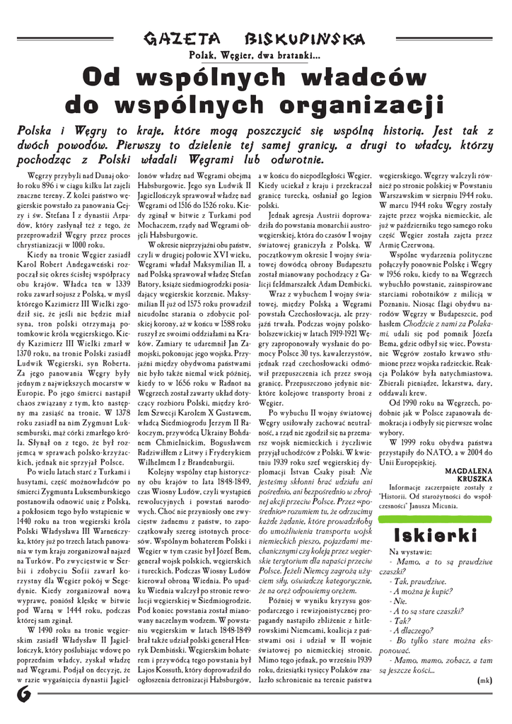 Polak, Węgier, dwa bratanki... Od wspólnych władców do wspólnych organizacji Polska i Węgry to kraje, które mogą poszczycić się wspólną historią. Jest tak z dwóch powodów. Pierwszy to dzielenie tej samej granicy, a drugi to władcy, którzy pochodząc z Polski władali Węgrami lub odwrotnie. Węgrzy przybyli nad Dunaj oko− ło roku 896 i w ciągu kilku lat zajęli znaczne tereny. Z kolei państwo wę− gierskie powstało za panowania Gej− zy i św. Stefana I z dynastii Arpa− dów, który zasłynął też z tego, że przeprowadził Węgry przez proces chrystianizacji w 1000 roku. Kiedy na tronie Węgier zasiadł Karol Robert Andegaweński roz− począł się okres ścisłej współpracy obu krajów. Władca ten w 1339 roku zawarł sojusz z Polską, w myśl którego Kazimierz III Wielki zgo− dził się, że jeśli nie będzie miał syna, tron polski otrzymają po− tomkowie króla węgierskiego. Kie− dy Kazimierz III Wielki zmarł w 1370 roku, na tronie Polski zasiadł Ludwik Węgierski, syn Roberta. Za jego panowania Węgry były jednym z największych mocarstw w Europie. Po jego śmierci nastąpił chaos związany z tym, kto następ− ny ma zasiąść na tronie. W 1378 roku zasiadł na nim Zygmunt Luk− semburski, mąż córki zmarłego kró− la. Słynął on z tego, że był roz− jemcą w sprawach polsko−krzyżac− kich, jednak nie sprzyjał Polsce. Po wielu latach starć z Turkami i husytami, część możnowładców po śmierci Zygmunta Luksemburskiego postanowiła odnowić unię z Polską, a pokłosiem tego było wstąpienie w 1440 roku na tron węgierski króla Polski Władysława III Warneńczy− ka, który już po trzech latach panowa− nia w tym kraju zorganizował najazd na Turków. Po zwycięstwie w Ser− bii i zdobyciu Sofii zawarł ko− rzystny dla Węgier pokój w Sege− dynie. Kiedy zorganizował nową wyprawę, poniósł klęskę w bitwie pod Warną w 1444 roku, podczas której sam zginął. W 1490 roku na tronie węgier− skim zasiadł Władysław II Jagiel− lończyk, który poślubiając wdowę po poprzednim władcy, zyskał władzę nad Węgrami. Podjął on decyzję, że w razie wygaśnięcia dynastii Jagiel− lonów władzę nad Węgrami obejmą Habsburgowie. Jego syn Ludwik II Jagiellończyk sprawował władzę nad Węgrami od 1516 do 1526 roku. Kie− dy zginął w bitwie z Turkami pod Mochaczem, rządy nad Węgrami ob− jęli Habsburgowie. W okresie nieprzyjaźni obu państw, czyli w drugiej połowie XVI wieku, Węgrami władał Maksymilian II, a nad Polską sprawował władzę Stefan Batory, książe siedmiogrodzki posia− dający węgierskie korzenie. Maksy− milian II już od 1575 roku prowadził nieudolne starania o zdobycie pol− skiej korony, aż w końcu w 1588 roku ruszył ze swoimi oddziałami na Kra− ków. Zamiary te udaremnił Jan Za− mojski, pokonując jego wojska. Przy− jaźni między obydwoma państwami nie było także niemal wiek później, kiedy to w 1656 roku w Radnot na Węgrzech został zawarty układ doty− czący rozbioru Polski, między kró− lem Szwecji Karolem X Gustawem, władcą Siedmiogrodu Jerzym II Ra− koczym, przywódcą Ukrainy Bohda− nem Chmielnickim, Bogusławem Radziwiłłem z Litwy i Fryderykiem Wilhelmem I z Brandenburgii. Kolejny wspólny etap historycz− ny obu krajów to lata 1848−1849, czas Wiosny Ludów, czyli wystąpień rewolucyjnych i powstań narodo− wych. Choć nie przyniosły one zwy− cięstw żadnemu z państw, to zapo− czątkowały szereg istotnych proce− sów. Wspólnym bohaterem Polski i Węgier w tym czasie był Józef Bem, generał wojsk polskich, węgierskich i tureckich. Podczas Wiosny Ludów kierował obroną Wiednia. Po upad− ku Wiednia walczył po stronie rewo− lucji węgierskiej w Siedmiogrodzie. Pod koniec powstania został miano− wany naczelnym wodzem. W powsta− niu węgierskim w latach 1848−1849 brał także udział polski generał Hen− ryk Dembiński. Węgierskim bohate− rem i przywódcą tego powstania był Lajos Kossuth, który doprowadził do ogłoszenia detronizacji Habsburgów, a w końcu do niepodległości Węgier. Kiedy uciekał z kraju i przekraczał granicę turecką, osłaniał go legion polski. Jednak agresja Austrii doprowa− dziła do powstania monarchii austro− węgierskiej, która do czasów I wojny światowej graniczyła z Polską. W początkowym okresie I wojny świa− towej dowódcą obrony Budapesztu został mianowany pochodzący z Ga− licji feldmarszałek Adam Dembicki. Wraz z wybuchem I wojny świa− towej, między Polską a Węgrami powstała Czechosłowacja, ale przy− jaźń trwała. Podczas wojny polsko− bolszewickiej w latach 1919−1921 Wę− gry zaproponowały wysłanie do po− mocy Polsce 30 tys. kawalerzystów, jednak rząd czechosłowacki odmó− wił przepuszczenia ich przez swoją granicę. Przepuszczono jedynie nie− które kolejowe transporty broni z Węgier. Po wybuchu II wojny światowej Węgry usiłowały zachować neutral− ność, a rząd nie zgodził się na przema− rsz wojsk niemieckich i życzliwie przyjął uchodźców z Polski. W kwie− tniu 1939 roku szef węgierskiej dy− plomacji Istvan Csaky pisał: Nie jesteśmy skłonni brać udziału ani pośrednio, ani bezpośrednio w zbroj− nej akcji przeciw Polsce. Przez «po− średnio» rozumiem tu, że odrzucimy każde żądanie, które prowadziłoby do umożliwienia transportu wojsk niemieckich pieszo, pojazdami me− chanicznymi czy koleją przez węgier− skie terytorium dla napaści przeciw Polsce. Jeżeli Niemcy zagrożą uży− ciem siły, oświadczę kategorycznie, że na oręż odpowiemy orężem. Później w wyniku kryzysu gos− podarczego i rewizjonistycznej pro− pagandy nastąpiło zbliżenie z hitle− rowskimi Niemcami, koalicja z pań− stwami osi i udział w II wojnie światowej po niemieckiej stronie. Mimo tego jednak, po wrześniu 1939 roku, dziesiątki tysięcy Polaków zna− l