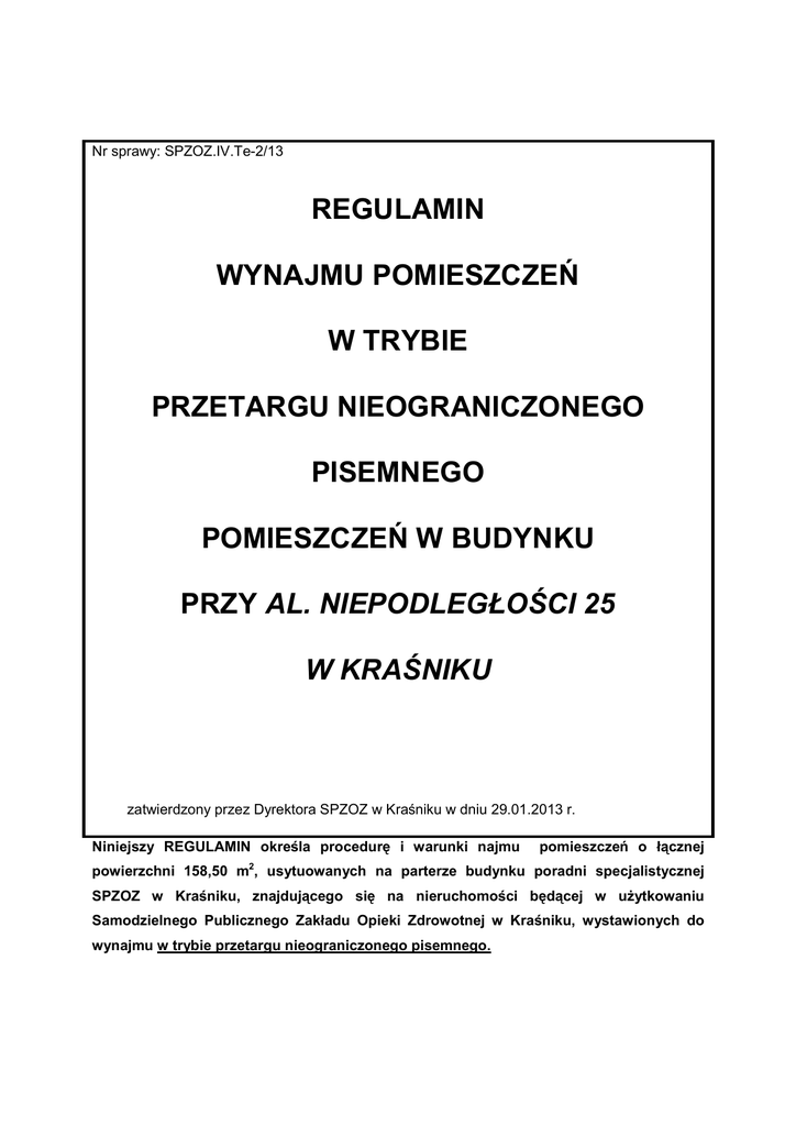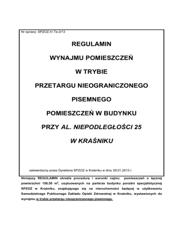 Nr sprawy: SPZOZ.IV.Te-2/13 REGULAMIN WYNAJMU POMIESZCZEŃ W TRYBIE PRZETARGU NIEOGRANICZONEGO PISEMNEGO POMIESZCZEŃ W BUDYNKU PRZY AL. NIEPODLEGŁOŚCI 25 W KRAŚNIKU zatwierdzony przez Dyrektora SPZOZ w Kraśniku w dniu 29.01.2013 r. Niniejszy REGULAMIN określa procedurę i warunki najmu pomieszczeń o łącznej 2 powierzchni 158,50 m , usytuowanych na parterze budynku poradni specjalistycznej SPZOZ w Kraśniku, znajdującego się na nieruchomości będącej w użytkowaniu Samodzielnego Publicznego Zakładu Opieki Zdrowotnej w Kraśniku, wystawionych do wynajmu w trybie przetargu nieograniczonego pisemnego. I. PRZEDMIOT PRZETARGU 1. Wynajem pomieszczeń o powierzchni 158,50 m2. Pomieszczenia usytuowane są na parterze budynku, znajdującego się na nieruchomości będącej w użytkowaniu SPZOZ w Kraśniku, położonej w Kraśniku, Al. Niepodległości 25, oznaczonej w ewidencji gruntów i budynków jako działka nr 124/2 obręb 1-Północ. 2. Najemca we własnym zakresie i na swój koszt dokona adaptacji pomieszczeń na potrzeby prowadzonej działalności oraz wyposaży pomieszczenia w meble i sprzęt niezbędny do uruchomienia działalności a także dokona wszelkich uzgodnień i zgłoszeń umożliwiających uruchomienie działalności. II. POSTANOWIENIA OGÓLNE 1. Ilekroć w regulaminie jest mowa o: 1.1. Wynajmującym – należy przez to rozumieć Samodzielny Publiczny Zakład Opieki Zdrowotnej w Kraśniku (SPZOZ w Kraśniku); 1.2. Nieruchomości – należy przez to rozumieć pomieszczenia o łącznej powierzchni 158,50 m2 opisane w dziale I. 1.3. Oferencie – należy przez to rozumieć osobę fizyczną lub prawną lub jednostkę organizacyjną nieposiadającą osobowości prawnej, prowadzącą działalności gospodarczą, która złożyła ofertę na zasadach określonych niniejszym regulaminem, 1.4. Najemcy – należy przez to rozumieć Oferenta, którego oferta została uznana za najkorzystniejszą w tym postępowaniu. 2. Umowa najmu zostanie zawarta na czas określony – 12 m-cy od dnia podpisania umowy. 3. Wynajmujący określił wywoławczą wysokość czynszu w wysokości netto 30 zł/m2 miesięcznie. 4. W opłacie czynszu zawarte są wszystkie inne koszty związane z eksploatacją pomieszczeń: energia elektryczna, woda i ścieki, ogrzewanie, wywóz nieczystości. 5. Opłata czynszowa o której mowa płatna będzie miesięcznie na podstawie wystawionych przez Wynajmującego faktur w terminie do ostatniego dnia każdego miesiąca . III. PROCEDURA WYNJAMU POMIESZCZEŃ 1. Procedura postępowania przetargowego na wynajem pomieszczeń obejmuje następujące etapy: A. Przedstawienie warunków ogłoszenia wynajmu pomieszczeń przez Wynajmującego. A.1. Wynajmujący pozyskuje Oferentów poprzez ogłoszenie wynajmu niniejszych pomieszczeń na stronie internetowej: www.spzoz.krasnik.pl Strona 2/6 A.2. Oferenci przed złożeniem oferty mogą kierować pisemne pytania do : SPZOZ w Kraśniku, ul. Chopina 13, lub tel. 81 825 13 55, email: [email protected] od poniedziałku do piątku w godzinach od 8:00 do 14:00. A.3. Zapewniona zostaje Oferentom możliwość wizji lokalnej pomieszczeń po uprzednim uzgodnieniu terminu z Panem Markiem Kiebasińskim, tel. 81 825 13 55. B. Złożenie ofert i ich ocena. B.1. W przetargu mogą brać udział Oferenci, którzy złożą ofertę w terminie i na zasadach określonych w regulaminie oraz ogłoszeniu. B.2. Oferty winny być składane w zaklejonych kopertach w formie pisemnej pod rygorem nieważności w terminie i na zasadach określonych w regulaminie oraz ogłoszeniu o przetargu. B.3. Oferta powinna zawierać następujące dokumenty i oświadczenia w formie pisemnej: B.3.1. imię, nazwisko, adres / nazwę firmy, siedzibę zainteresowanego oraz oferowaną wysokość miesięcznego czynszu (zgodnie z załącznikiem nr 1 – Formularzem ofertowym); B.7.2. dokumenty rejestrowe: w przypadku podmiotu krajowego aktualny wyciąg z Krajowego Rejestru Sądowego lub zaświadczenie o wpisie do ewidencji działalności gospodarczej; w przypadku podmiotu zagranicznego aktualny wyciąg z właściwego rejestru, w którym podmiot zagraniczny jest wpisany.; B.4. Treść oferty oraz załączone dokumenty powinny być sporządzone w języku polskim (tłumaczenia z innego języka powinny być dokonane przez tłumacza przysięgłego). B.5. Wszystkie dokumenty powinny być złożone w oryginałach lub kopiach poświadczonych przez Oferenta za zgodność z oryginałem oraz powinny mieć stosowne podpisy osób upoważnionych. B.6. Składane dokumenty i oświadczenia powinny być właściwe dla formy prawnej podmiotu i prowadzonej przez niego działalności. B.7. Przystąpienie oferenta do przetargu skutkuje związaniem go treścią oferty aż do upływu wyznaczonego terminu, zgodnego z terminem podanym w ogłoszeniu. B.8. W przypadku przesłania oferty pocztą (kurierem), za termin złożenia oferty uznaje się termin potwierdzenia odbioru oferty przez Wynajmującego. B.9. Otwarcie ofert nastąpi w terminie i miejscu podanym w ogłoszeniu. B.10. Przetarg składa się z części jawnej i niejawnej. B.10.1. Część jawna przetargu odbywa się w obecności Oferentów. Strona 3/6 B.10.2. W części jawnej komisja: • stwierdza prawidłowość ogłoszenia o przetargu, • ustala liczbę zgłoszonych ofert, • dokonuje otwarcia kopert, • odczytuje ceny ze złożonych ofert, • zawiadamia o terminie i miejscu części niejawnej przetargu, • zawiadamia oferentów o przewidywanym terminie zamknięcia przetargu. B.10.3. Komisja przetargowa odmawia zakwalifikowania ofert do części niejawnej przetargu, jeśli: • nie odpowiadają warunkom przetargu, • zostały zgłoszone po wyznaczonym terminie, • są nieczytelne lub budzą wątpliwości co do ich treści. B.10.4. W części niejawnej przetargu Komisja przetargowa dokonuje szczegółowej analizy ofert i wybiera najkorzystniejszą, kierując się oferowaną ceną lub stwierdza, że nie wybrano żadnej ze złożonych 