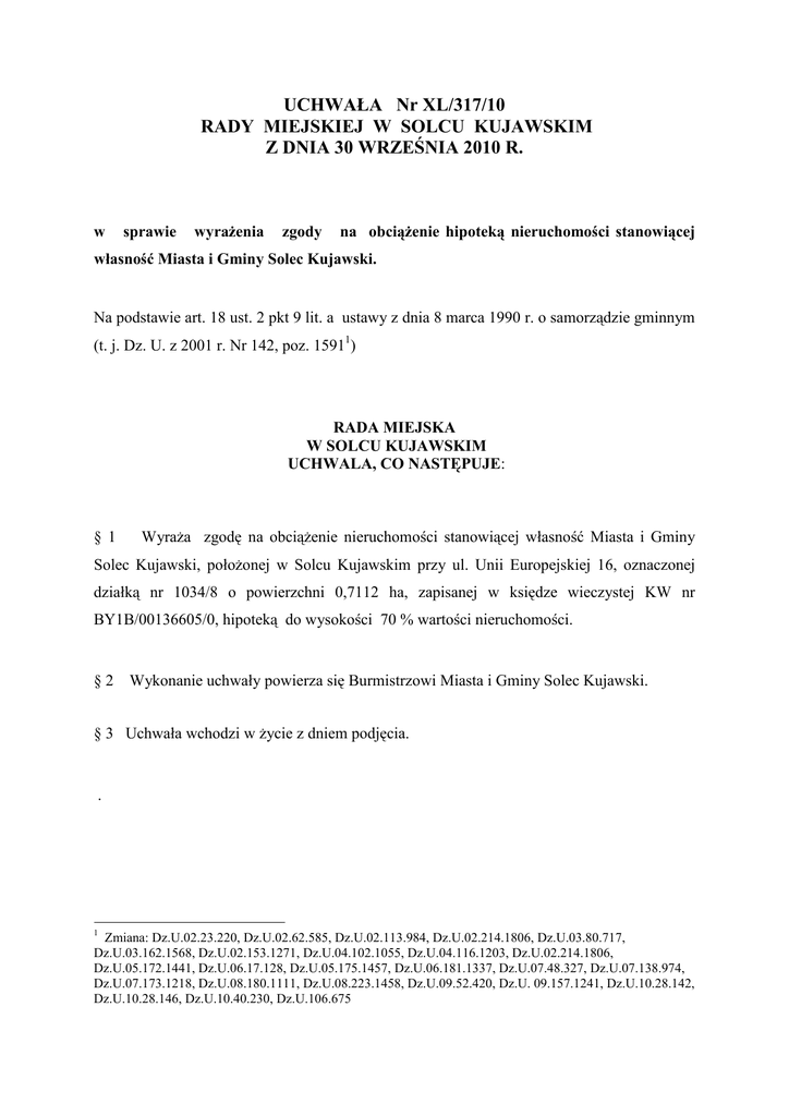 UCHWAŁA Nr XL/317/10 RADY MIEJSKIEJ W SOLCU KUJAWSKIM Z DNIA 30 WRZEŚNIA 2010 R. w sprawie wyrażenia zgody na obciążenie hipoteką nieruchomości stanowiącej własność Miasta i Gminy Solec Kujawski. Na podstawie art. 18 ust. 2 pkt 9 lit. a ustawy z dnia 8 marca 1990 r. o samorządzie gminnym (t. j. Dz. U. z 2001 r. Nr 142, poz. 15911) RADA MIEJSKA W SOLCU KUJAWSKIM UCHWALA, CO NASTĘPUJE: § 1 Wyraża zgodę na obciążenie nieruchomości stanowiącej własność Miasta i Gminy Solec Kujawski, położonej w Solcu Kujawskim przy ul. Unii Europejskiej 16, oznaczonej działką nr 1034/8 o powierzchni 0,7112 ha, zapisanej w księdze wieczystej KW nr BY1B/00136605/0, hipoteką do wysokości 70 % wartości nieruchomości. §2 Wykonanie uchwały powierza się Burmistrzowi Miasta i Gminy Solec Kujawski. § 3 Uchwała wchodzi w życie z dniem podjęcia. . 1 Zmiana: Dz.U.02.23.220, Dz.U.02.62.585, Dz.U.02.113.984, Dz.U.02.214.1806, Dz.U.03.80.717, Dz.U.03.162.1568, Dz.U.02.153.1271, Dz.U.04.102.1055, Dz.U.04.116.1203, Dz.U.02.214.1806, Dz.U.05.172.1441, Dz.U.06.17.128, Dz.U.05.175.1457, Dz.U.06.181.1337, Dz.U.07.48.327, Dz.U.07.138.974, Dz.U.07.173.1218, Dz.U.08.180.1111, Dz.U.08.223.1458, Dz.U.09.52.420, Dz.U. 09.157.1241, Dz.U.10.28.142, Dz.U.10.28.146, Dz.U.10.40.230, Dz.U.106.675 UZASADNIENIE DO UCHWAŁY Nr XL/317/10 RADY MIEJSKIEJ W SOLCU KUJAWSKIM Z DNIA 30 WRZEŚNIA 2010 R. w sprawie wyrażenia zgody na obciążenie hipoteką nieruchomości stanowiącej własność Miasta i Gminy Solec Kujawski. Nieruchomość stanowiąca działkę nr 1034/8 o pow. 7112 m2, położona na terenie „Parku Przemysłowego” w Solcu Kujawskim przy ul. Unii Europejskiej 16, zapisana w KW nr BY1B/00136605/0, jest dzierżawiona na podstawie umowy dzierżawy nr 18/PP/2006 z dnia 19.05.2006 r. przez Pana Roberta Adamczyka właściciela firmy „Hobby”. W dniu 21.09.2010 r., Dzierżawca wystąpił z wnioskiem o wyrażenie zgody na obciążenie nieruchomości będącej własnością Gminy, hipoteką w wysokości 70 % wartości nieruchomości, w związku z zamiarem zaciągnięcia kredytu. Zaciągnięty kredyt przeznaczony będzie na wykup przedmiotowej nieruchomości gruntowej oraz na dalsze inwestycje w firmie. Zgodnie z operatem szacunkowym nr 19/10 z dnia 20 lipca 2010 r. wykonanym przez Biuro Ekspertyz i Wycen MIKROEKO ® Firma Konsultingowa w Bydgoszczy, wartość rynkowa nieruchomości wyżej wymienionej wynosi 3.508.000,00 zł , w tym: - wartość gruntu 505.000,00 zł, - wartość nakładów 3.003.000,00 zł. Dzierżawca przedmiotowej nieruchomości, korzysta z pomocy de minimis dla przedsiębiorstw realizujących inwestycje na terenie „Parku Przemysłowego” w Solcu Kujawskim, na podstawie Uchwały Nr XXV/178/2005 Rady Miejskiej w Solcu Kujawskim z dnia 17 czerwca 2005 r.. Biorąc powyższe pod uwagę, podjęcie uchwały w sprawie wyrażenia zgody na obciążenie nieruchomości stanowiącej własność Miasta i Gminy Solec Kujawski, oznaczonej działką nr 1034/8 o pow. 7112 m2, położonej na terenie „Parku Przemysłowego” w Solcu Kujawskim przy ul. Unii Europejskiej 16, zapisanej w KW nr BY1B/00136605/0, dzierżawionej na podstawie umowy dzierżawy nr 18/PP/2006 z dnia 19.05.2006 r. przez Pana Roberta Adamczyka właściciela firmy „Hobby”, jest w pełni uzasadnione.