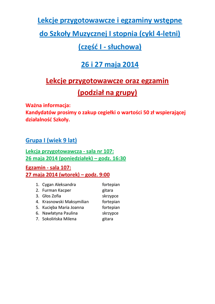 Lekcje przygotowawcze i egzaminy wstępne do Szkoły Muzycznej I stopnia (cykl 4-letni) (część I - słuchowa) 26 i 27 maja 2014 Lekcje przygotowawcze oraz egzamin (podział na grupy) Ważna informacja: Kandydatów prosimy o zakup cegiełki o wartości 50 zł wspierającej działalność Szkoły. Grupa I (wiek 9 lat) Lekcja przygotowawcza - sala nr 107: 26 maja 2014 (poniedziałek) – godz. 16:30 Egzamin - sala 107: 27 maja 2014 (wtorek) – godz. 9:00 1. 2. 3. 4. 5. 6. 7. Cygan Aleksandra Furman Kacper Głos Zofia Krasnowski Maksymilian Kucięba Maria Joanna Nawłatyna Paulina Sokolińska Milena fortepian gitara skrzypce fortepian fortepian skrzypce gitara Grupa II (wiek 9 lat) Lekcja przygotowawcza – sala nr 107: 26 maja 2014 (poniedziałek) – godz. 17:30 Egzamin – sala nr 107: 27 maja 2014 (wtorek) – godz. 10:00 1. 2. 3. 4. 5. 6. 7. 8. 9. Kuczyńska Katarzyna Łucka Marcelina Marczewska Amelia Ostapiński Karol Pańczyk Magdalena Połeć Oskar Popowicz Kamila Watras Adrian Wątkowska Magdalena flet lub gitara fortepian gitara lub fortepian skrzypce skrzypce gitara fortepian fortepian flet Grupa III (wiek 10 lat) Lekcja przygotowawcza – sala nr 107: 26 maja 2014 (poniedziałek) – godz. 18:30 Egzamin – sala nr 107: 27 maja 2014 (wtorek) – godz. 11:00 1. 2. 3. 4. 5. 6. 7. 8. Błaszczak Paweł Hajkowska Amelia Kańtoch Pola Malińska Paulina Olszak Justyna Osińska Gabriela Maria Pajdowski Piotr Jan Polak Hanna fortepian fortepian fortepian skrzypce fortepian skrzypce gitara fortepian Grupa IV (wiek 12 lat) Lekcja przygotowawcza – sala nr 207: 26 maja 2014 (poniedziałek) – godz. 16:30 Egzamin – sala nr 110: 27 maja 2014 (wtorek) – godz. 9:00 1. 2. 3. 4. 5. 6. 7. 8. Gąsior Iga Jamiołkowski Maciej Piróg Olga Sawczuk Julia Wziątek Karol Zarzeczna Kinga Zawiązałek Maja Zdanowicz Magdalena fortepian trąbka wiolonczela lub gitara fortepian fortepian saksofon fortepian gitara lub klarnet Grupa V (wiek 11 lat) Lekcja przygotowawcza – sala nr 207: 26 maja 2014 (poniedziałek) – godz. 17:30 Egzamin – sala nr 110: 27 maja 2014 (wtorek) – godz. 10:00 1. 2. 3. 4. 5. 6. 7. Kmicic Oliwia Kolasa Katarzyna Kulczycka Katarzyna Łazańska Angelika Łucka Miłosz Maychrzak Martyna Newłatyna Kacper fortepian gitara fortepian gitara perkusja gitara akordeon Grupa VI (wiek 11 - 12 lat) Lekcje przygotowawcze – sala nr 207: 26 maja 2014 (poniedziałek) – godz. 18:30 Egzamin – sala nr 110: 27 maja 2014 (wtorek) – godz. 11:00 1. 2. 3. 4. 5. 6. 7. 8. Geworgjan Robert Góralczyk Wanesa Kołsut Maciej Lech Tymoteusz Oleszek Paulina Rozwałka Alicja Szpot Julia Wośko Augustyn gitara gitara fortepian klarnet skrzypce skrzypce gitara gitara Grupa VII (wiek 12 - 13 lat) Lekcje przygotowawcze – sala nr 205: 26 maja 2014 (poniedziałek) – godz. 16:30 Egzamin – sala nr 112: 27 maja 2014 (wtorek) – godz. 9:00 1. 2. 3. 4. 5. 6. 7. 8. Bochyński Paweł Michał Hołod Izabela Jasińska Aleksandra Kaczmarek Gloria Mykitka Kacper Sokolińska Martyna Walczyna Julia Anna Żak Nikola gitara gitara fortepian flet gitara gitara obój fortepian Grupa VIII (wiek 13 - 14 lat) Lekcje przygotowawcze – sala nr 205: 26 maja 2014 (poniedziałek) – godz. 17:30 Egzamin – sala nr 112: 27 maja 2014 (wtorek) – godz. 10:00 1. 2. 3. 4. 5. 6. 7. 8. Kamińska Karolina Płecha Katarzyna Płucisz Alicja Stachira Izabela Szczypa Przemysław Szurek Anna Tarkowski Łukasz Wilczyński Jakub flet gitara fortepian wiolonczela gitara gitara perkusja akordeon Uwaga! Następujący uczniowie są zwolnieni z egzaminu wstępnego z części słuchowej i zgłaszają się tylko do komisji instrumentalnych wg planu 1. Zajączkowska Kinga 2. Maluga Ewa 3. Dorota Alicja gitara do 4 dz. (I mł.) flet do kl. III mł. fortepian do kl. III mł. (przeniesienie)