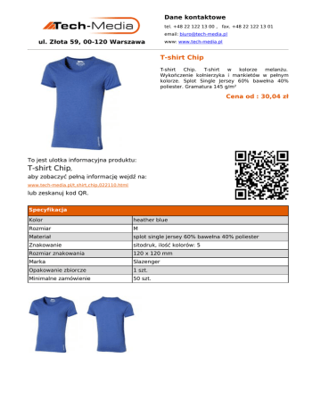 Dane kontaktowe tel. +48 22 122 13 00 , fax. +48 22 122 13 01 email: [email protected] ul. Złota 59, 00-120 Warszawa www: www.tech-media.pl T-shirt Chip T-shirt Chip. T-shirt w kolorze melanżu. Wykończenie kołnierzyka i mankietów w pełnym kolorze. Splot Single Jersey 60% bawełna 40% poliester. Gramatura 145 g/m² Cena od : 30,04 zł To jest ulotka informacyjna produktu: T-shirt Chip, aby zobaczyć pełną informację wejdź na: www.tech-media.pl/t,shirt,chip,022110.html lub zeskanuj kod QR. Specyfikacja Kolor heather blue Rozmiar M Materiał splot single jersey 60% bawełna 40% poliester Znakowanie sitodruk, ilość kolorów: 5 Rozmiar znakowania 120 x 120 mm Marka Slazenger Opakowanie zbiorcze 1 szt. Minimalne zamówienie 50 szt.