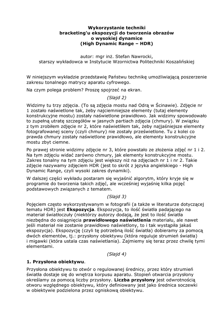 Wykorzystanie techniki bracketing'u ekspozycji do tworzenia obrazów o wysokiej dynamice (High Dynamic Range – HDR) autor: mgr inż. Stefan Nawrocki, starszy wykładowca w Instytucie Wzornictwa Politechniki Koszalińskiej W niniejszym wykładzie przedstawię Państwu technikę umożliwiającą poszerzenie zakresu tonalnego matrycy aparatu cyfrowego. Na czym polega problem? Proszę spojrzeć na ekran. (Slajd 2) Widzimy tu trzy zdjęcia. (To są zdjęcia mostu nad Odrą w Ścinawie). Zdjęcie nr 1 zostało naświetlone tak, żeby najciemniejsze elementy (tutaj elementy konstrukcyjne mostu) zostały naświetlone prawidłowo. Jak widzimy spowodowało to zupełną utratę szczegółów w jasnych partiach zdjęcia (chmury). W związku z tym zrobiłem zdjęcie nr 2, które naświetliłem tak, żeby najjaśniejsze elementy fotografowanej sceny (czyli chmury) nie zostały prześwietlone. Tu z kolei co prawda chmury zostały naświetlone prawidłowo, ale elementy konstrukcyjne mostu zbyt ciemne. Po prawej stronie widzimy zdjęcie nr 3, które powstało ze złożenia zdjęć nr 1 i 2. Na tym zdjęciu widać zarówno chmury, jak elementy konstrukcyjne mostu. Zakres tonalny na tym zdjęciu jest większy niż na zdjęciach nr 1 i nr 2. Takie zdjęcie nazywamy zdjęciem HDR (jest to skrót z języka angielskiego - High Dynamic Range, czyli wysoki zakres dynamiki). W dalszej części wykładu postaram się wyjaśnić algorytm, który kryje się w programie do tworzenia takich zdjęć, ale wcześniej wyjaśnię kilka pojęć podstawowych związanych z tematem. (Slajd 3) Pojęciem często wykorzystywanym w fotografii (a także w literaturze dotyczącej tematu HDR) jest Ekspozycja. Ekspozycja, to ilość światła padającego na materiał światłoczuły (niektórzy autorzy dodają, że jest to ilość światła niezbędna do osiągnięcia prawidłowego naświetlenia materiału, ale nawet jeśli materiał nie zostanie prawidłowo naświetlony, to i tak wystąpiła jakaś ekspozycja). Ekspozycję (czyli tę potrzebną ilość światła) dobieramy za pomocą dwóch elementów, tj.: przysłony obiektywu (która reguluje strumień światła) i migawki (która ustala czas naświetlania). Zajmiemy się teraz przez chwilę tymi elementami. 1. Przysłona obiektywu. (Slajd 4) Przysłona obiektywu to otwór o regulowanej średnicy, przez który strumień światła dostaje się do wnętrza korpusu aparatu. Stopień otwarcia przysłony określamy za pomocą liczby przysłony. Liczba przysłony jest odwrotnością otworu względnego obiektywu, który definiowany jest jako średnica soczewki w obiektywie podzielona przez ogniskową obiektywu. Celem takiego zdefiniowania liczby przysłony jest uzyskanie efektu polegającego na tym, że ilość światła wpadającego przez różne obiektywy (w tym obiektywy o różnych ogniskowych) jest taka sama, jeśli wybrano dla nich te same liczby przysłony. Liczby przysłony ustawiono w szereg, w którym każda kolejna wartość jest o pierwiastek z dwóch większa od poprzedniej. Czyli na obiektywie znajdziemy ciąg liczb: 1; 1,4; 2; 2,8; 4; 5,6; 8; 11; 16; 22; 32, itd. Zwróćmy uwagę na fakt, zwiększenie liczby przysłony o pierwiastek z dwóch oznacza dwukrotne zwiększenie pola powierzchni otworu, przez który przedostaje się światło, a więc zmiana przysłony o jeden stopień powoduje dwukrotne zwiększenie ilości wpadającego do aparatu światła. Drugim elementem, którym wpływamy na wielkość ekspozycji jest migawka 2. Migawka. (Slajd 5) Migawka – to urządzenie mechaniczne (lub elektroniczne), które reguluje czas, przez który światło pada na materiał światłoczuły. Ten czas nazywamy czasem naświetlania. Czasy naświetlania ustawiono w szereg, w którym każdy kolejny czas jest dwukrotnie krótszy lub dłuższy od poprzedniego. Np. 1 sek.; 1/2; 1/4; 1/8; 1/15; 1/30; 1/60; 1/125; 1/250; itd. Cechą charakterystyczną ekspozycji dobieranej za pomocą tak zdefiniowanych przysłon i czasów jest fakt, że tę samą ekspozycję uzyskamy dla różnych kombinacji czasu i przysłony. Np. przysłona 2 i czas 1/250 sek. da taki sam efekt, jak przysłona 4 i czas 1/60. Wykorzystując omówione wyżej zależności stworzono tzw. tabelę ekspozycji. Podstawą do stworzenia tej tabeli jest jednostka ekspozycji o nazwie EV (ang. Exposure Value). Wartość 0 EV oznacza ekspozycję przy przysłonie 1:1 przez czas 1 sekundy. (Slajd 6) Jak widzimy, tę samą ekspozycję możemy uzyskać stosując różne kombinacje przysłony i czasu naświetlania. (Slajd 7) Stopień zaczernienia materiału światłoczułego zależy od jego czułości, omówionej wyżej ekspozycji oraz oświetlenia fotografowanej sceny. 1. Czułość materiału światłoczułego jest miarą jego zdolnością do reakcji na padające światło. Im większa czułość, tym mniej światła jest potrzebne, aby wywołać określony stopień zaczernienia. Czułość również wyskalowano tak, aby dwukrotne zwiększenie czułości powodowało ten sam efekt, co dwukrotna zmiana czasu lub zmiana przysłony o jeden stopień. (Slajd 8) 2. Ekspozycja – jak widzimy ekspozycja nie oznacza wprost stopnia zaczernienia materiału światłoczułego, ale jedynie określoną kombinację czasu i przysłony. Czy kombinacja ta będzie wystarczająca do osiągnięcia określonego zaczernienia zależy od wspomnianej wyżej czułości oraz od oświetlenia sceny. 3. Oświetlenie – to najważniejszy element w fotografii. Bez oświetlenia nie ma zdjęcia. Problemem fotografii cyfrowej jest brak zdolności rejestrowania scen o zbyt dużej różnicy w oświetleniu poszczególnych części fotografowanej sceny. W warunkach naturalnego oświetlenia, różnice między partiami oświetlonymi, a zacienionymi mogą sięgać 20 EV. Tymczasem matryca aparatu cyfrowego ma zdolność do rejestrowania scen o rozpiętości do około 8 EV. Jeśli rozpiętość tonalna (czyli różnica między jasnością partii oświetlonych, a jasnością parti