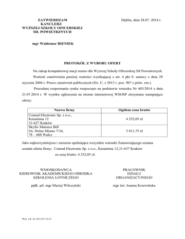 Dęblin, dnia 28.07. 2014 r. ZATWIERDZAM KANCLERZ WYŻSZEJ SZKOŁY OFICERSKIEJ SIŁ POWIETRZNYCH mgr Waldemar BIENIEK PROTOKÓŁ Z WYBORU OFERT Na zakup kompaktowej stacji meteo dla Wyższej Szkoły Oficerskiej Sił Powietrznych. Wartość zamówienia poniżej wartości wynikającej z art. 4 pkt 8. ustawy z dnia 29 stycznia 2004 r. Prawo zamówień publicznych (Dz. U. z 2013 r. poz. 907 z późn. zm.). Procedurę rozpoznania rynku rozpoczęto na podstawie wniosku Nr 403/2014 z dnia 21.07.2014 r. W wyniku ogłoszenia na stronie internetowej WSOSP otrzymano następujące oferty: Nazwa firmy Conrad Electronic Sp. z o.o., Kniaźnina 12 31-637 Kraków Skyfix Mateusz Bill Os. Dolne Miasto 7/34, 78 – 600 Wałcz Ogółem cena brutto 4 252,05 zł 5 811,75 zł Jako najkorzystniejsza i zarazem spełniająca wszystkie warunki Zamawiającego uznana została oferta firmy: Conrad Electronic Sp. z o.o., Kniaźnina 12,31-637 Kraków za cenę brutto: 4 252,05 zł. WNIOSKODAWCA KIEROWNIK AKADEMICKIEGO OŚRODKA SZKOLENIA LOTNICZEGO PRACOWNIK DZIAŁU ORGANIZACYJNEGO ppłk. pil. mgr Maciej Wilczyński mgr inż. Joanna Krzewińska Wyk. J.K. tel. (81) 551-74-51
