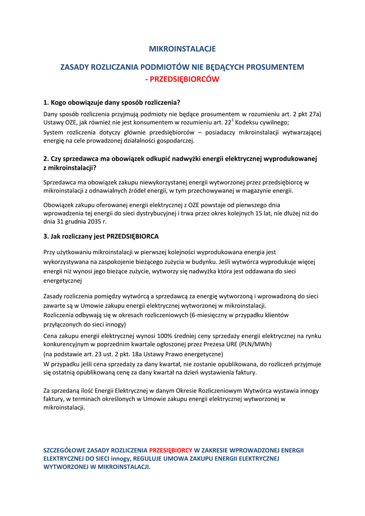 MIKROINSTALACJE ZASADY ROZLICZANIA PODMIOTÓW NIE BĘDĄCYCH PROSUMENTEM - PRZEDSIĘBIORCÓW 1. Kogo obowiązuje dany sposób rozliczenia? Dany sposób rozliczenia przyjmują podmioty nie będące prosumentem w rozumieniu art. 2 pkt 27a) Ustawy OZE, jak również nie jest konsumentem w rozumieniu art. 221 Kodeksu cywilnego; System rozliczenia dotyczy głównie przedsiębiorców – posiadaczy mikroinstalacji wytwarzającej energię na cele prowadzonej działalności gospodarczej. 2. Czy sprzedawca ma obowiązek odkupić nadwyżki energii elektrycznej wyprodukowanej z mikroinstalacji? Sprzedawca ma obowiązek zakupu niewykorzystanej energii wytworzonej przez przedsiębiorcę w mikroinstalacji z odnawialnych źródeł energii, w tym przechowywanej w magazynie energii. Obowiązek zakupu oferowanej energii elektrycznej z OZE powstaje od pierwszego dnia wprowadzenia tej energii do sieci dystrybucyjnej i trwa przez okres kolejnych 15 lat, nie dłużej niż do dnia 31 grudnia 2035 r. 3. Jak rozliczany jest PRZEDSIĘBIORCA Przy użytkowaniu mikroinstalacji w pierwszej kolejności wyprodukowana energia jest wykorzystywana na zaspokojenie bieżącego zużycia w budynku. Jeśli wytwórca wyprodukuje więcej energii niż wynosi jego bieżące zużycie, wytworzy się nadwyżka która jest oddawana do sieci energetycznej Zasady rozliczenia pomiędzy wytwórcą a sprzedawcą za energię wytworzoną i wprowadzoną do sieci zawarte są w Umowie zakupu energii elektrycznej wytworzonej w mikroinstalacji. Rozliczenia odbywają się w okresach rozliczeniowych (6-miesięczny w przypadku klientów przyłączonych do sieci innogy) Cena zakupu energii elektrycznej wynosi 100% średniej ceny sprzedaży energii elektrycznej na rynku konkurencyjnym w poprzednim kwartale ogłoszonej przez Prezesa URE (PLN/MWh) (na podstawie art. 23 ust. 2 pkt. 18a Ustawy Prawo energetyczne) W przypadku jeśli cena sprzedaży za dany kwartał, nie zostanie opublikowana, do rozliczeń przyjmuje się ostatnią opublikowaną cenę za dany kwartał na dzień wystawienia faktury. Za sprzedaną ilość Energii Elektrycznej w danym Okresie Rozliczeniowym Wytwórca wystawia innogy faktury, w terminach określonych w Umowie zakupu energii elektrycznej wytworzonej w mikroinstalacji. SZCZEGÓŁOWE ZASADY ROZLICZENIA PRZESIĘBIORCY W ZAKRESIE WPROWADZONEJ ENERGII ELEKTRYCZNEJ DO SIECI innogy, REGULUJE UMOWA ZAKUPU ENERGII ELEKTRYCZNEJ WYTWORZONEJ W MIKROINSTALACJI.