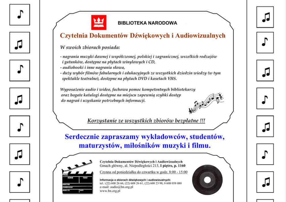 ♪ BIBLIOTEKA NARODOWA Czytelnia Dokumentów Dźwiękowych i Audiowizualnych ♫ ♪ ♫ ♪ W swoich zbiorach posiada: - nagrania muzyki dawnej i współczesnej, polskiej i zagranicznej, wszelkich rodzajów i gatunków, dostępne na płytach winylowych i CD, - audiobooki i inne nagrania słowa, - duży wybór filmów fabularnych i edukacyjnych ze wszystkich dziedzin wiedzy (w tym spektakle teatralne), dostępne na płytach DVD i kasetach VHS. Wyposażenie audio i wideo, fachowa pomoc kompetentnych bibliotekarzy oraz bogate katalogi dostępne na miejscu zapewnią szybki dostęp do nagrań i uzyskanie potrzebnych informacji. Korzystanie ze wszystkich zbiorów bezpłatne !!! ♫ ♪ ♫ ♪ ♫ Serdecznie zapraszamy wykładowców, studentów, maturzystów, miłośników muzyki i filmu. ♫ ♪ Czytelnia Dokumentów Dźwiękowych i Audiowizualnych Gmach główny, al. Niepodległości 213, I piętro, p. 1160 Czynna od poniedziałku do czwartku w godz. 8:00 - 15:00 ♪ Informacja o zbiorach dźwiękowych i audiowizualnych: tel.: (22) 608 26 66, (22) 608 26 61, (22) 608 23 98, 0 608 058 080 e-mail: [email protected] www.bn.org.pl ♫