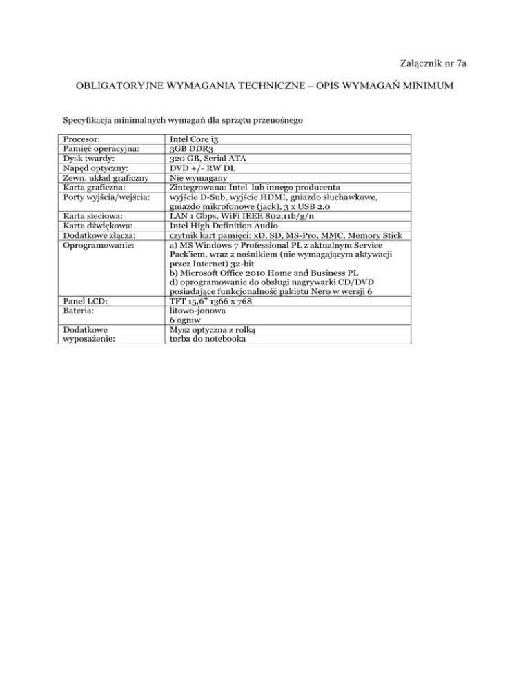 Załącznik nr 7a OBLIGATORYJNE WYMAGANIA TECHNICZNE – OPIS WYMAGAŃ MINIMUM Specyfikacja minimalnych wymagań dla sprzętu przenośnego Procesor: Pamięć operacyjna: Dysk twardy: Napęd optyczny: Zewn. układ graficzny Karta graficzna: Porty wyjścia/wejścia: Karta sieciowa: Karta dźwiękowa: Dodatkowe złącza: Oprogramowanie: Panel LCD: Bateria: Dodatkowe wyposażenie: Intel Core i3 3GB DDR3 320 GB, Serial ATA DVD +/- RW DL Nie wymagany Zintegrowana: Intel lub innego producenta wyjście D-Sub, wyjście HDMI, gniazdo słuchawkowe, gniazdo mikrofonowe (jack), 3 x USB 2.0 LAN 1 Gbps, WiFi IEEE 802,11b/g/n Intel High Definition Audio czytnik kart pamięci: xD, SD, MS-Pro, MMC, Memory Stick a) MS Windows 7 Professional PL z aktualnym Service Pack’iem, wraz z nośnikiem (nie wymagającym aktywacji przez Internet) 32-bit b) Microsoft Office 2010 Home and Business PL d) oprogramowanie do obsługi nagrywarki CD/DVD posiadające funkcjonalność pakietu Nero w wersji 6 TFT 15,6” 1366 x 768 litowo-jonowa 6 ogniw Mysz optyczna z rolką torba do notebooka