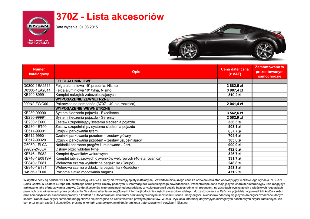 370Z - Lista akcesoriów Data wydania: 01.08.2015 Numer katalogowy D0300-1EA2511 D0300-1EA2611 KE409-89991 999N2-ZWC00 KE230-99990 KE230-99991 KE230-1E000 KE230-1ET00 KE511-99901 KE512-99901 KE512-99920 G6950-1EL0A 999J2-ZV0E4 KE746-1E082 KE746-1E081SV KE840-1E081 KE840-1ET81 H4935-1EL00 Opis FELGI ALUMINIOWE Felga aluminiowa 19" przednia, Nismo Felga aluminiowa 19" tylna, Nismo Komplet nakrętek zabezpieczających WYPOSAŻENIE ZEWNETRZNE Pokrowiec na samochód (370Z - 40-sta rocznica) WYPOSAŻENIE WEWNETRZNE System śledzenia pojazdu - Excellence System śledzenia pojazdu - Serenity Zestaw uzupełniający systemu śledzenia pojazdu Zestaw uzupełniający systemu śledzenia pojazdu Czujniki parkowania tyłem Czujniki parkowania przodem – zestaw główny Czujniki parkowania przodem – zestaw uzupełniający Nakładki ochronne progów iluminowane - 2szt. Osłony przeciwbłotne tylne Komplet dywaników welurowych Komplet jubileuszowych dywaników welurowych (40-sta rocznica) Welurowa czarna wykładzina bagażnika (Coupe) Welurowa czarna wykładzina bagażnika (Roadster) Pozioma siatka mocowania bagażu Cena dateliczna (z VAT) Zamontowano w prezentowanym samochodzie 3 882,5 zł 3 987,4 zł 310,2 zł 2 041,4 zł 3 562,6 zł 2 582,9 zł 356,3 zł 508,1 zł 657,7 zł 704,6 zł 303,6 zł 900,9 zł 492,6 zł 326,7 zł 331,7 zł 248,8 zł 248,8 zł 471,2 zł Wszystkie ceny są podane w PLN oraz zawierają 23% VAT. Ceny nie zawierają opłaty instalacyjnej. Zawartość niniejszego cennika odzwierciedla stan obowiązujący w czasie jego wydania. NISSAN Sales Central & Eastern Europe Kft. zastrzega sobie prawo zmiany podanych tu informacji bez wcześniejszego powiadomienia. Prezentowane dane mają jedynie charakter informacyjny i nie mogą być traktowane jako oferta zawarcia umowy. Co do akcesoriów nieoryginalnych odpowiedzialny z tytułu gwarancji będzie bezpośrednio ich producent, na zasadach wynikających z właściwych regulacjach prawnych oraz określonych przez producenta. W celu uzyskania szczegółowych informacji odnośnie części i akcesoriów zdatnych do zastosowania w Państwa pojeździe, odpowiednich kodów części oraz kompatybilności akcesoriów prosimy o kontakt z autoryzowanymi dealerami oraz autoryzowanymi serwisami Nissana. Ceny części i akcesoriów odnoszą się jedynie do części oznaczonej danym kodem. Dodatkowe części zamienne mogą okazać się niezbędne do zainstalowania pewnych produktów. W celu uzyskania informacji dotyczących niezbędnych dodatkowych części zamiennych, ich cen oraz innych części i akcesoriów, prosimy o kontakt z autoryzowanymi dealerami oraz autoryzowanymi serwisami Nissana.