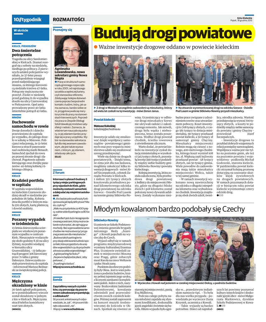10//tygodnik ROZMAITOŚCI W skrócie Poznajmy się Dwoje dorosłych i dziecko przewieziono do szpitala po wypadku, do jakiego doszło w sobotę w Mniowie. Policjanci relacjonują, że 51-letni kierowca stracił panowanie nad osobówką marki Renault. Samochód zjechał do rowu po prawej stronie drogi i dachował. Pogotowie zabrało kierującego oraz dwójkę pasażerów: 40-letnią kobietę i 6letniego chłopca. (ELLE) Z forum KIELCE Kradzież portfela w szpitalu W szpitalu wojewódzkim na kieleckim Czarnowie złodziej okradł w niedzielne popołudnie 26-latkę. Kobieta straciła portfel w którym miała 220 złotych, kartę płatniczą i dowód osobisty. KIELCE Poranny wypadek w śródmieściu 13-letnia dziewczynka ucierpiała we wtorkowym porannym wypadku w centrum Kielc. Nieszczęście wydarzyło się około godziny 8.30 na ulicy Żytniej, na jezdni wiodącej w kierunku ulicy Grunwaldzkiej. - 13-latkę potrącił peugeot 306 kierowany przez 71-latka z gminy Daleszyce. Dziewczynka została przewieziona do szpitala - informował Mariusz Bednarski ze świętokrzyskiej policji. KIELCE Mężczyzna okradziony w kinie 20-latek zgłosił policjantom, że w poniedziałkowy wieczór został okradziony w jednym z kin w Kielcach. Mężczyzna stracił telefon komórkowy wart 500 złotych. (MINOS) Internauci o planach budowy 3 tysięcy miejsc parkingowych przy wjazdach do Kielc, gdzie można by zostawić samochód, a dalej udać się miejskimi autobusami: A „Kto będzie pokrywał koszty funkcjonowania jak będą deficytowe? Miasto, czyli my?” „Mało mu przystanków za 400 tysięcy, walnie sobie 8 parkingów za 80 baniek”. „W osiedlach jest dużo niezagospodarowanej przestrzeni, którą można ciekawie wykorzystać, ale zajmują ją samochody. Bez wyprowadzenia samochodów nie można stworzyć przyjaznej przestrzeni dla mieszkańców”. „Budowa takich parkingów to przy okazji odstraszanie ludności spoza Kielc,która przyjeżdża tu do urzędów wojewódzkich czy do przychodni zdrowia szczebla wojewódzkiego”. „A gdzie parking Na Stoku?” „Na pewno będą ludzie płacić, żeby parkować....” „Te parkingi to bzdura”. Więcej na www.echodnia.eu Sonda Zapytaliśmy naszych czytelników, czy poruszając się poza terenem zabudowanym pamiętają o odblaskach? 56 procent ankietowanych odpowiedziało, że „tak”, 44 procent kliknęło odpowiedź „nie”. Więcej na www.echodnia.eu FOT. ARCHIWUM STAROSTWA POWIATOWEGO a Pracę w strukturach samorządu gminnego rozpoczęła w roku 2001, od najniższego szczebla urzędniczej kariery, czyli stanowiska referenta. Zdobywając kolejne doświadczenia poprzez bezpośredni kontakt z ludźmi, który, jak sama zaznacza, bardzo sobie ceni, przygotowywała się merytorycznie do pracy na stanowiskach kierowniczych. Poprzednia praca w Zespole Obsługi Szkół dawała jej mnóstwo satysfakcji i radości. Zaznacza, że właśnie tam nauczyła się pokory, co jej zdaniem bardzo przydaje się w pracy urzędnika. Wybór na stanowisko sekretarza był dla niej awansem zawodowym, ale jest także wyzwaniem, z którym, jej zdaniem, składa się całe życie. b Z drogi w Mostach szczególnie zadowoleni są mieszkańcy, którzy od wielu lat czekali na tę inwestycję - mówi Zenon Janus. Powiat kielecki Mateusz Kołodziej [email protected] Inwestycje udało się zrealizować dzięki współpracy samorządów - powiatowego i gminnych oraz przy wsparciu ministerstwa udało się zrealizować szereg przedsięwzięć. Wiele się dzieje na drogach powiatowych. - Dzięki temu, że zima jest dla nas łaskawa, mogliśmy zakończyć kilka inwestycji drogowych - mówi Józef Szczepańczyk, członek Zarządu Powiatu w Kielcach. 1 milion 321 tysięcy złotych kosztowała przebudowa ponad kilometrowego odcinka drogi powiatowej na odcinku Szewce - Osiedle Pod Lasem na terenie gminy Sitkówka-No- winy. Uczestniczący w odbiorze drogi mieszkańcy Szewc nie ukrywali radości z zakończonego remontu. Jak mówili, droga była wąska i niebezpieczna, teraz została poszerzona. Wzdłuż drogi powstał chodnik, ścieżka rowerowa z oświetleniem ulicznym. Warto dodać, że powiat kielecki na inwestycje zyskał dotację ministerialną w wysokości 545 tysięcy złotych, pozostałą kwotę (390 tysięcy) podzieliły między siebie budżety gminy Sitkówka-Nowiny i powiatu kieleckiego. Kolejną inwestycją, która została zakończona, była przebudowa drogi powiatowej z Jedlnicy do miejscowości Mosty, gdzie na długości blisko dwóch i pół kilometra został położony nowy dywanik asfaltowy. Zostały wykonane niez- b Na otwarcie wyremontowanej drogi na odcinku Szewce - Osiedle Pod Lasem w gminie Sitkówka-Nowiny przyszli mieszkańcy. będne prace związane z udrożnieniem rowów oraz utwardzeniem poboczy. Koszt inwestycji to 708 tysięcy złotych, z czego 561 tysięcy to dotacja ministerialna, 90 tysięcy przekazał powiat kielecki, a 50 tysięcy zł samorząd gminy Chęciny. Mieszkańcy miejscowości Bolmin mogą się cieszyć z nowego, 400-metrowego chodnika, którego koszt wyniósł 108 tys. zł. Większą część tej kwoty przekazał powiat - 58 tysięcy złotych, zaś 50 tysięcy gmina. Wiele powodów do zadowolenia mają także mieszkańcy miejscowości Wolica, także w tej samej gminie. - W ramach inwestycji wykonano nową nawierzchnię na odcinku o długości niespełna kilometra oraz wybudowano chodnik. Inwestycja znajduje się obok dwóch szkół, świet- licy, ośrodka zdrowia. Wartość przedsięwzięcia wynosi 700 tysięcy złotych, a koszty te podzieliły między siebie samorządy powiatu i gminy Chęciny powiedział Józef Szczepańczyk. - Inwestycje drogowe to przykład dobrych wzajemnych relacji pomiędzy samorządami. Współpraca ważna jest nie tylko na poziomie gmin, ale też na poziomie powiatu i województwa - podkreśla Michał Godowski, starosta kielecki. W październiku powiat kielecki otrzymał kolejną promesę dotacyjną na usuwanie skutków kl